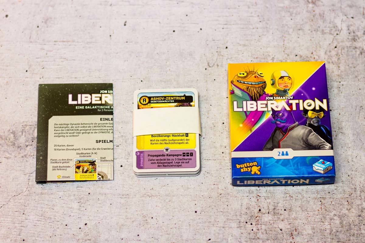 Das winzige BUTTON SHY Spiel LIBERATION ist bei FROSTED GAMES erschienen. Es ist ein Spiel für zwei Spielende, das eine Spielzeit von 30 Minuten bietet. Das Spiel von JON SIMANTOV ist 2018 erstmals erschienen. Der UVP liegt bei 9,95 €.