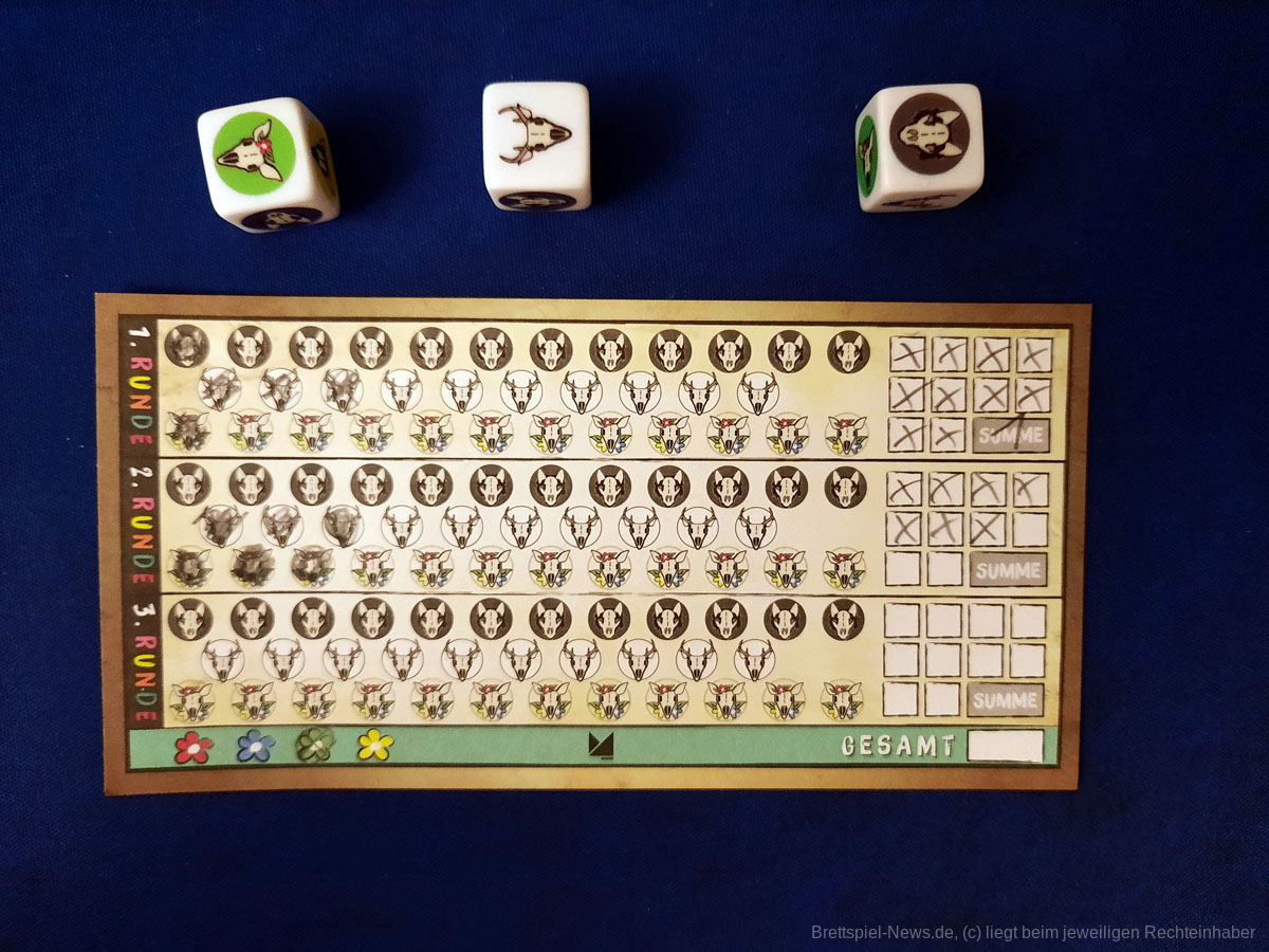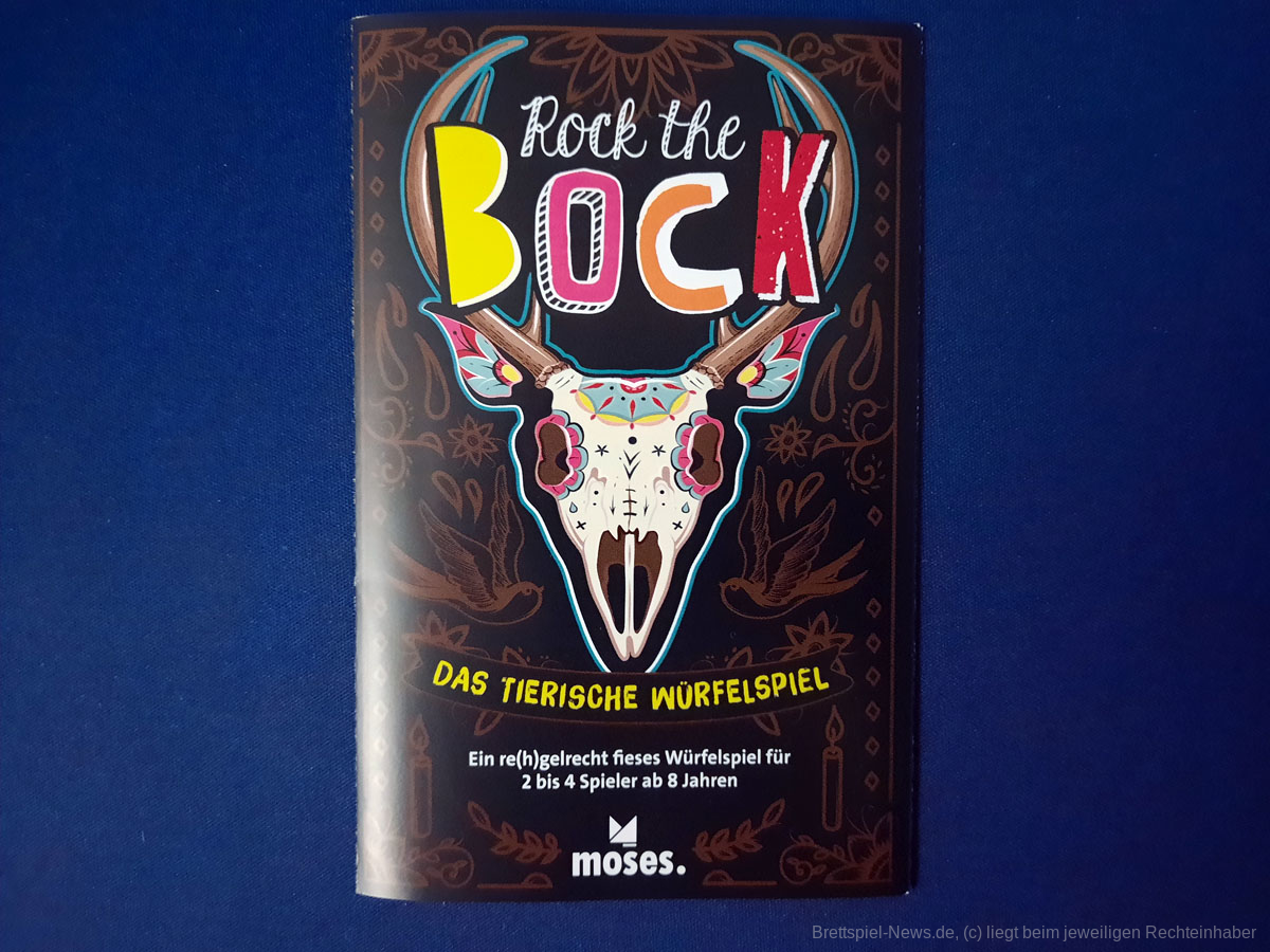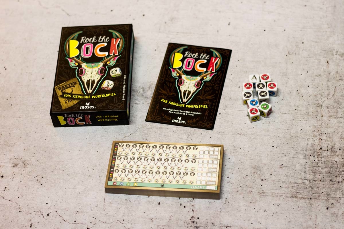 Mit ROCK THE BOCK ist beim moses. Verlag ein kleines Würfelspiel erschienen. Das richtet sich an 2-4 Spielende ab 8 Jahren. Die Spielzeit wird mit 15 Minuten angegeben. Genau genommen handelt es sich bei ROCK THE BOCK um ein Roll & Write-Spiel, mit einer abnehmenden Zahl an Würfeln.