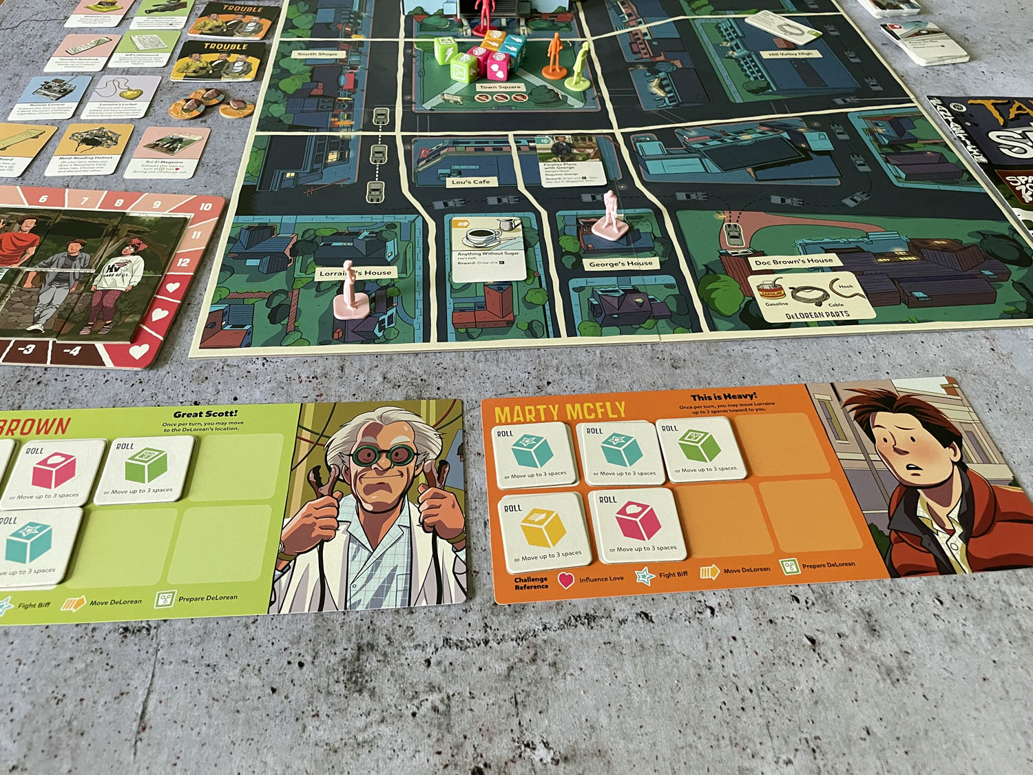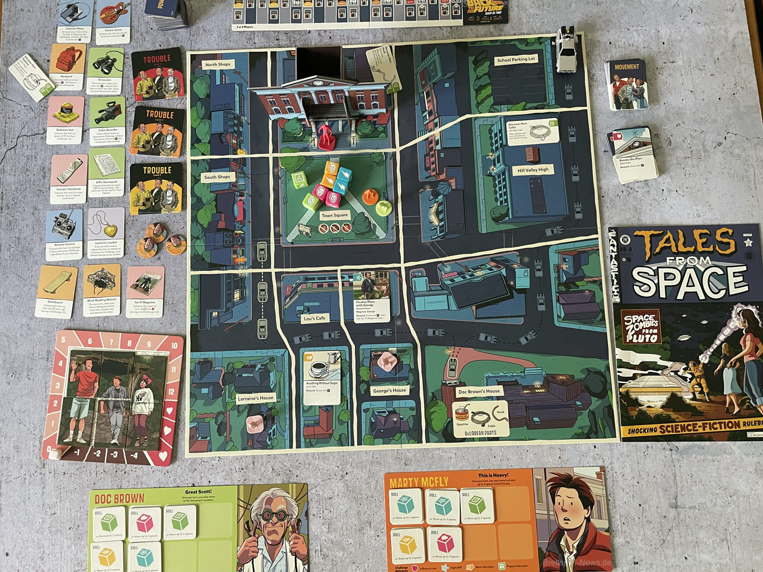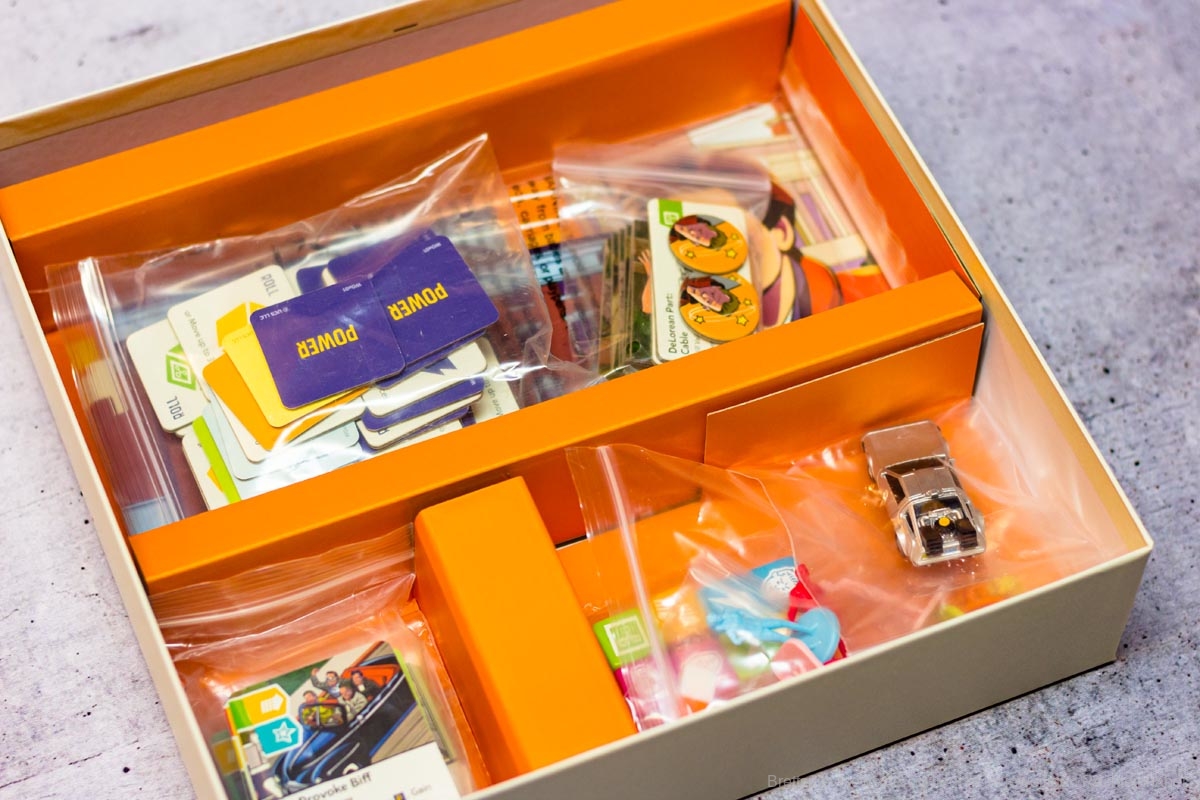 Die Filme Zurück in die Zukunft gehören bis heute zu den Klassikern der Filmgeschichte, also Argument genug sich auch das Brettspiel mal anzuschauen. Das Spielmaterial ist gemessen am Preis wirklich üppig. Auf Amazon.de lässt sich das Spiel für gerade einmal 36 € kaufen und bietet ein ordentliches Spielmaterial - sowohl bei der Grafik als auch bei dem bereits sortiertem Spielmaterial. Ausstanzen ist hier überflüssig, alle Materialien sind bereits in Beutel sortiert.