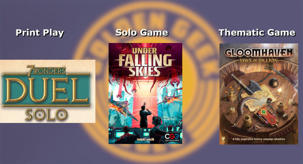 Das beste Solospiel (SOLO GAME) ist laut den BoardGameGeek Usern das Würfelspiel UNDER FALLING SKIES von Tomáš Uhlíř. GLOOMHAVEN: DIE PRANKEN DES LÖWEN und DIE VERLORENEN RUINEN VON ARNAK erreichten die Plätze zwei und drei.