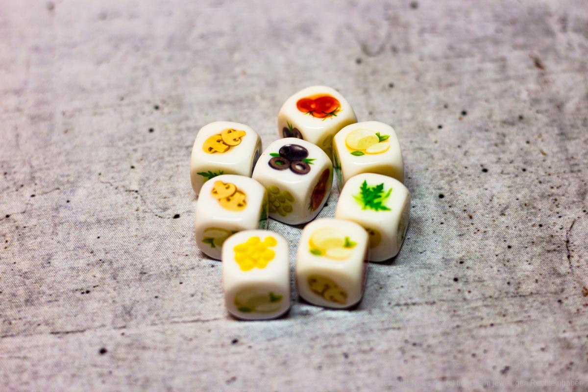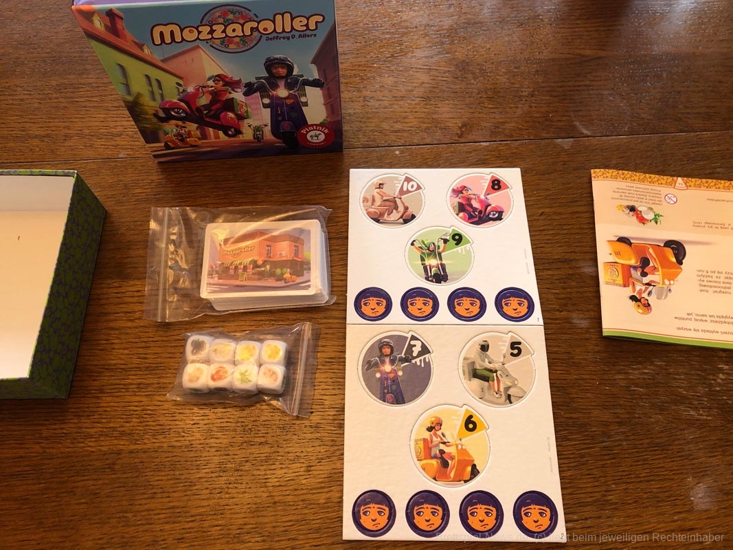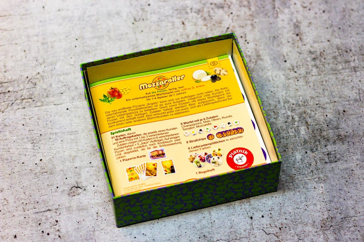 Das Würfelspiel MOZZAROLLER des Autors JEFFREY D. ALLERS (NEW YORK SLICE, PANDORIA, NEW AMSTERDAM) ist bei PIATNIK erschienen. Es richtet sich an 1-4 Spielende ab 7 Jahren und besonders an Familien. Die Spieldauer wird vom Verlag mit 25 Minuten angegeben, der Preis liegt bei ca. 11 Euro.