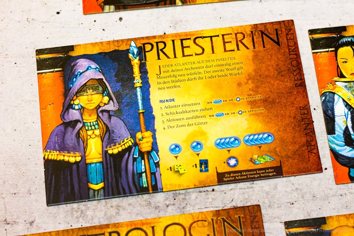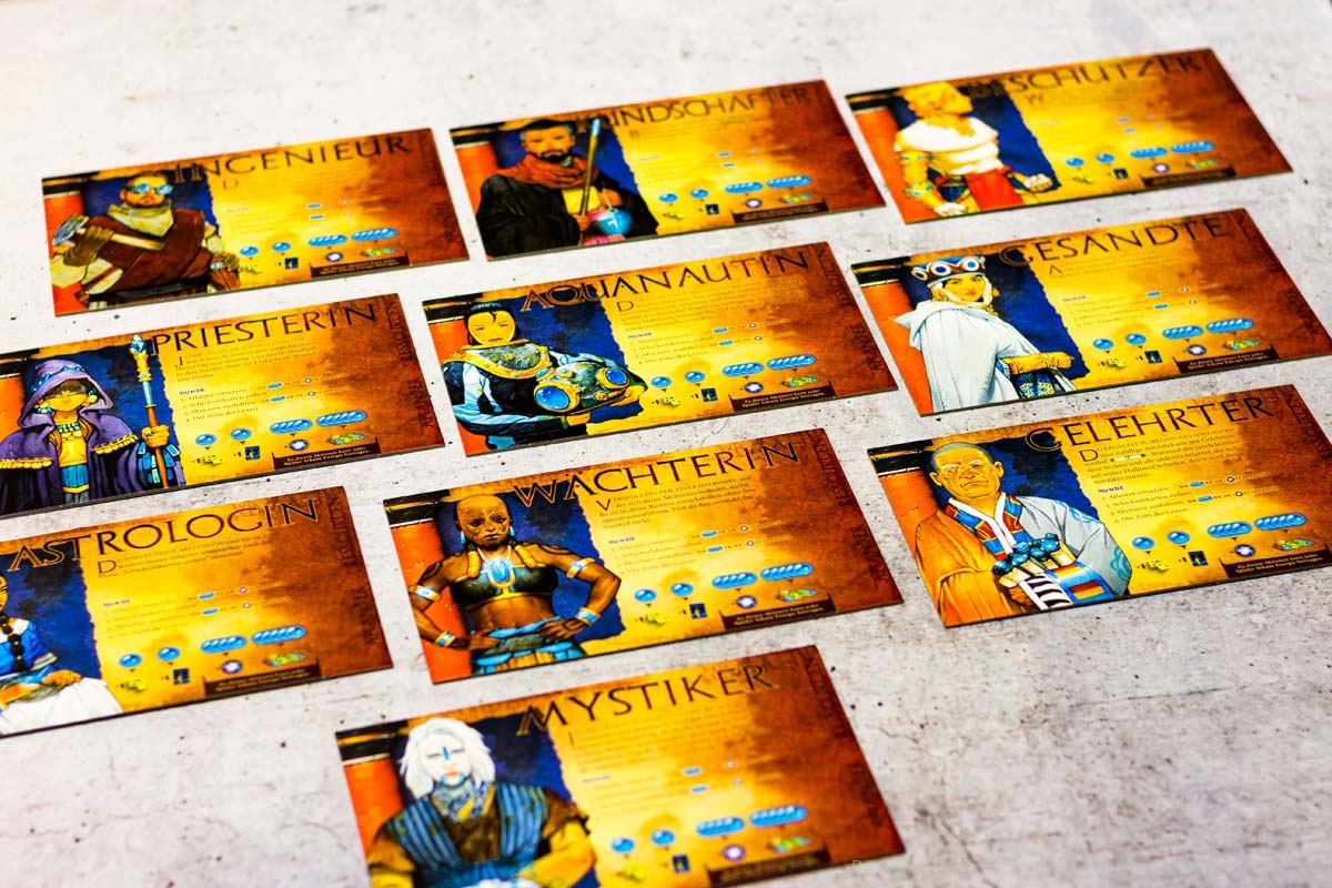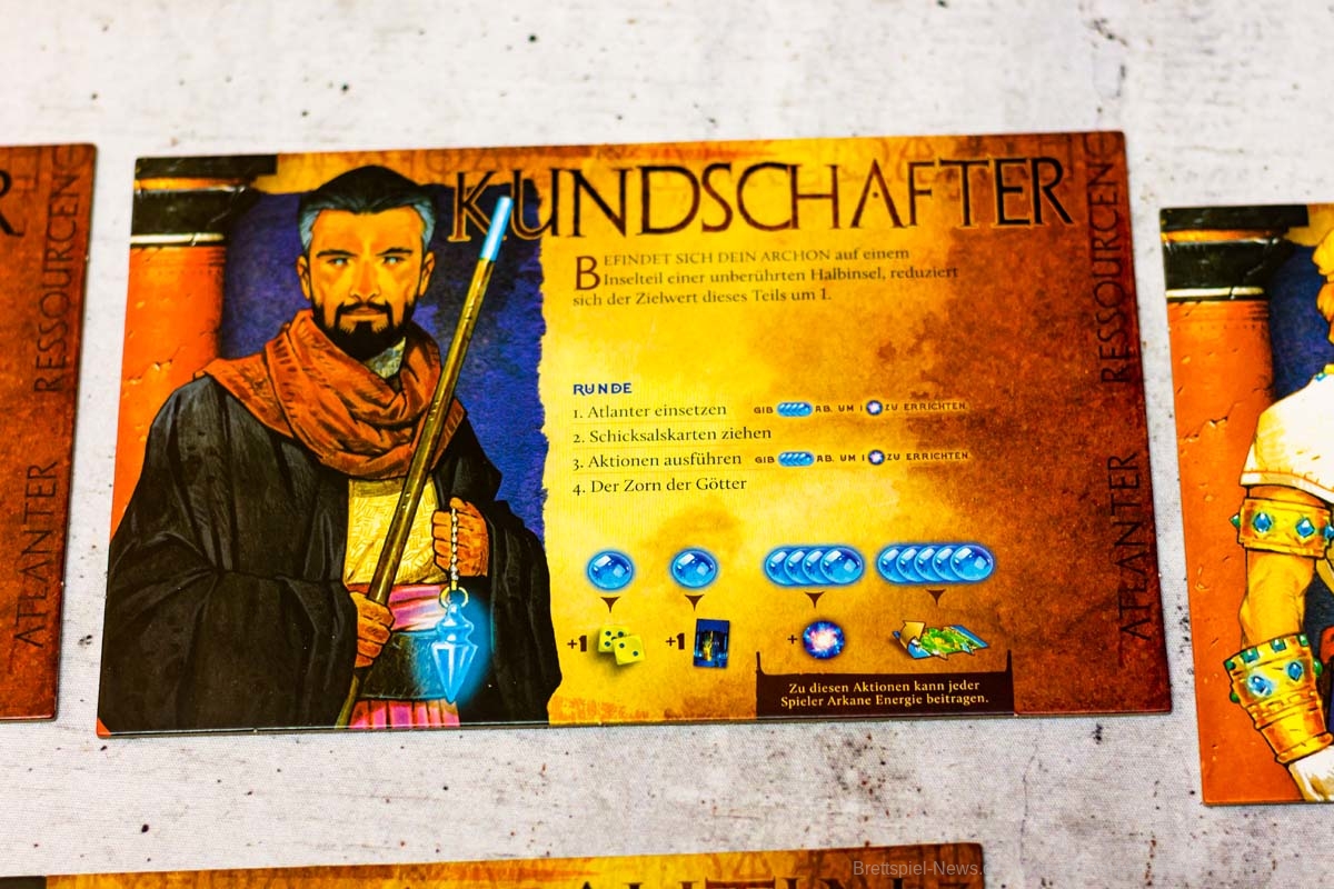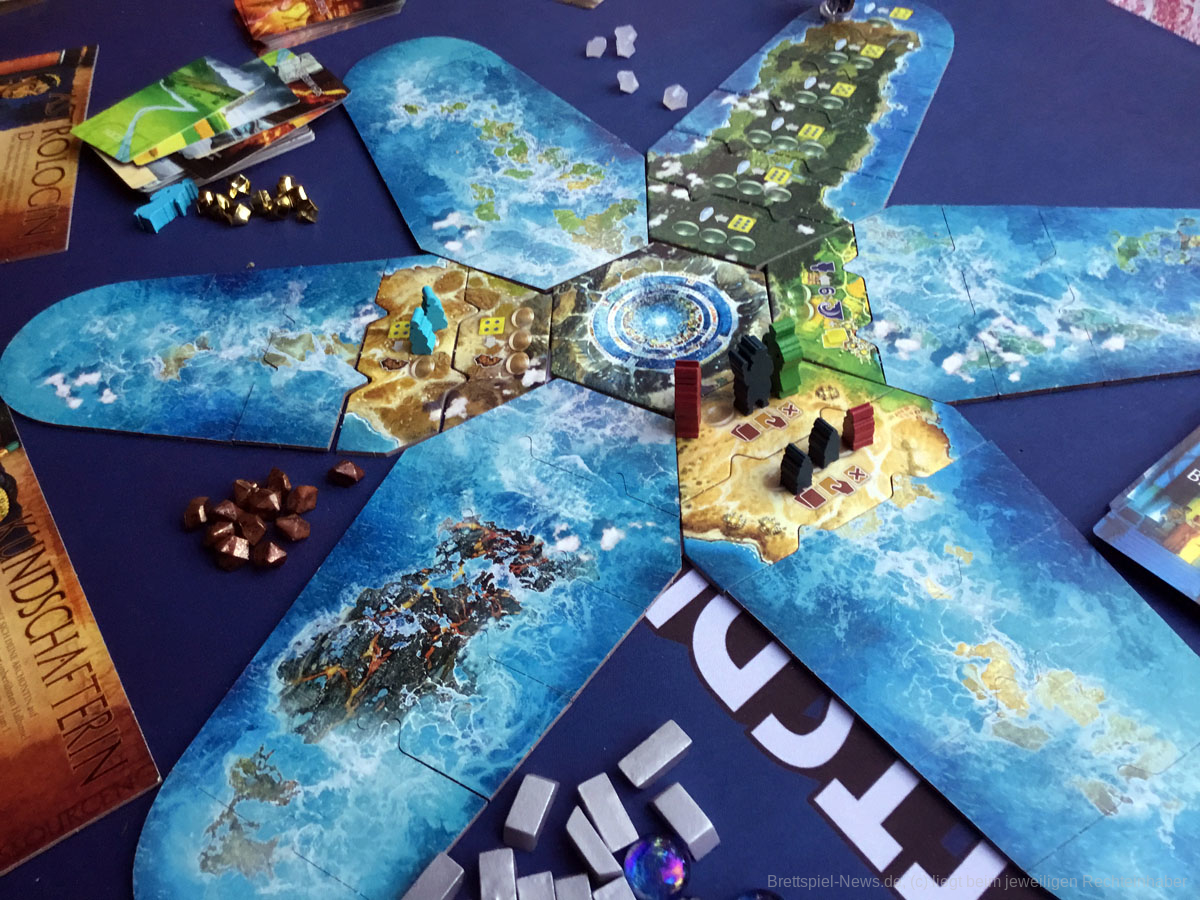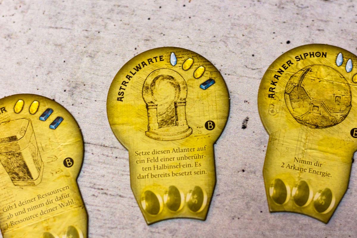 Unterstützt werdet ihr bei eurer Aufgabe von den Anführern der verschiedenen Stämme auf Atlantis, von denen jeder eine Spezialfähigkeit besitzt. Zusätzlich bieten die Bestandteile des Kosmischen Tors, sobald sie einmal errichtet sind, neue Workerplacement-Plätze, an die ihr eure Arbeiter entsenden könnt, um Aktionen zur Rettung der Insel zu nutzen.