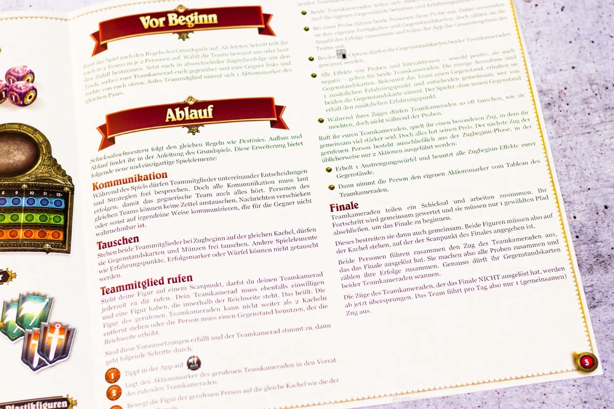 Wer DESTINIES gerne zu viert spielen möchte braucht die Erweiterung SCHICKSALSSCHWESTERN. Diese erweitert das Spielmaterial für vier Spielende und ermöglicht das Spielen in zwei Teams. Ansonsten ist der Schicksalsschwestern-Modus, den die APP zur Verfügung stellt, nicht spielbar.