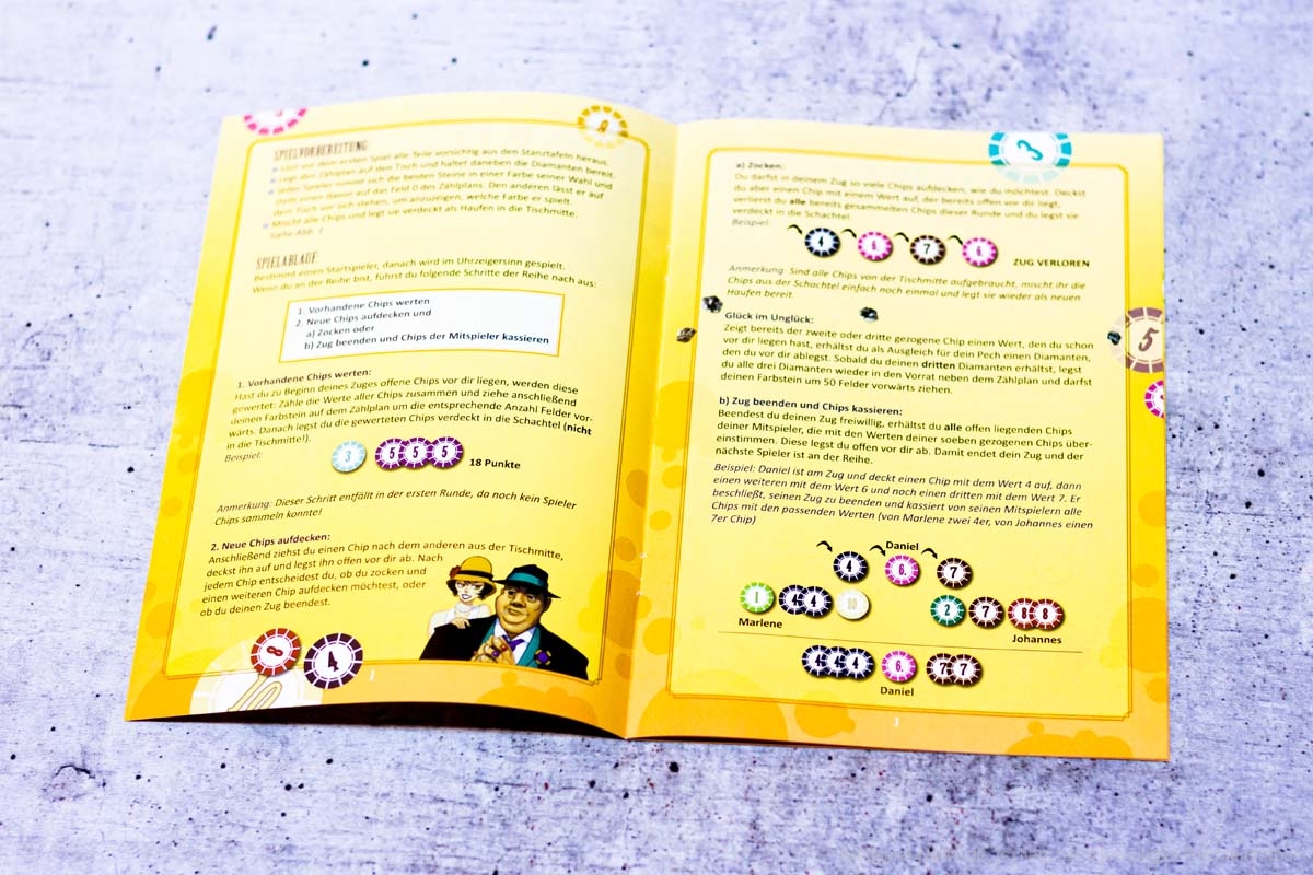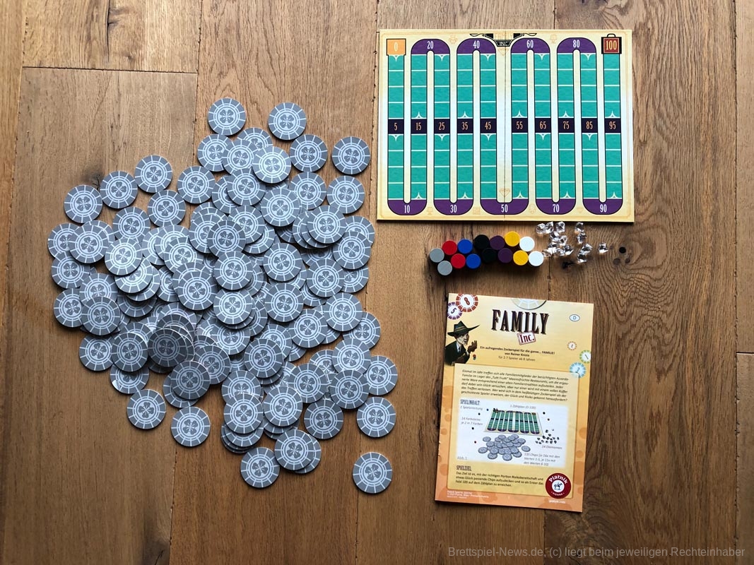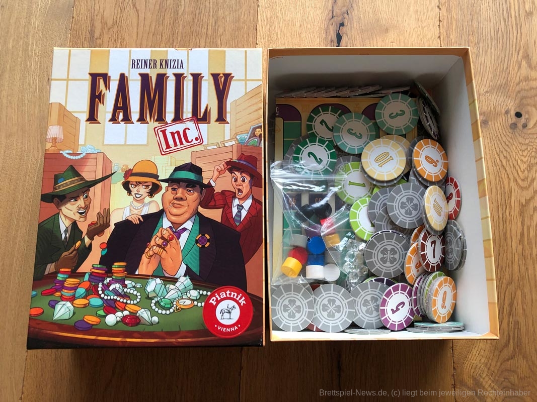 Belohnt werden bei „Family Inc." in erster Linie die wagemutigsten Spieler. Die Regeln, rund um das Aufdecken von Chips mit unterschiedlichen Werten, sind schnell erklärt und schon beginnt die Zockerrunde, bei der sich bis zu sieben Spieler ab acht Jahren die Beute streitig machen. Je größer die Runde dabei ist, umso spannender gestaltet sich der Verteilungskampf. Ziel des Spiels ist, als Erster das Feld 100 auf dem Zählplan zu erreichen und sich so den Löwenanteil der Gaunerware zu sichern. Ob jemand dabei auf Risiko spielt oder seinen Zug bereits nach kurzer Zeit beendet, kann in jeder Runde neu entschieden werden. Ist Fortuna wohlgesonnen, lassen sich Chips der Mitspieler einkassieren, was ein schnelleres Vorrücken zur Folge hat. Wer sein Glück allerdings zu sehr herausfordert, gerät schnell ins Hintertreffen und verliert seine Beute. Aber natürlich hält eine Familie auch zusammen und dann zeigt sie ein Herz für ihre vom Pech verfolgten Mitglieder: Mithilfe von Diamanten finden sich diese zuweilen plötzlich auf der Gewinnerstraße wieder.