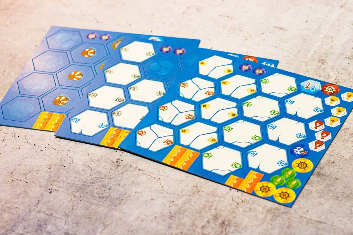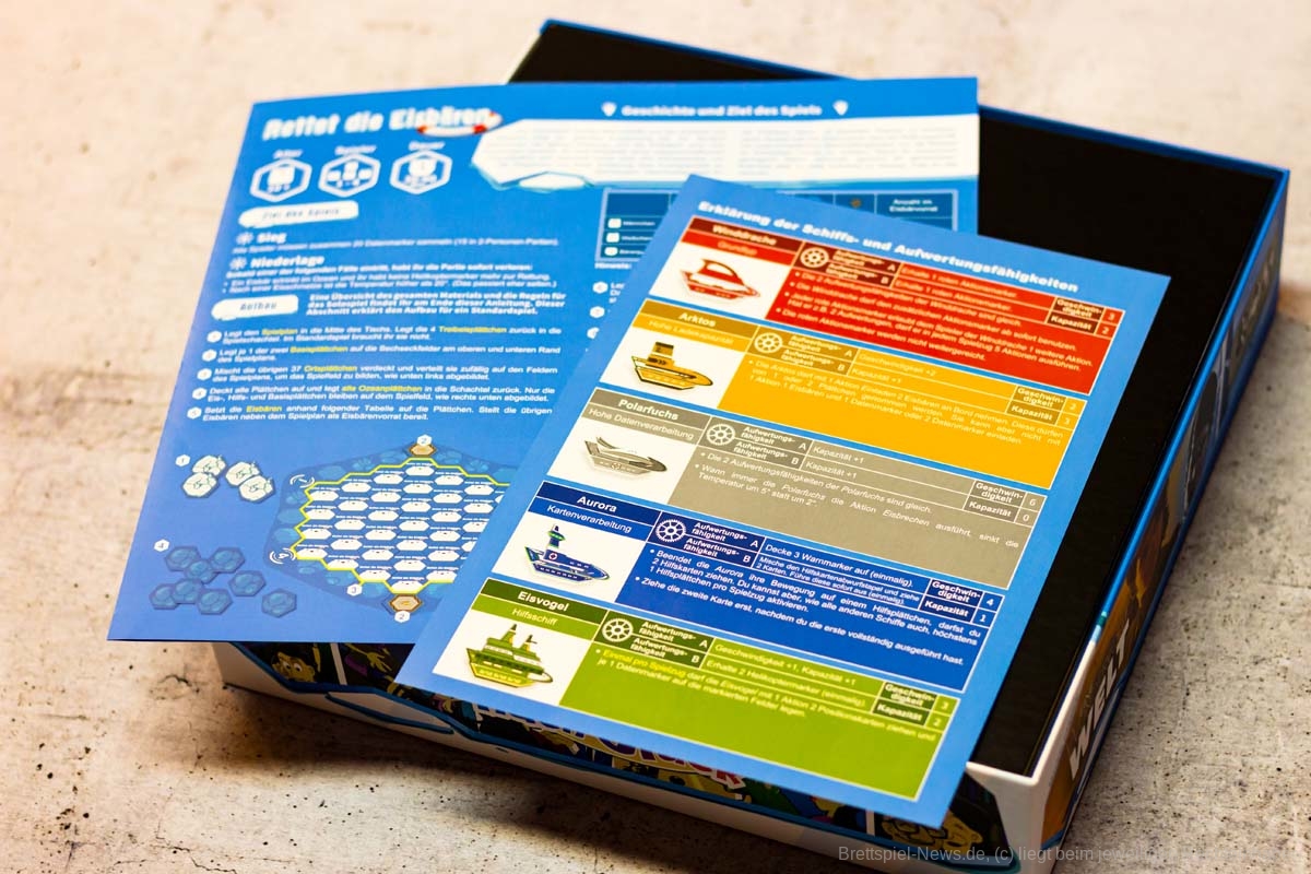 Das Familienspiel RETTET DIE EISBÄREN richtet sich an 1-4 Spielende und ist beim KOBOLD VERLAG erschienen. Besonders auffallend ist die hohe Produktionsqualität, die für 50 € geliefert wird. Die übersichtliche Grafik, die Tableaus und vor allem die Eisbärenmarker sind sehr gelungen.
