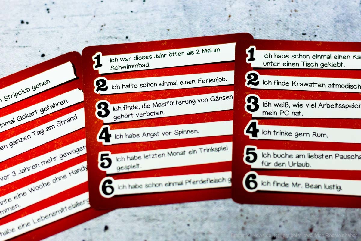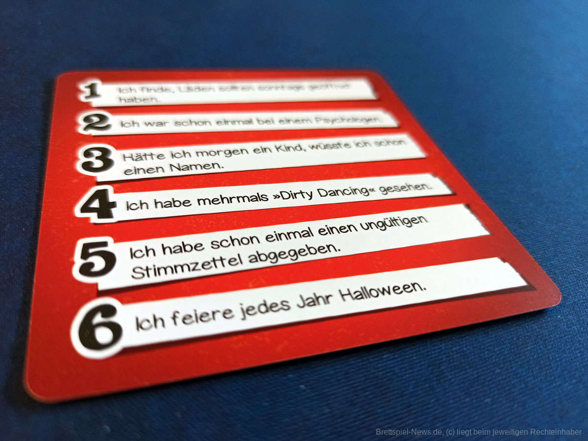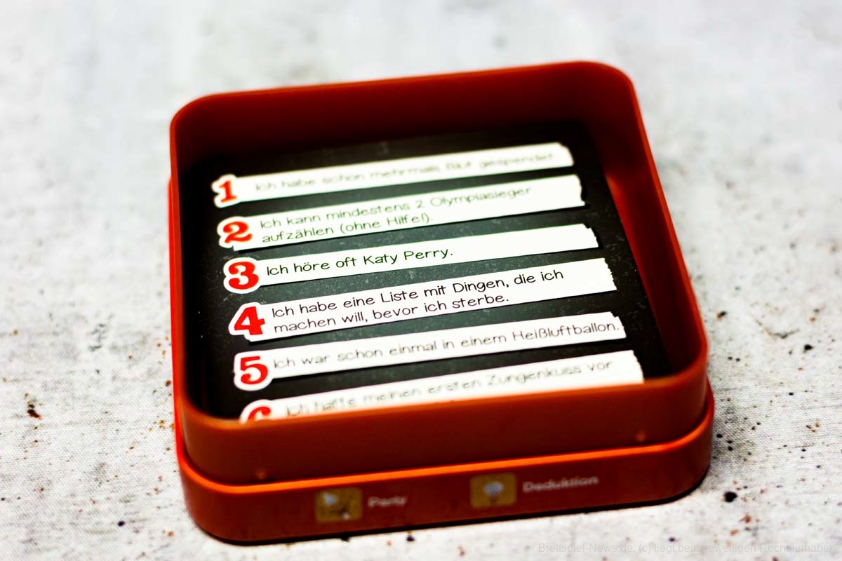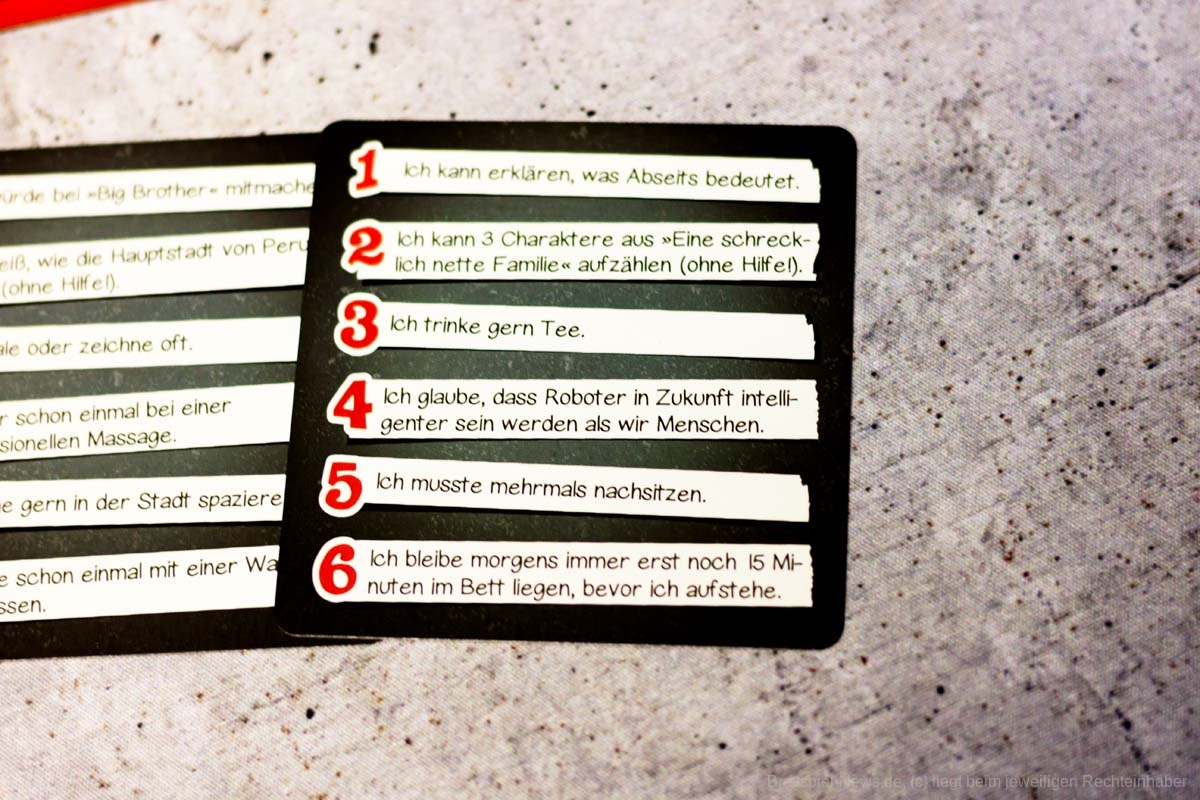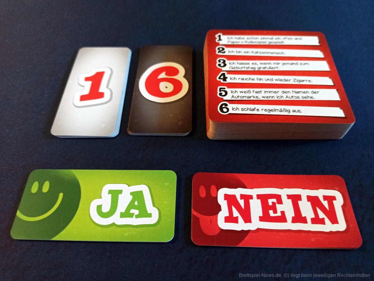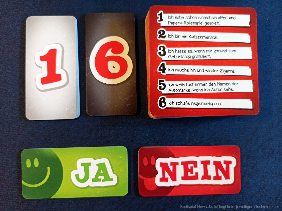Wer draußen gewartet hat, darf wieder hereinkommen. Die Person nimmt sich die Enthüllungskarte, liest die sechs Aussagen darauf vor und überlegt anhand der ausliegenden Ja/Nein-Karten laut, welche die Mitspielenden gewählt haben könnten.