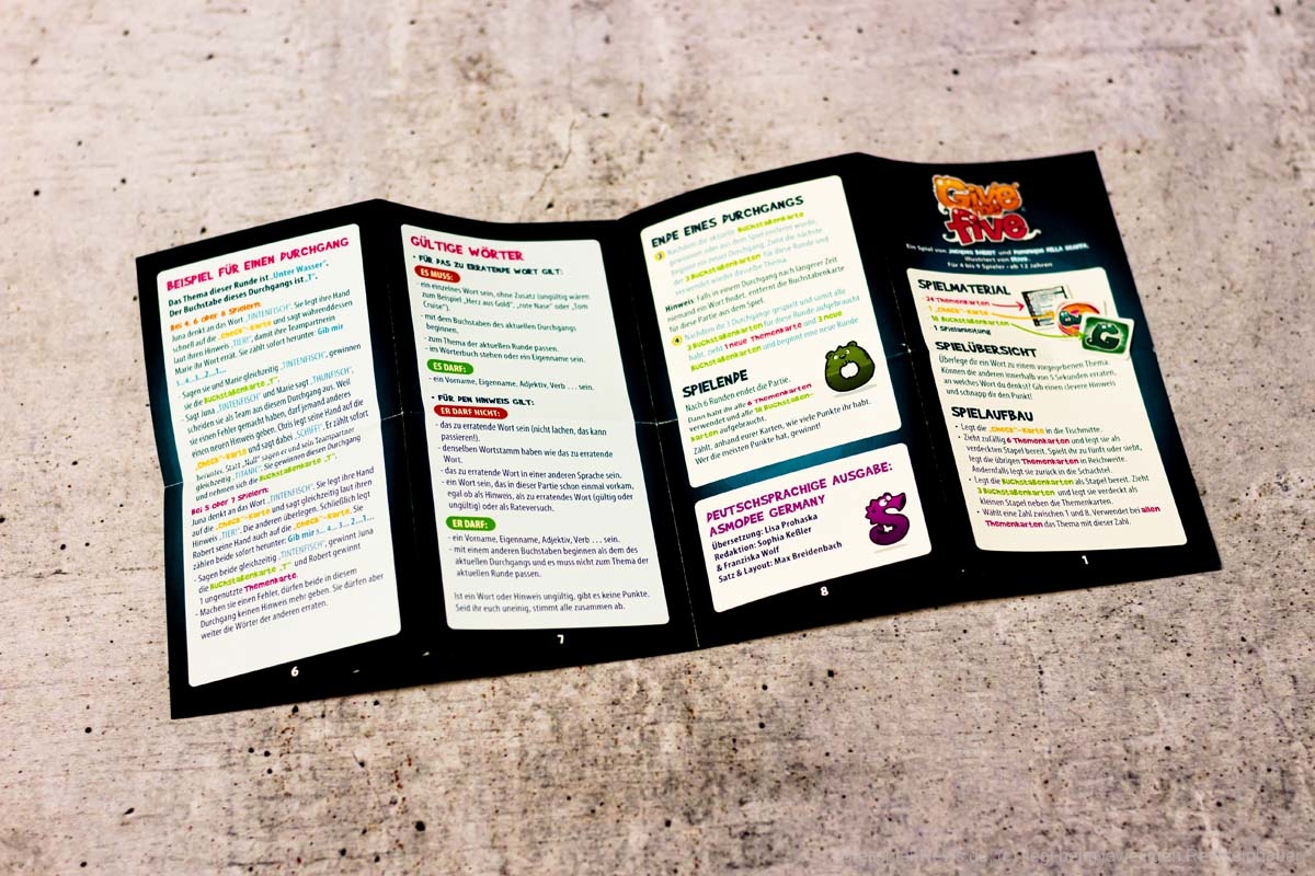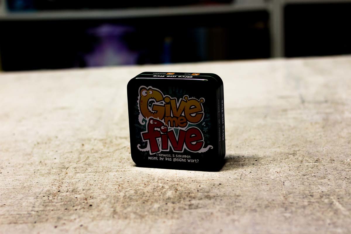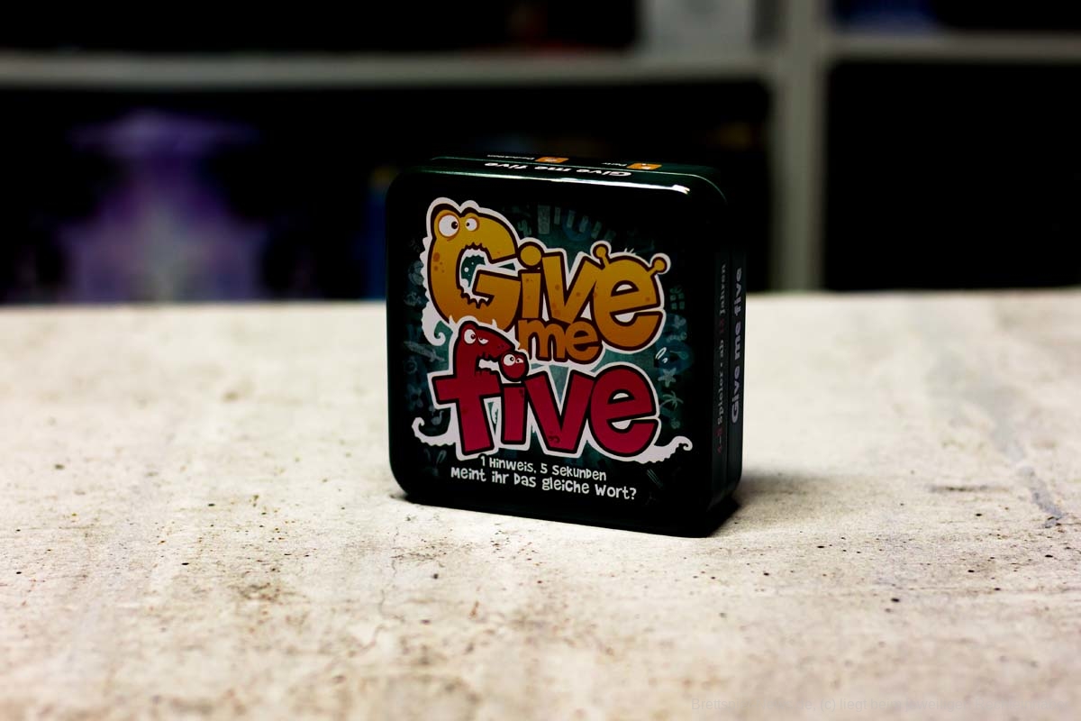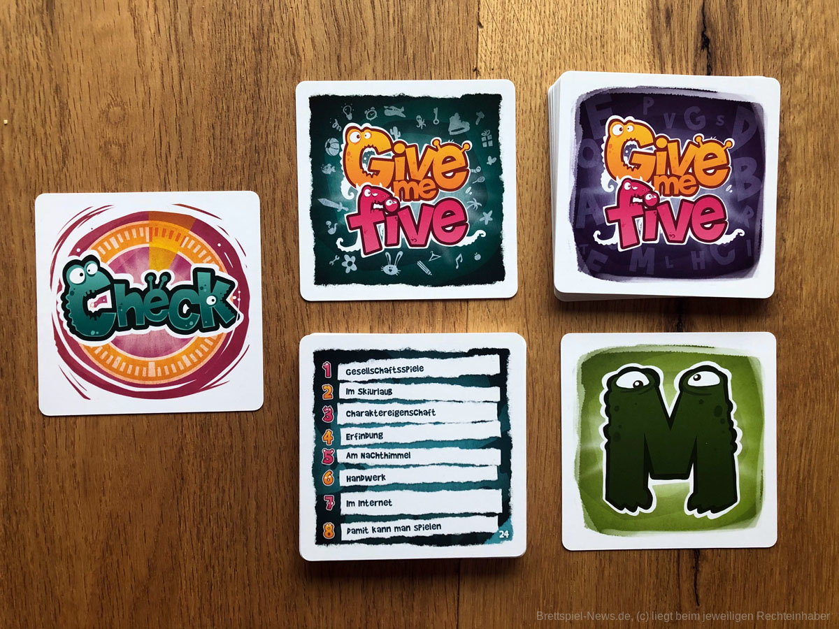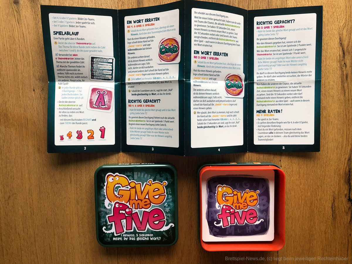 Bei Give me five stellen sich die Spielenden Wörter zu einem Thema vor, die mit einem bestimmten Buchstaben beginnen, und lassen sie ihre Teampartner:innen innerhalb von fünf Sekunden erraten. Sind sie auf der gleichen Wellenlänge, gibt es weniger Missverständnisse.