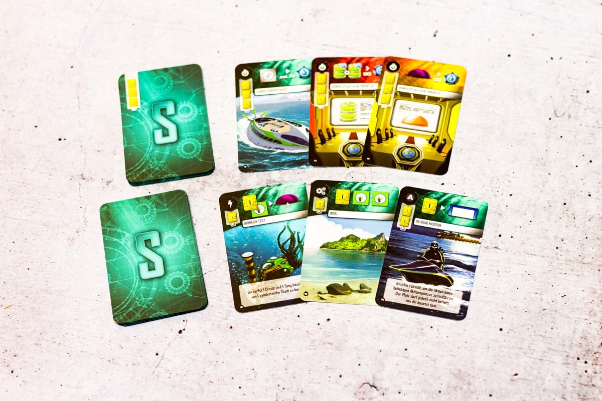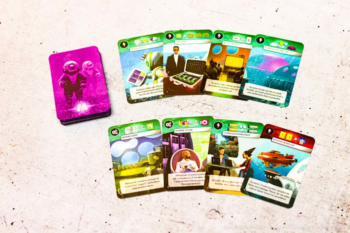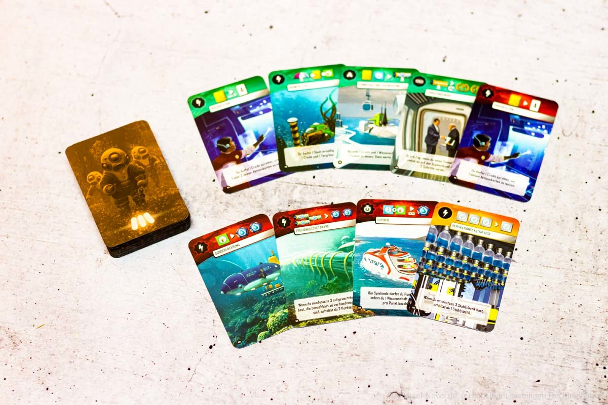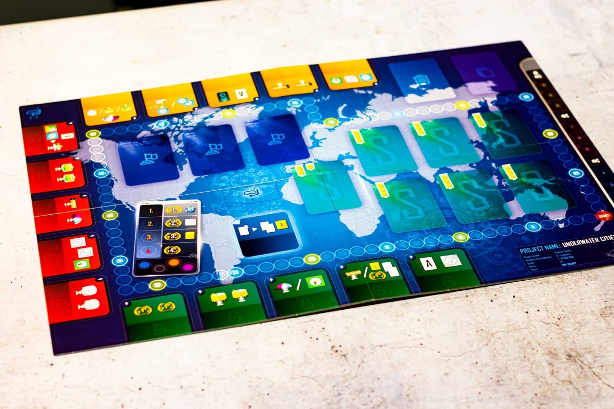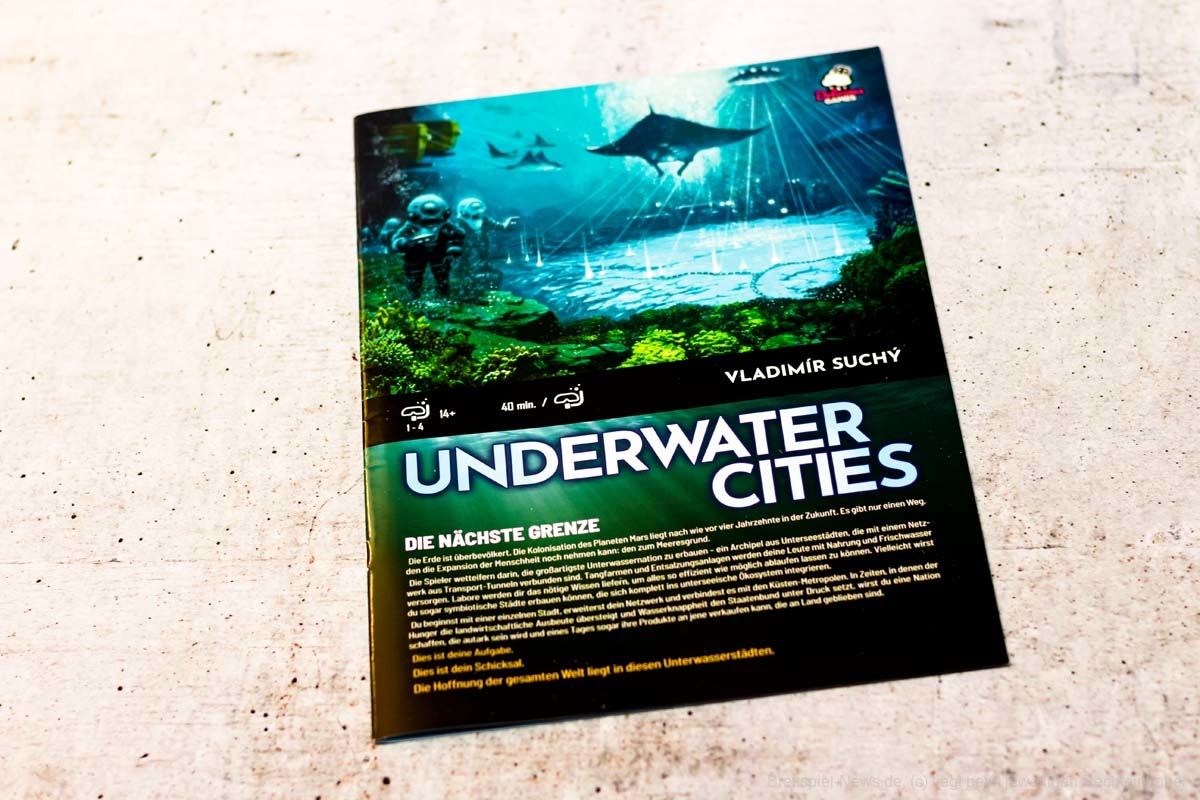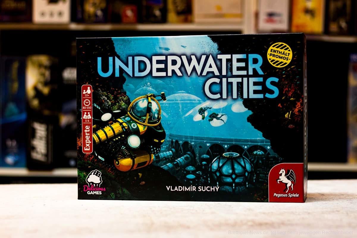 In UNDERWATER CITIES sammeln ein bis vier Spielende ab zwölf Jahren Ressourcen, um der Menschheit einen Ausweg aus der Überbevölkerung der Metropolen zu ermöglichen. Ein Leben unter Wasser und der Bau neuer symbiotischer Städte am Meeresgrund sind der Hoffnungsschimmer der Welt. Gespielt wird über eine feste Rundenanzahl mit einem Kartenmechanismus, bei dem in jeder Runde zwei Aktionen gewählt werden können. Diese Aktionen erzeugen Ressourcen und geben Punkte. Wer die eigenen Karten geschickt an die farblich passenden Aktionen auf dem Spielplan anzulegen weiß, kann stets noch einen besonderen Effekt ausführen. Ziel ist es, Unterwasserstädte zu bauen, diese durch ein Transportnetzwerk zu verbinden und mit diversen Einrichtungen zu versorgen.