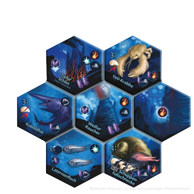 In SCHLOTE DER TIEFE bauen die Spieler:innen schrittweise ein einzigartiges hydrothermales Ökosystem in den Tiefen des Ozeans auf. Jede Runde werden geologische Besonderheite oder neue Lebewesen hinzugefügt. Im Kampf ums Überleben in den unbarmherzigen Tiefen müssen sie mit einer Vielzahl an seltsamen und tödlichen Raubtieren benachbarte Systeme ausbeuten.