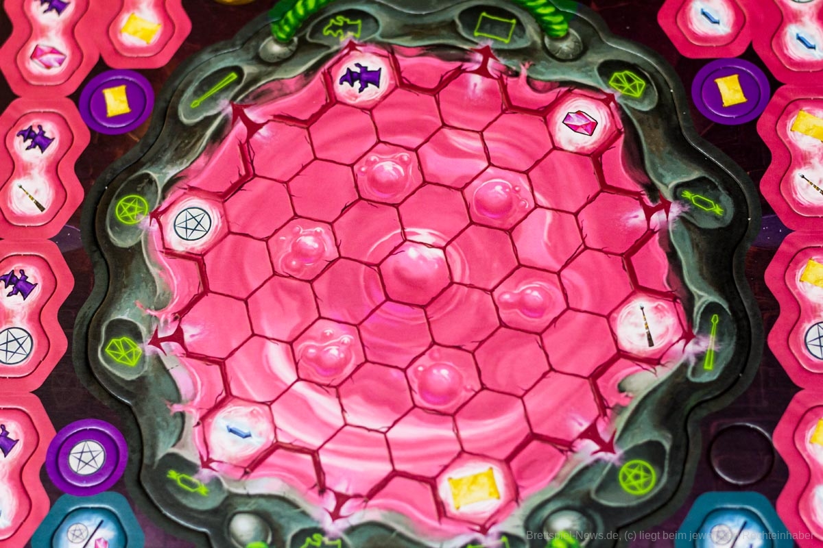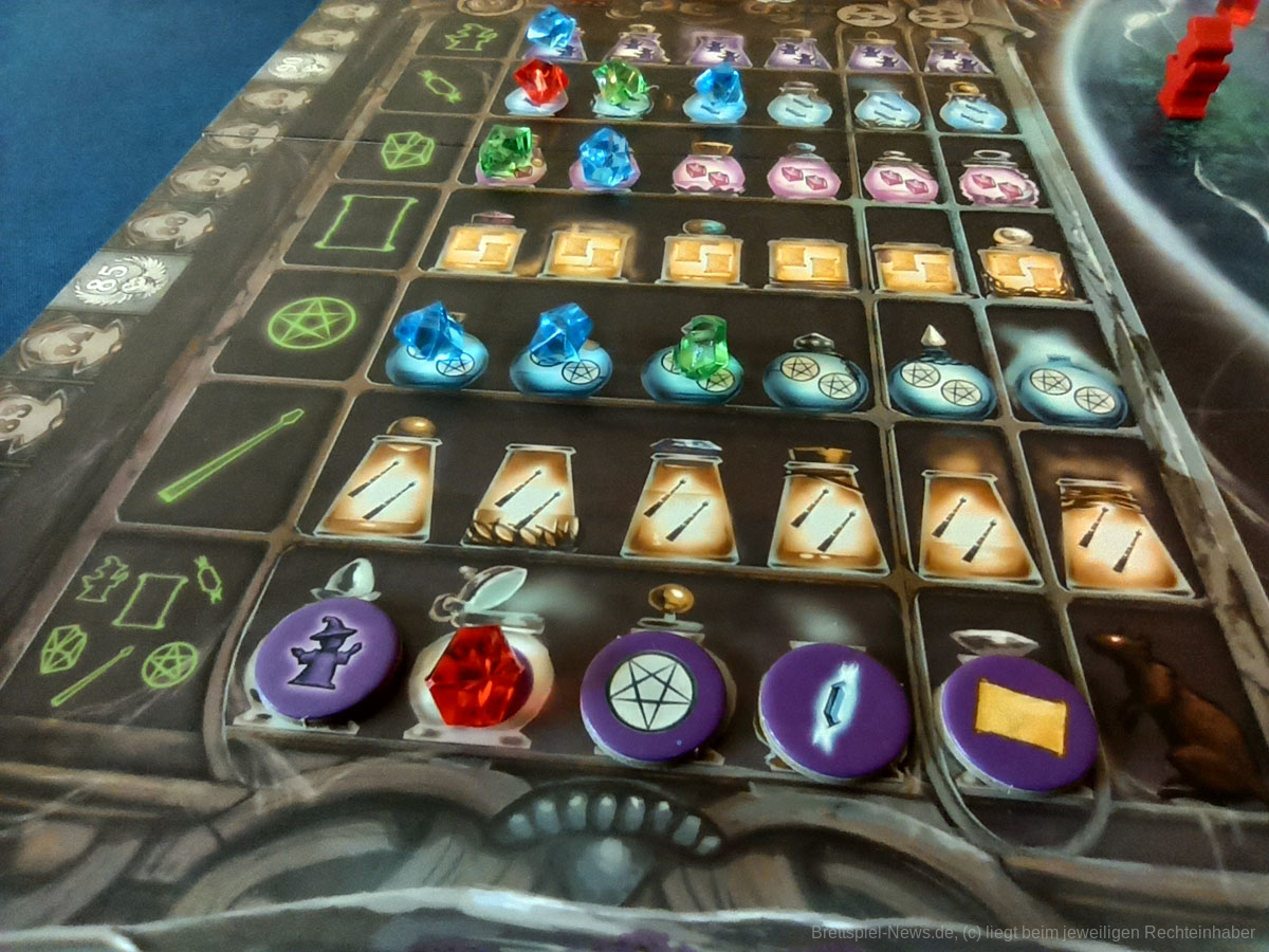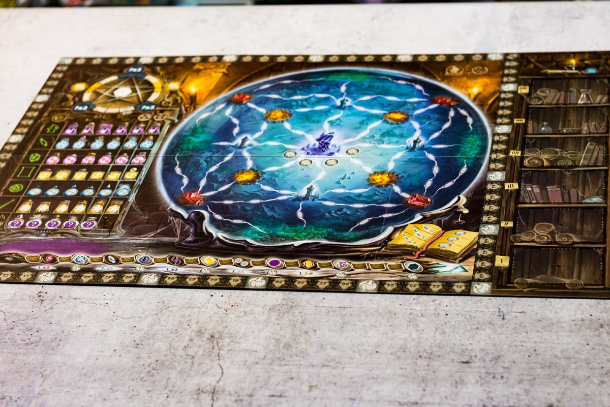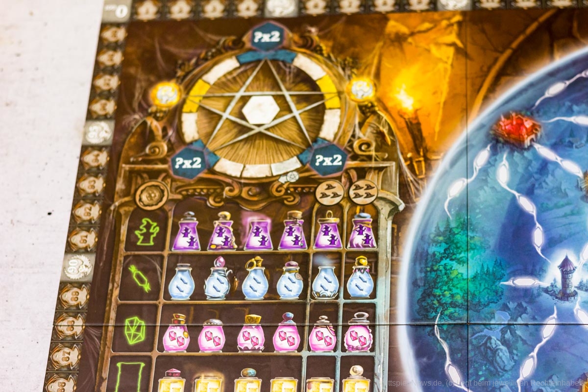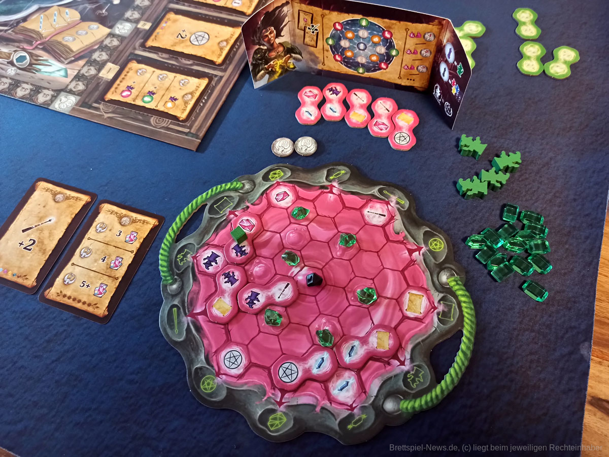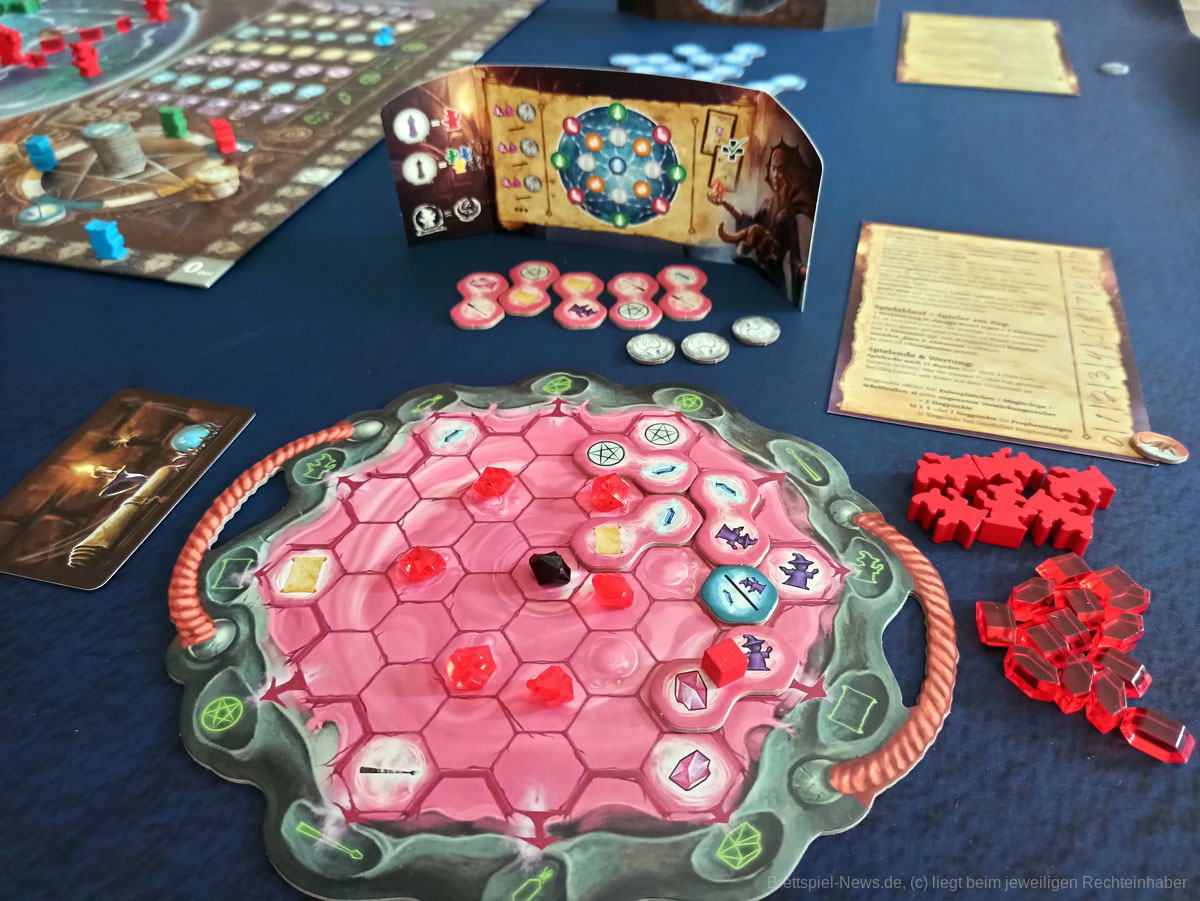 Kernelement des Spiels ist das geschickte Legen von dominoartigen Legeplättchen in den eigenen Zauberkessel, durch die dann die eigentlichen Aktionen getriggert werden. Über Aktionsketten im Kessel und durch die Boni der genutzten Felder und Leisten auf dem Hauptplan können aus dem Anlegen der nur 11 Plättchen durchaus 40 bis 60 Aktionen generiert werden.
