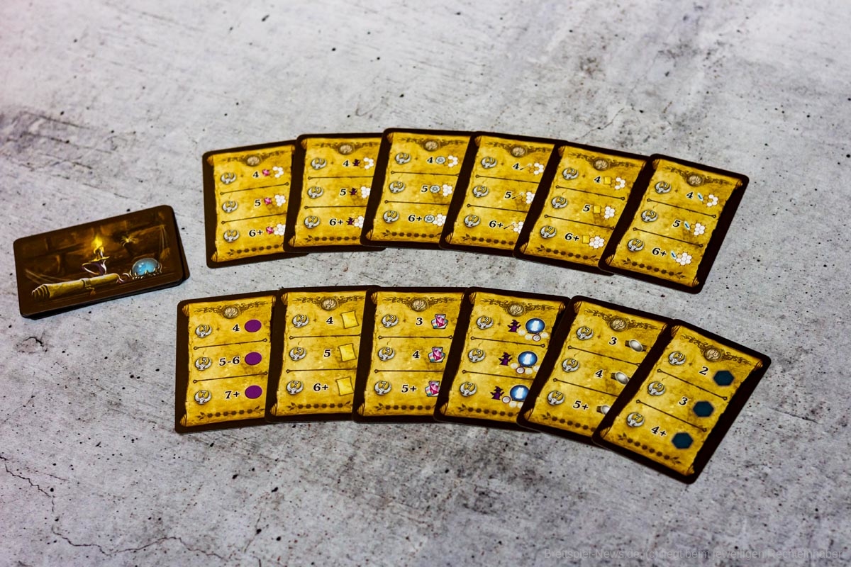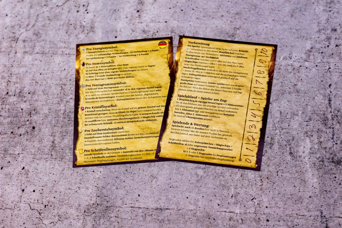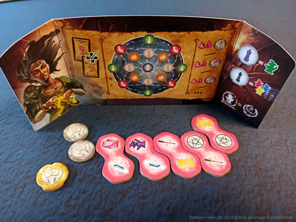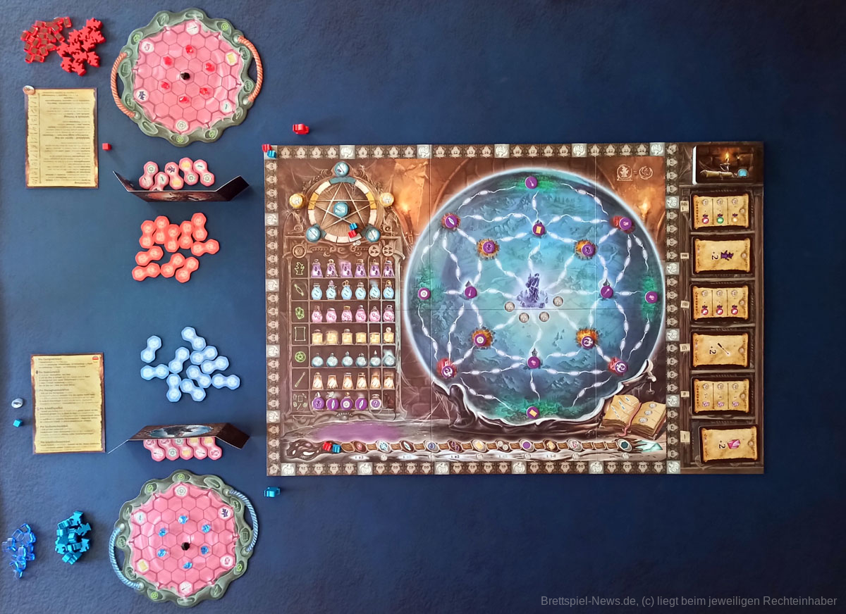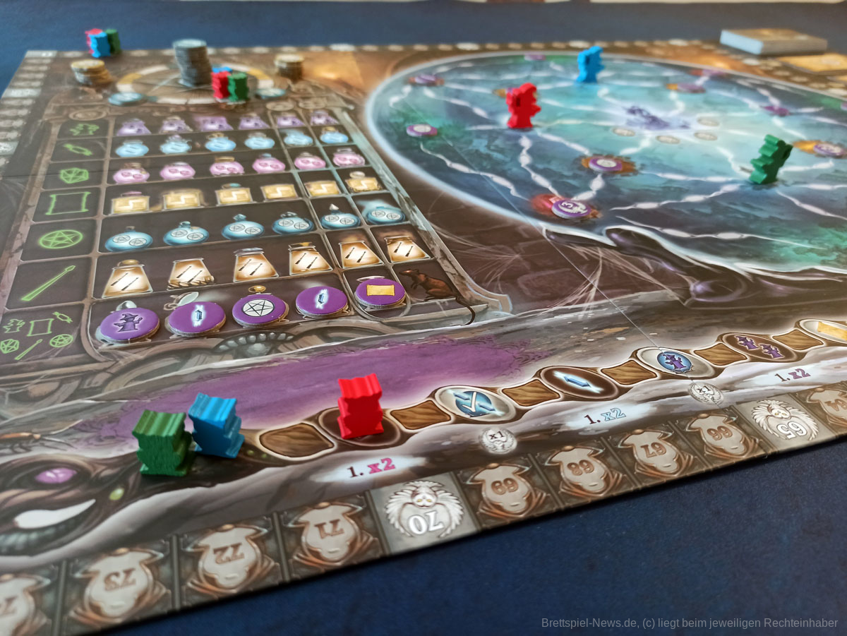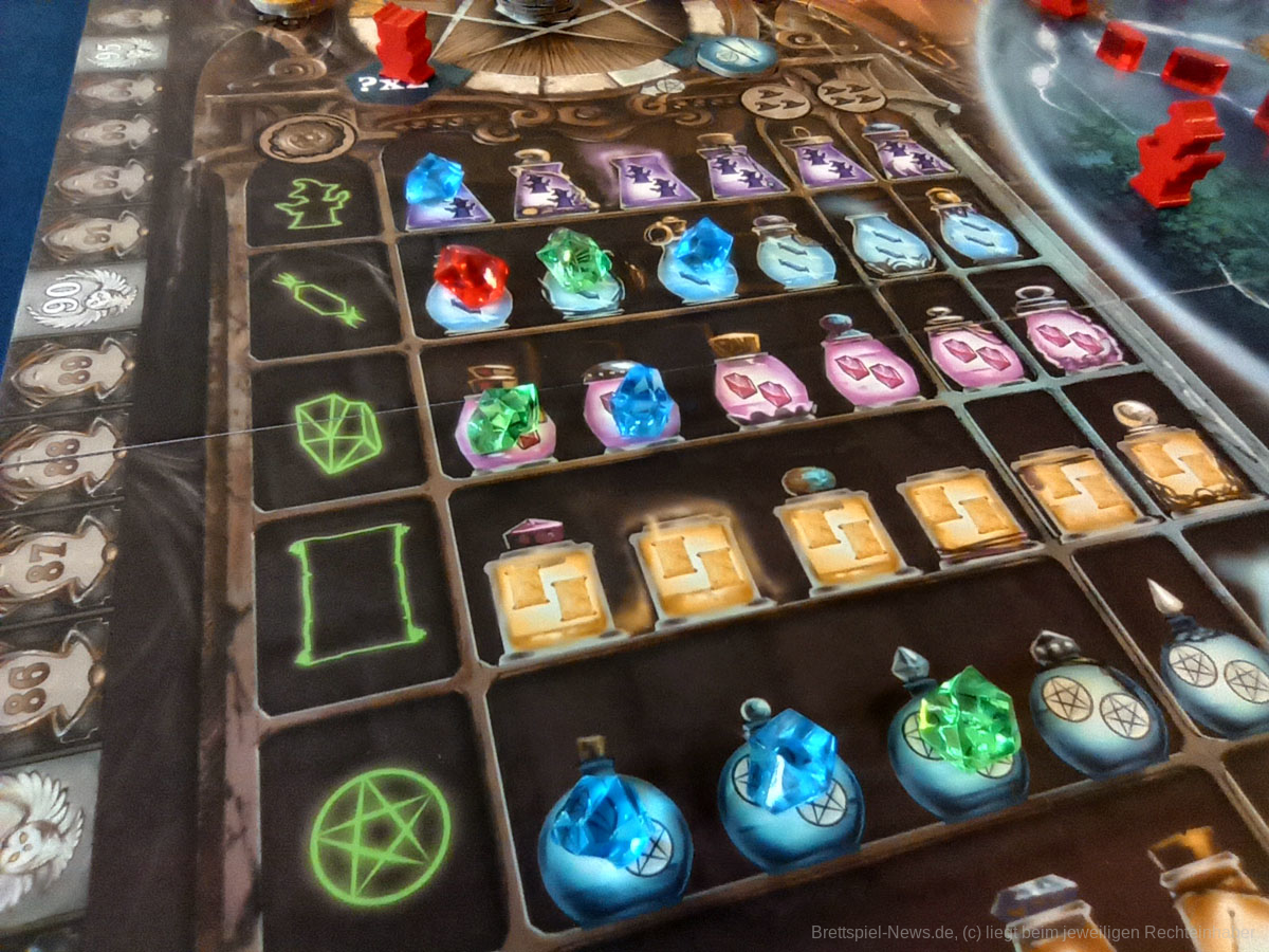 Kernelement des Spiels ist das geschickte Legen von dominoartigen Legeplättchen in den eigenen Zauberkessel, durch die dann die eigentlichen Aktionen getriggert werden. Über Aktionsketten im Kessel und durch die Boni der genutzten Felder und Leisten auf dem Hauptplan können aus dem Anlegen der nur 11 Plättchen durchaus 40 bis 60 Aktionen generiert werden.