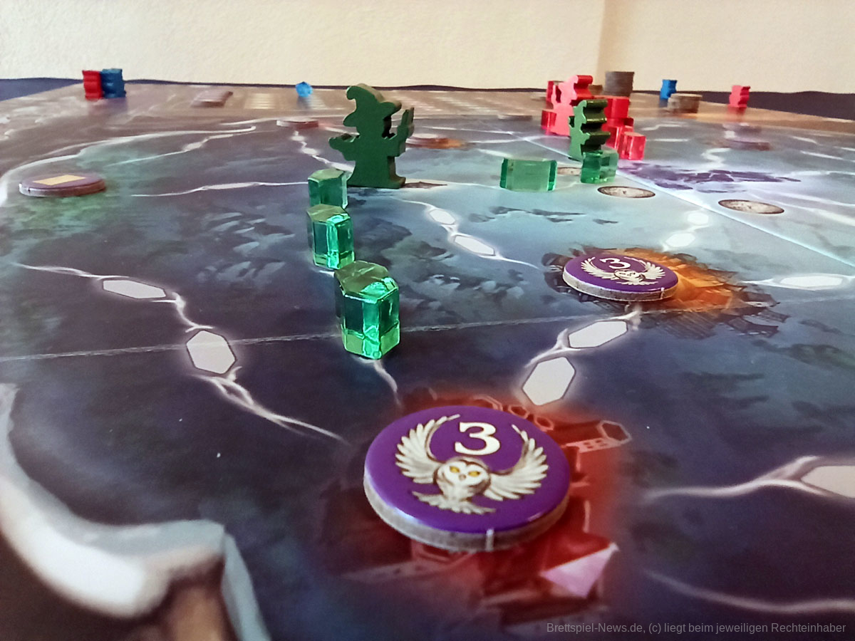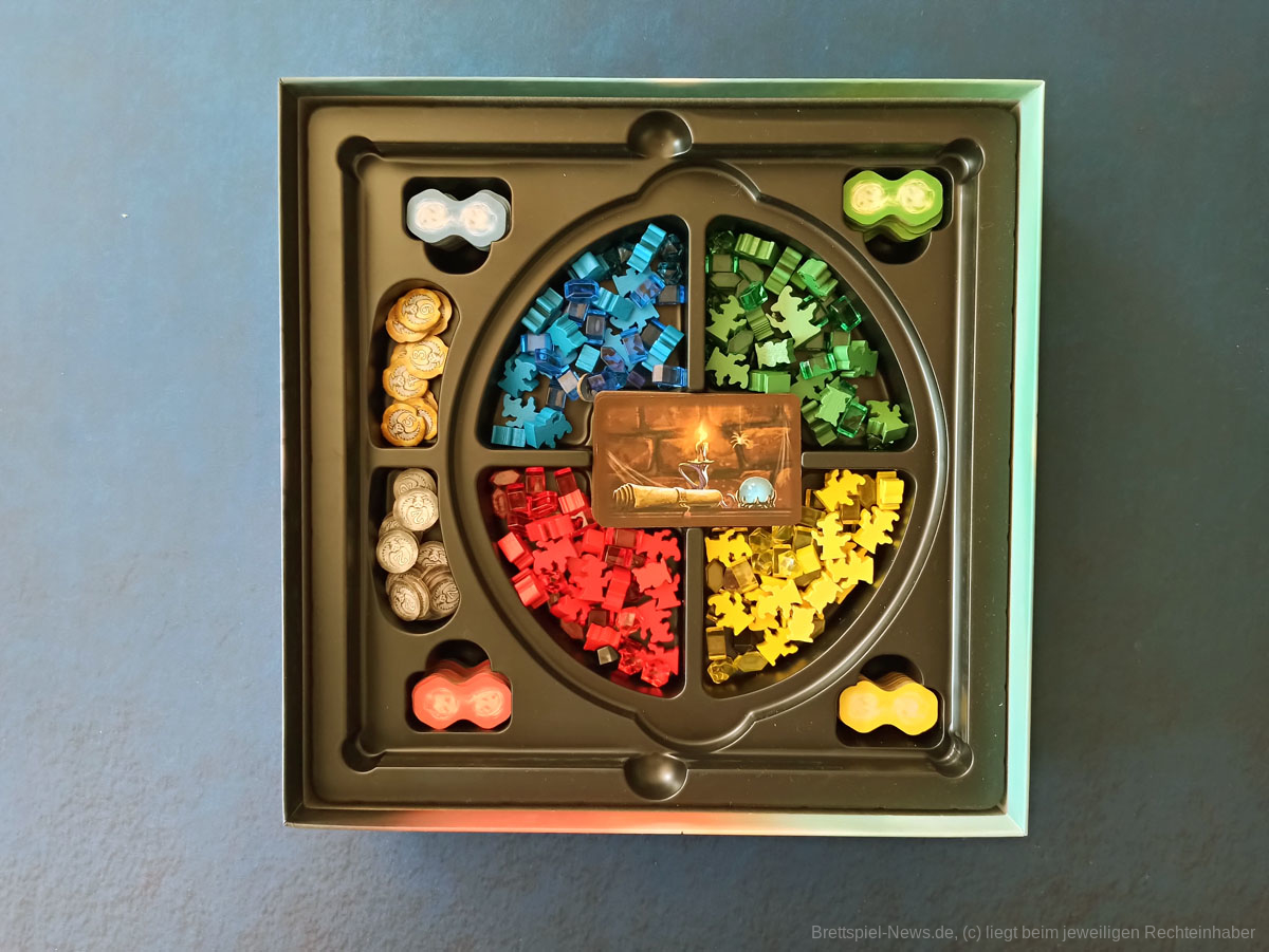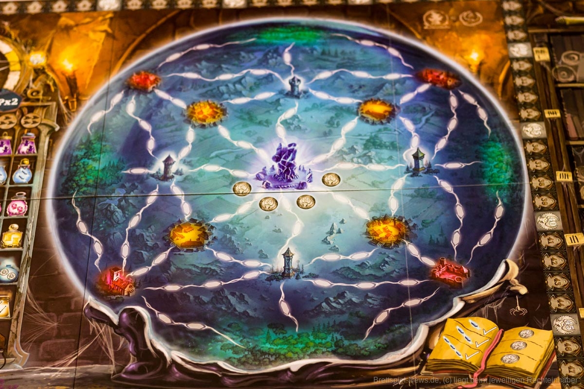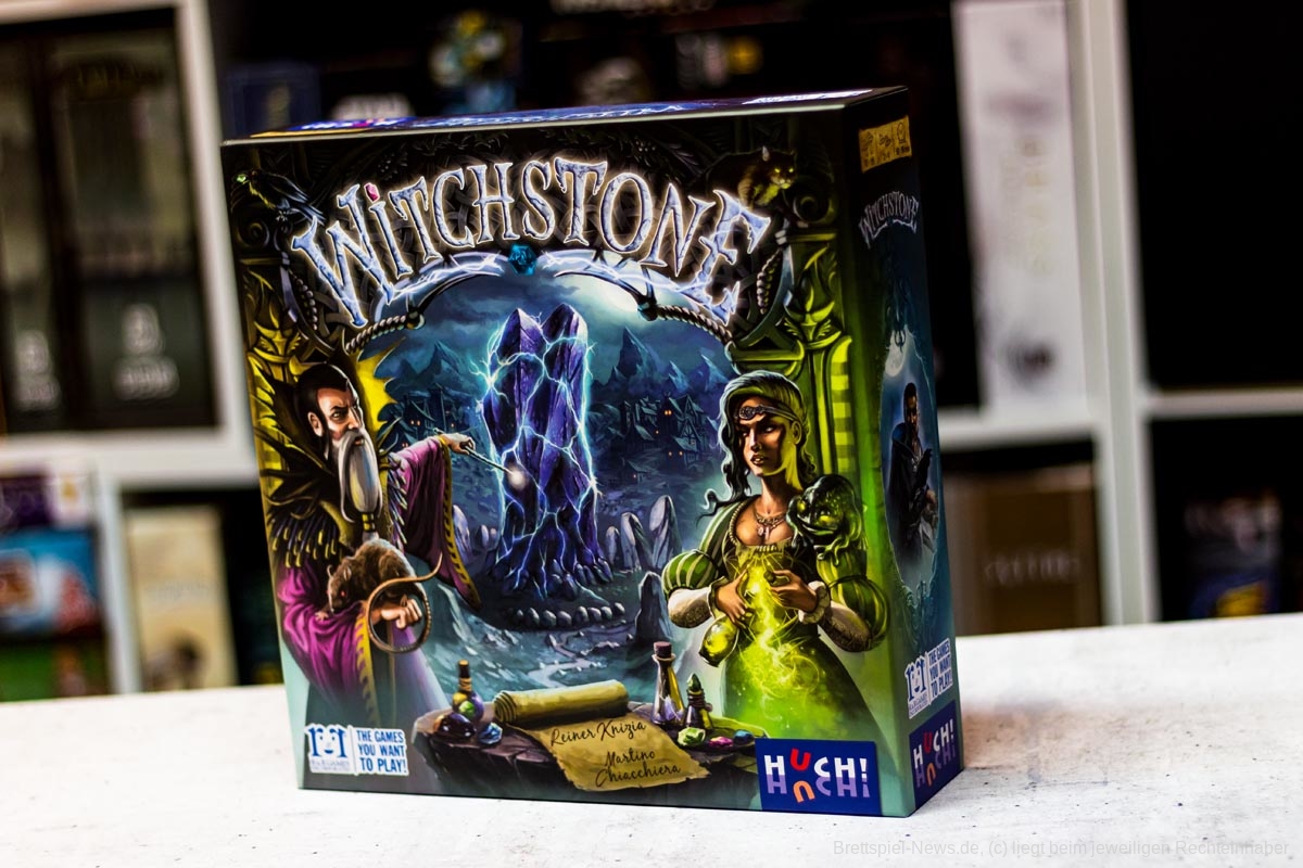 Mit WITCHSTONE hat HUCH! eine Neuheit veröffentlicht, welche vom Autorenduo MARTINO CHIACCHIERA und REINER KNIZIA stammt. Das Spiel ist für zwei bis vier Personen ab zwölf Jahren und dauert zwischen 60 und 90 Minuten. Wer keine Angst vor knalligen Farben hat darf sich an einer hübschen Optik erfreuen. Neben der Grafik macht auch das Spielmaterial einen guten Eindruck.
