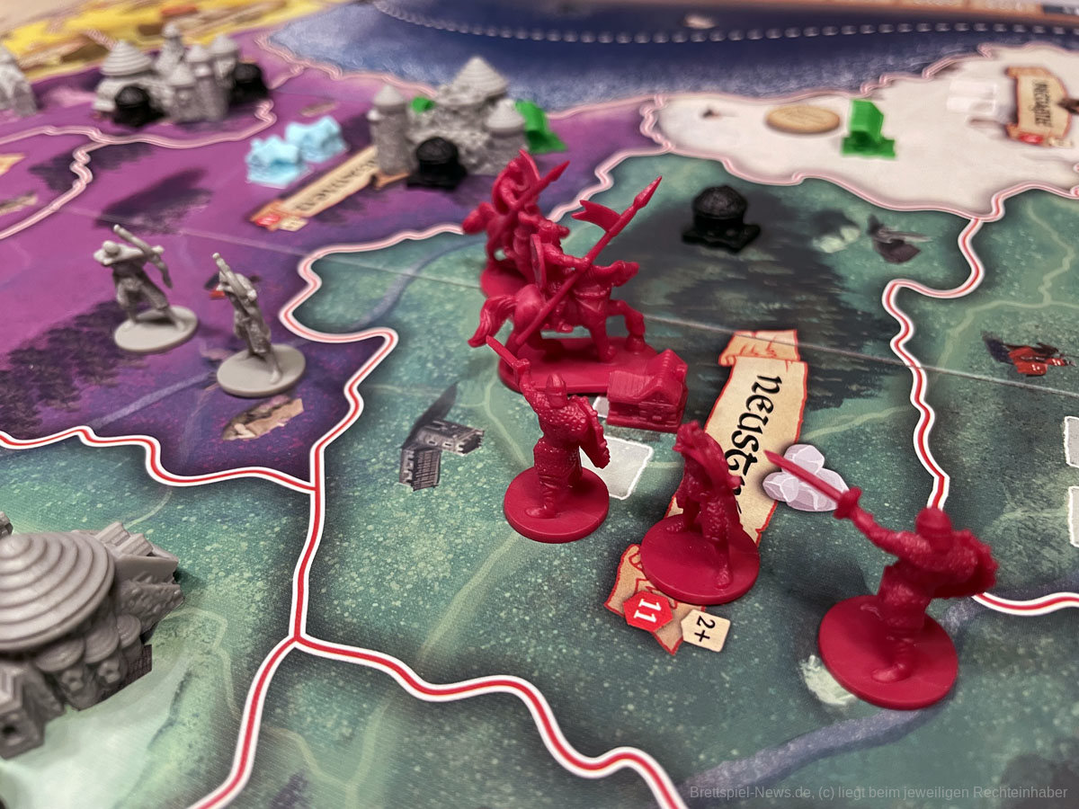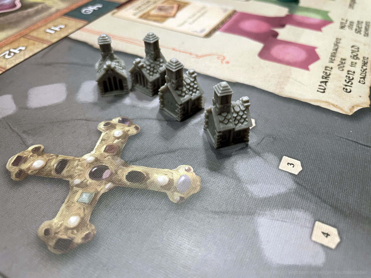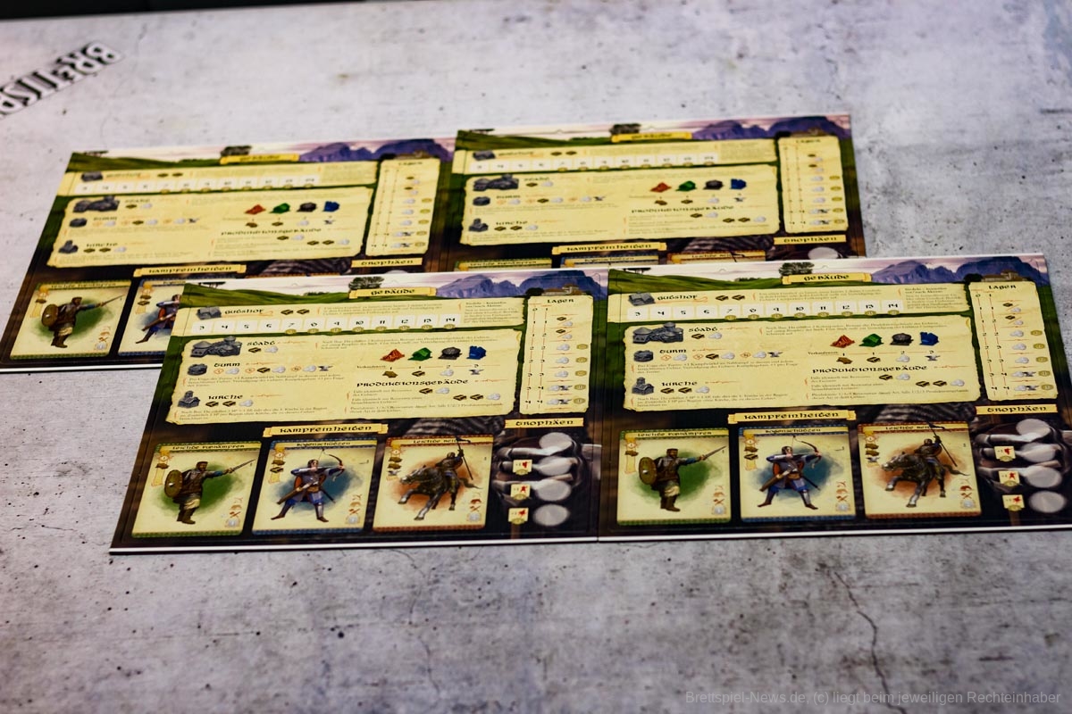 Wer eine Box sein Eigen nennt, wird es mit 1-4 Personen spielen können. Für den UVP von 119 € ist in die Spielbox prall gefüllt. Inlays, viele Karten, massig Miniaturen und Gebäude plus riesigen Spielfeld und Spielertableau bieten ein wirklich umfangreiches Spielmaterial. Der Spielpan hat epische Ausmaße vor allem mit bis zu acht Personen. Zudem sind die Tableaus der Mitspielenden sehr groß. Ein riesiger Tisch ist für die maximale Anzahl dringend nötig.