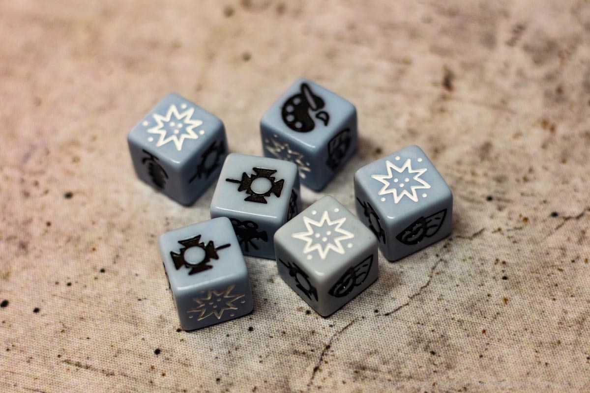 ROLL CAMERA! ist ein kooperatives oder solo spielbares Würfel-Worker-Placement-Spiel mit Ressourcenmanagement und einem zentralen geometrischen Puzzle. Du wirfst die W6 Crew-Würfel, wobei jede Seite eine andere Produktionsabteilung repräsentiert (Kamera, Licht, Ton, Schauspieler, Produktionsdesign, visuelle Effekte) und ordnest sie Aktionen zu, entweder auf dem Hauptbrett oder auf deinen individuellen Tableaus. Diese zeigen bestimmte Abteilungsleiter (Regisseur, Produzent, Kameramann, Cutter, Produktionsdesigner oder den Star) und enthalten einzigartige Aktionsfelder, die in deinem Zug genutzt werden können.