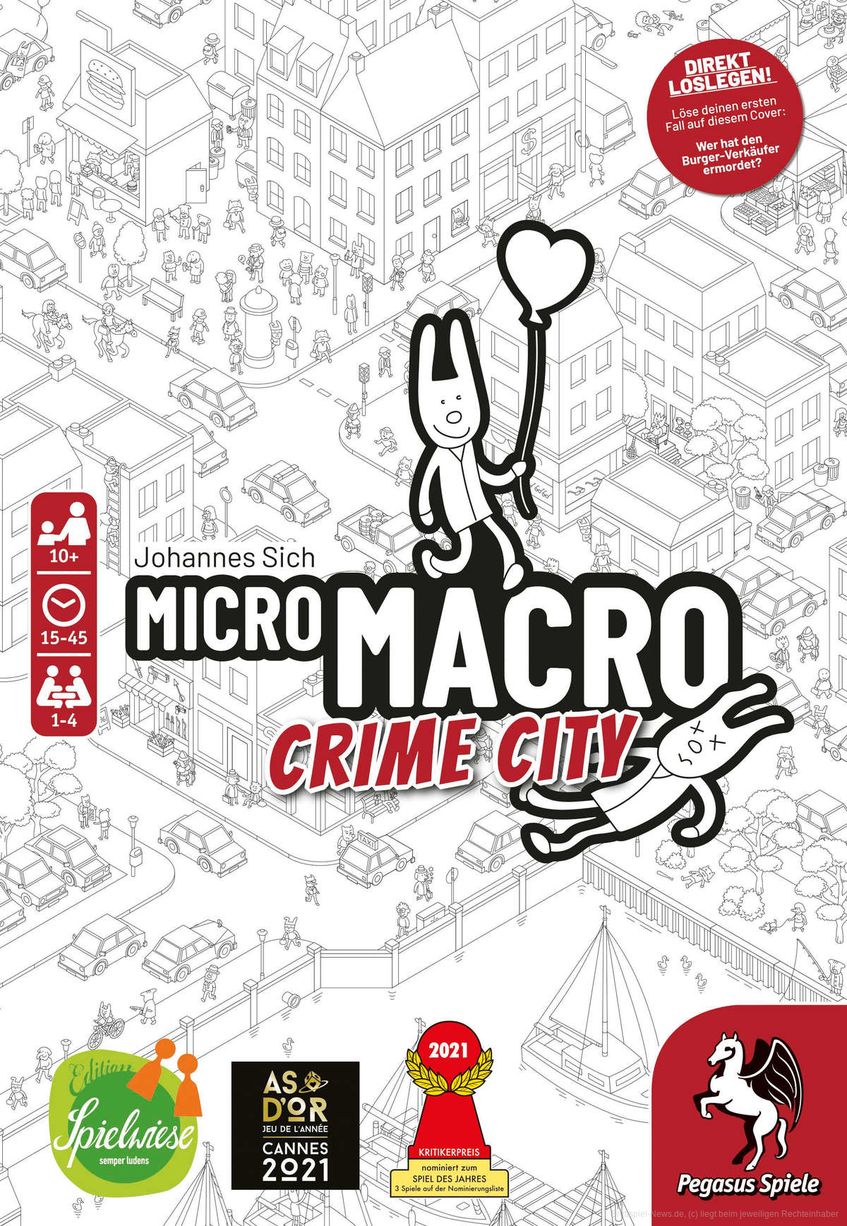 Micro Macro nimmt euch mit auf den großen, schwarz-weißen Stadtplan von Crime City. Ein Wimmelbild, auf dem sich zahlreiche Missetaten ereignen. Ihr seht die Verbrechen in ihrer zeitlichen Abfolge: Die im Comicstil gezeichneten Schurken und ihre Opfer sind an unterschiedlichen Orten zu sehen, zu verschiedenen Zeitpunkten des Geschehens. So lassen sich nach und nach die Fragen beantworten, die euch ein Kartensatz stellt und die zur Lösung des Falls führen.