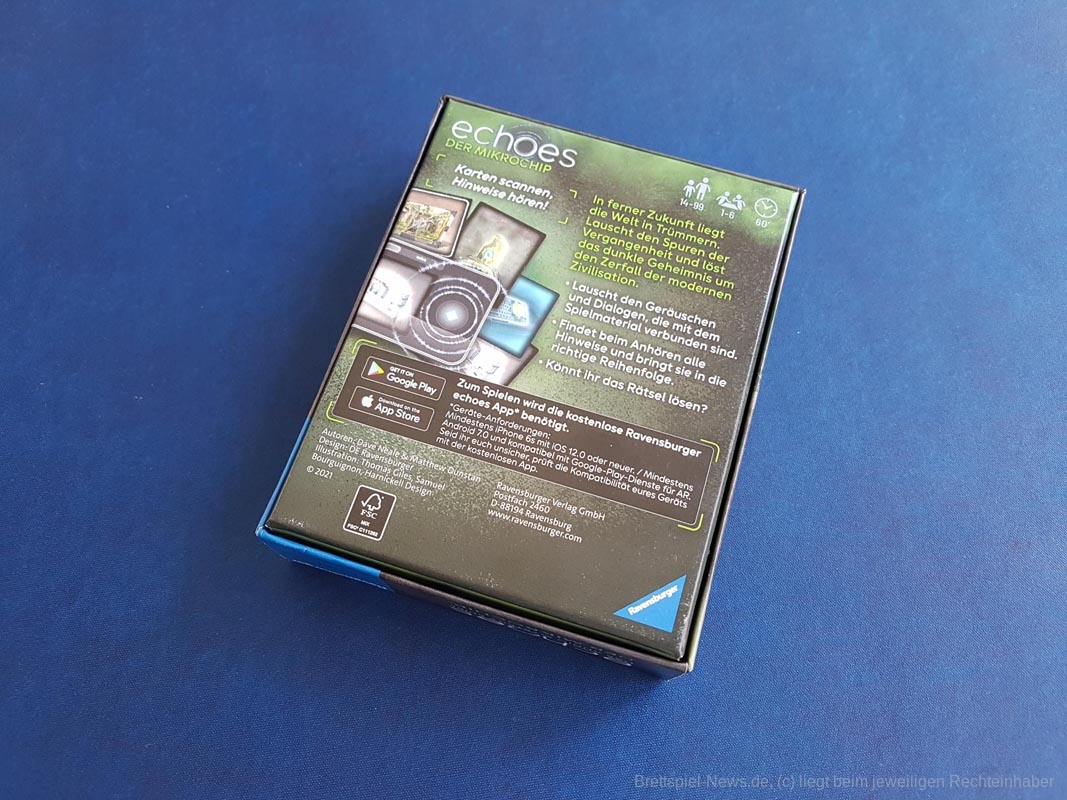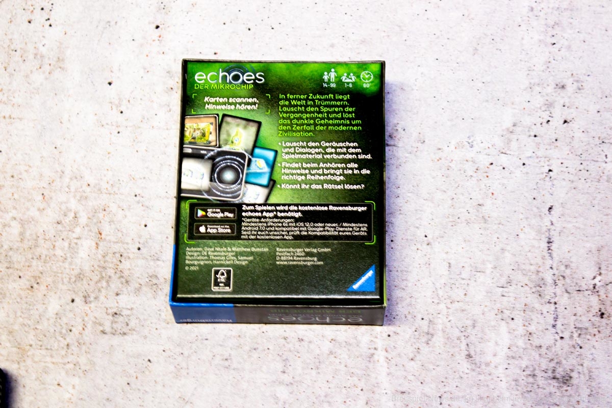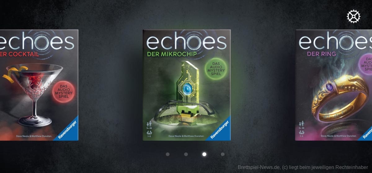 Das Spiel echoes – Der Mikrochip ist bei Ravensburger erschienen. Hier werden Karten mittels App gescannt und diese spielt dann den 1-6 Personen Sound-Schnipsel vor, die es in eine richte Reihenfolge zu legen gilt. Echoes stammt von den Autoren Dave Neale & Matthew Dunstan und ist für 9,99 UVP im Handel erhältlich. Es sind mit Die Tänzerin und Der Cocktail noch zwei weitere Teile erschienen.