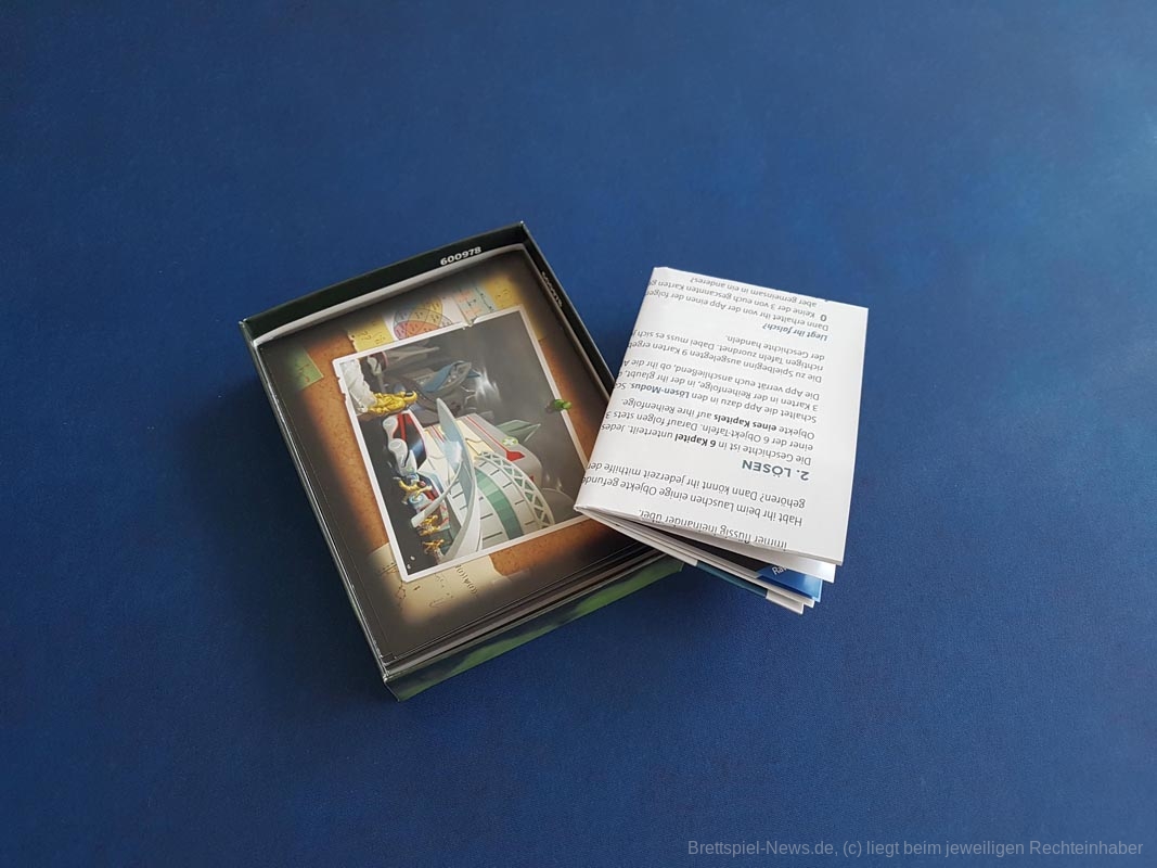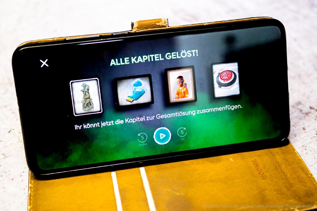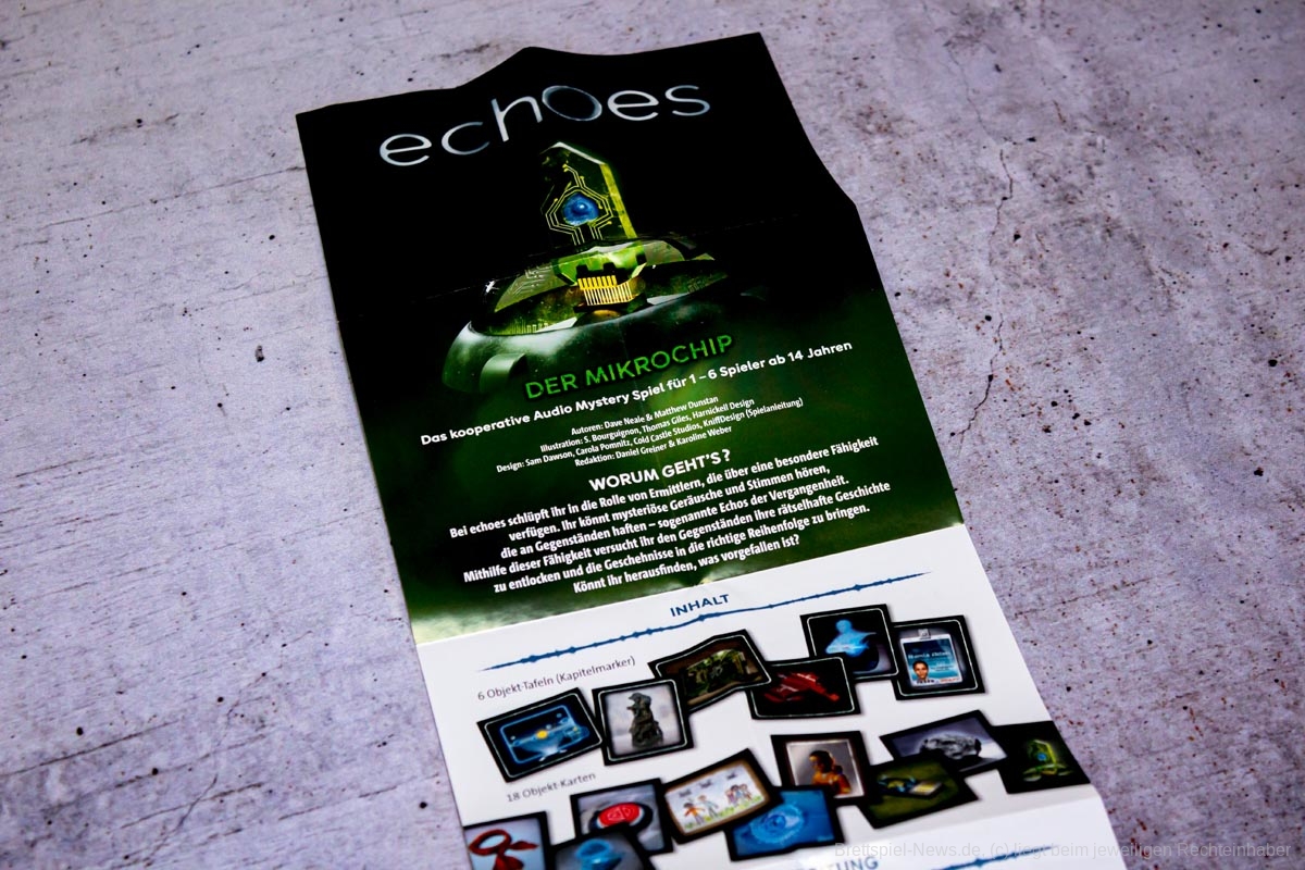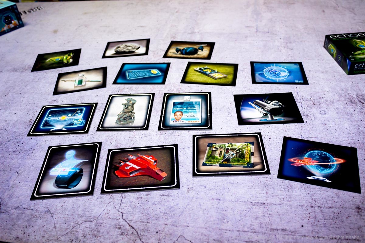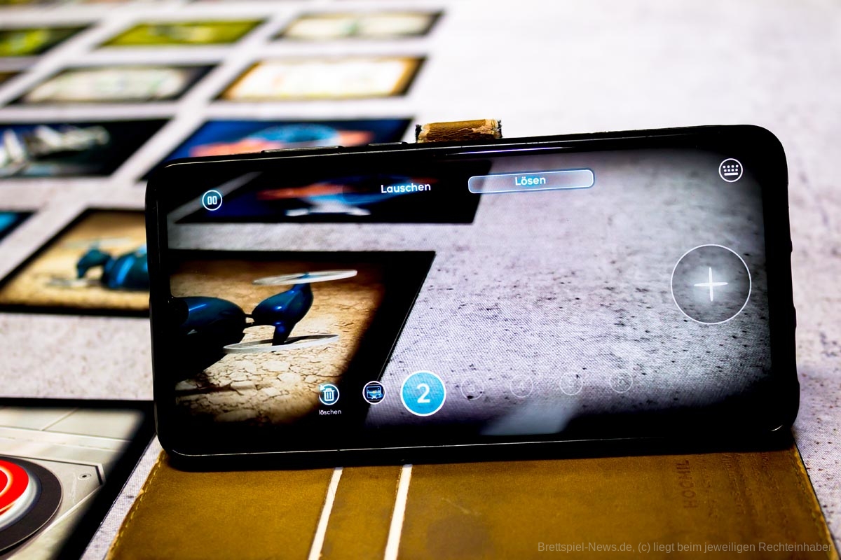 24 illustrierte Karten liefern bruchstückhafte, teils versteckte Hinweise. Hinter jeder Abbildung stecken essenzielle Geräusche oder Teile eines Gesprächs. Mit der kostenlosen „echoes“ App (für iOS und Android) können die Spieler diesen lauschen, sobald sie ihre Handykamera über das Spielmaterial bewegen, und anschließend in die hoffentlich richtige Reihenfolge bringen. „echoes“ ist in sechs Kapitel unterteilt, denen man die jeweils drei richtigen Objektkarten zuordnen muss. Die App liefert bei Bedarf nicht nur Hilfestellung und verrät, ob die Reihenfolge richtig ist, sie schafft auch gleichzeitig die für den jeweiligen Fall passende Atmosphäre.