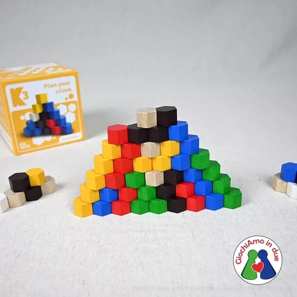 Schritt für Schritt erfolgt dann der Aufstieg auf den K3 in dem nach bestimmten Regeln Steine auf die Basis in der Mitte gesetzt werden. Die Steine müssen dabei aus dem persönlichen „Vorrats-Berg“ von oben genommen werden. Zu Spielbeginn muss daher gut überlegt werden, wie man seinen Stein-Vorrat aufbaut - die möglichen Spielzüge werden damit vorprogrammiert. Joker-Steine und Steine, mit denen man einen Zug aussetzen kann, erleichtern den Aufstieg ein wenig, aber auch ihr Einsatz muss gut vorgeplant werden.