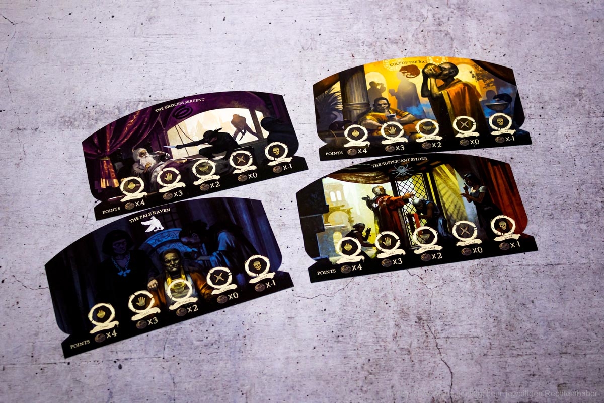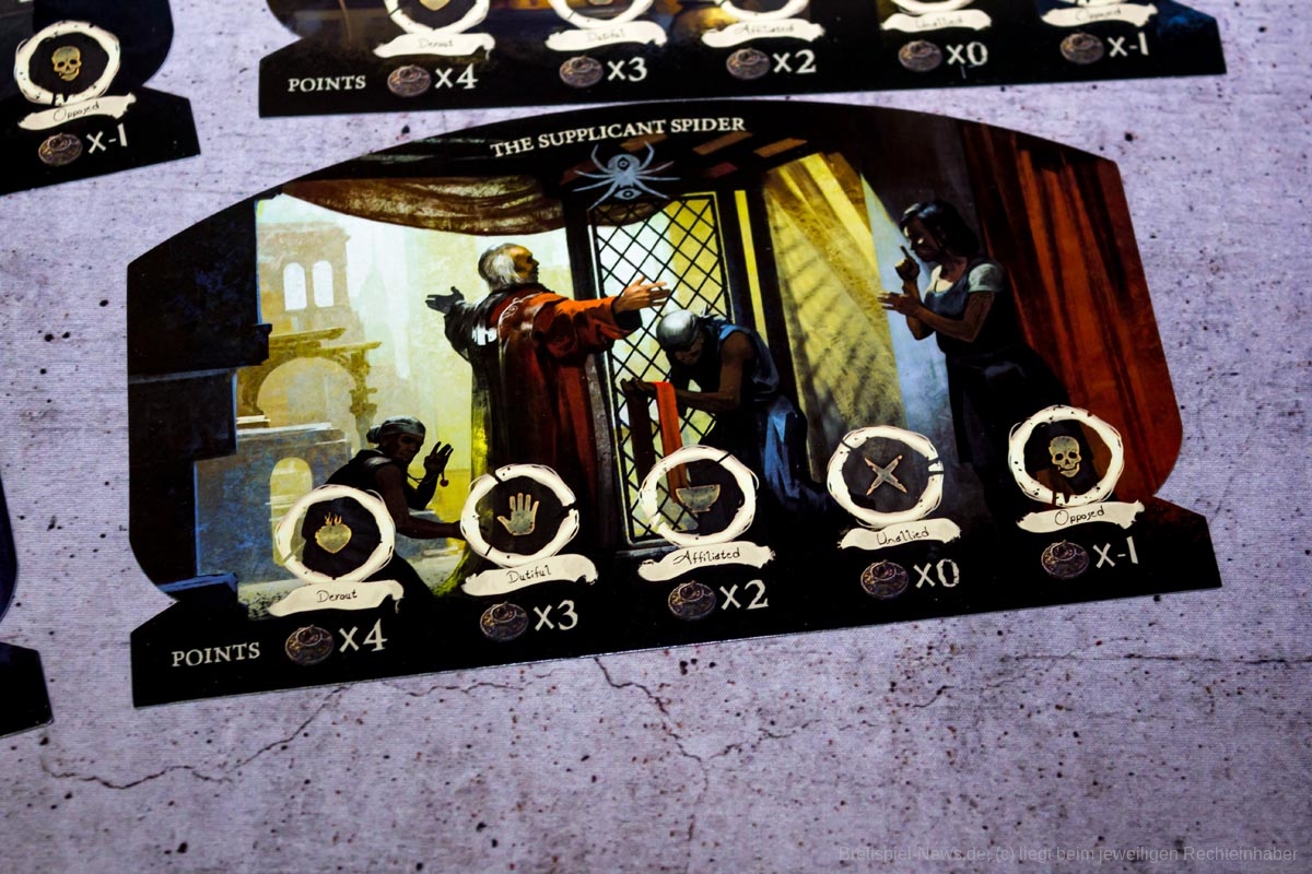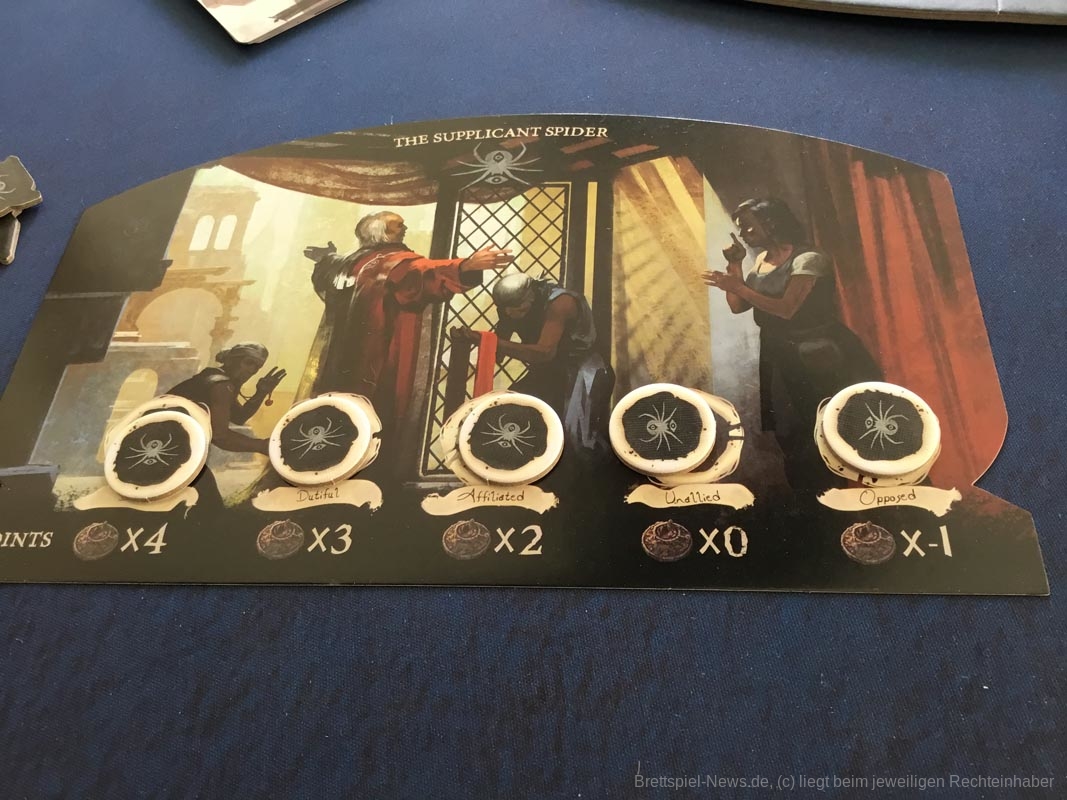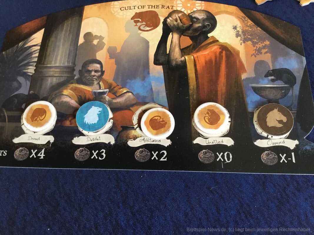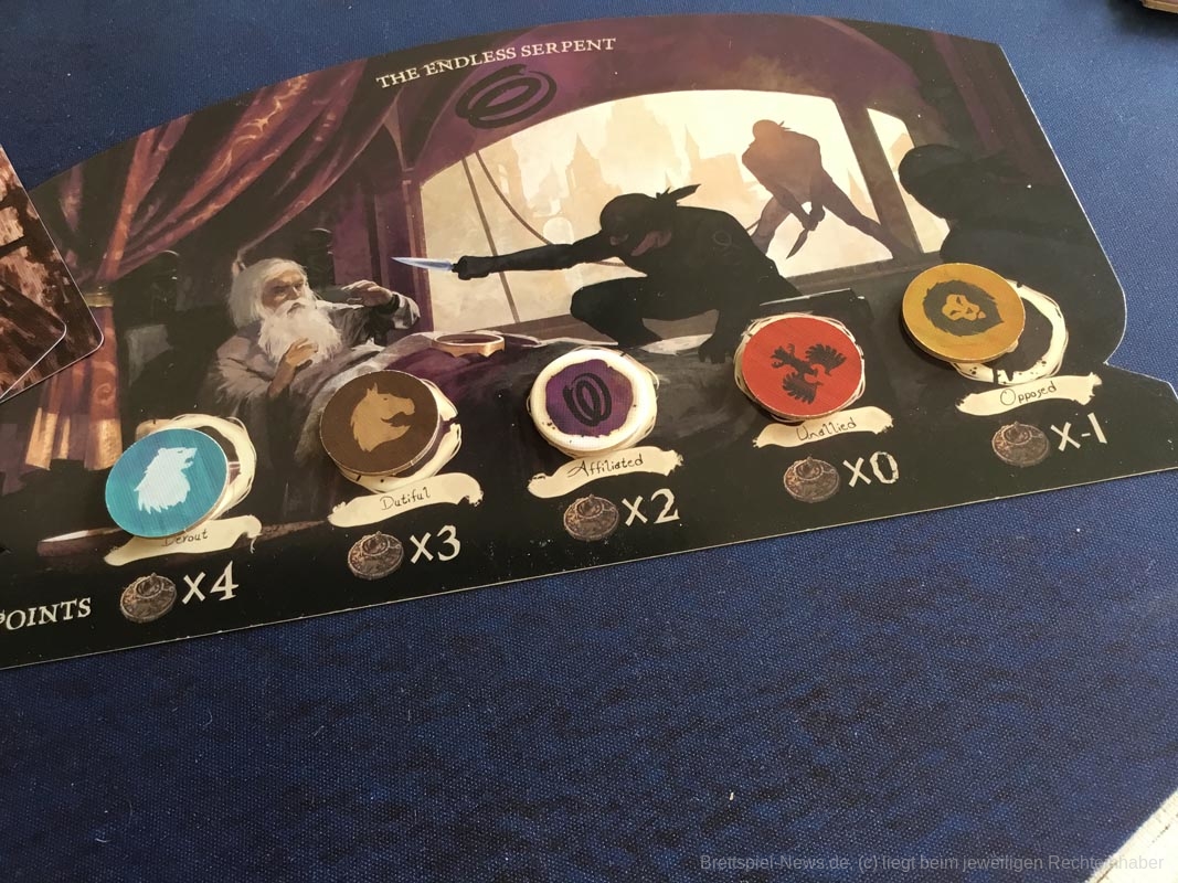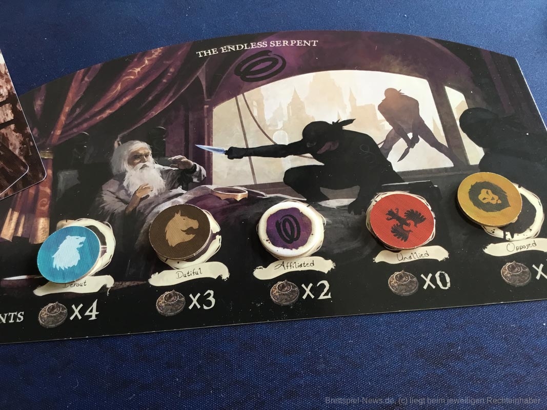 Tausch-Phase: In der Reihenfolge der Spieler darf jeder Spieler zwei seiner nicht aufgedeckten Loyalitätsplättchen tauschen. Wenn Sie sich dafür entscheiden, müssen diese beide vertauschten Loyalitätsplättchen aufgedeckt werden. Sie bleiben für den Rest des Spiels aufgedeckt.