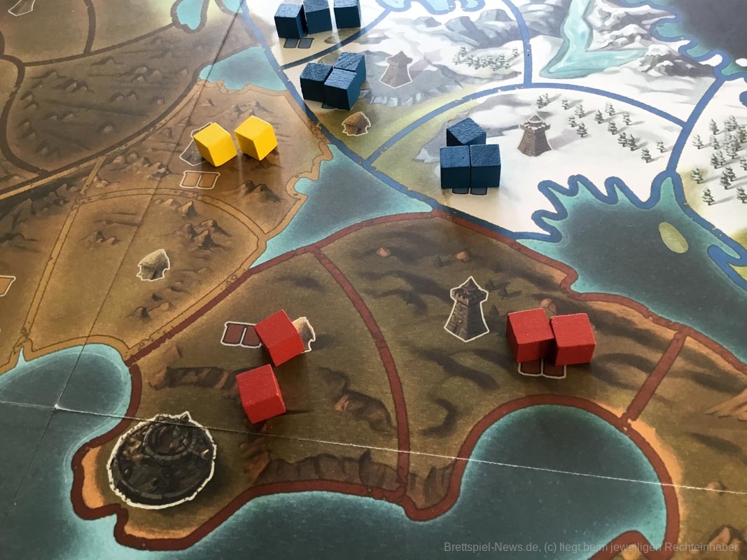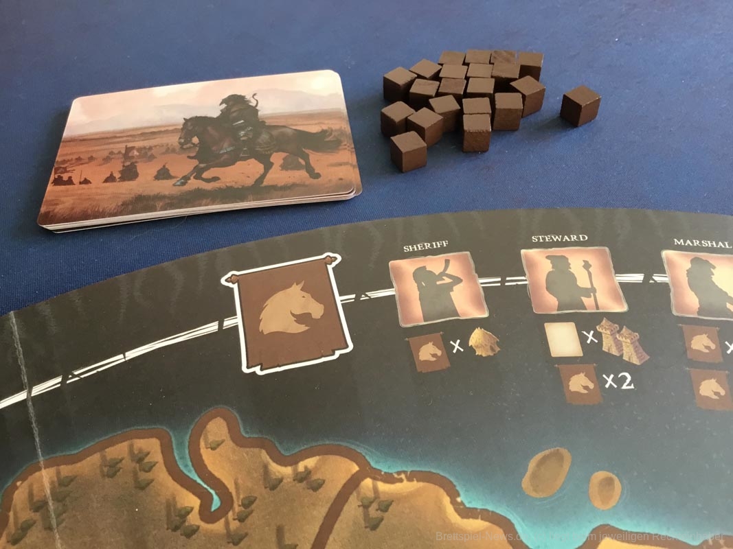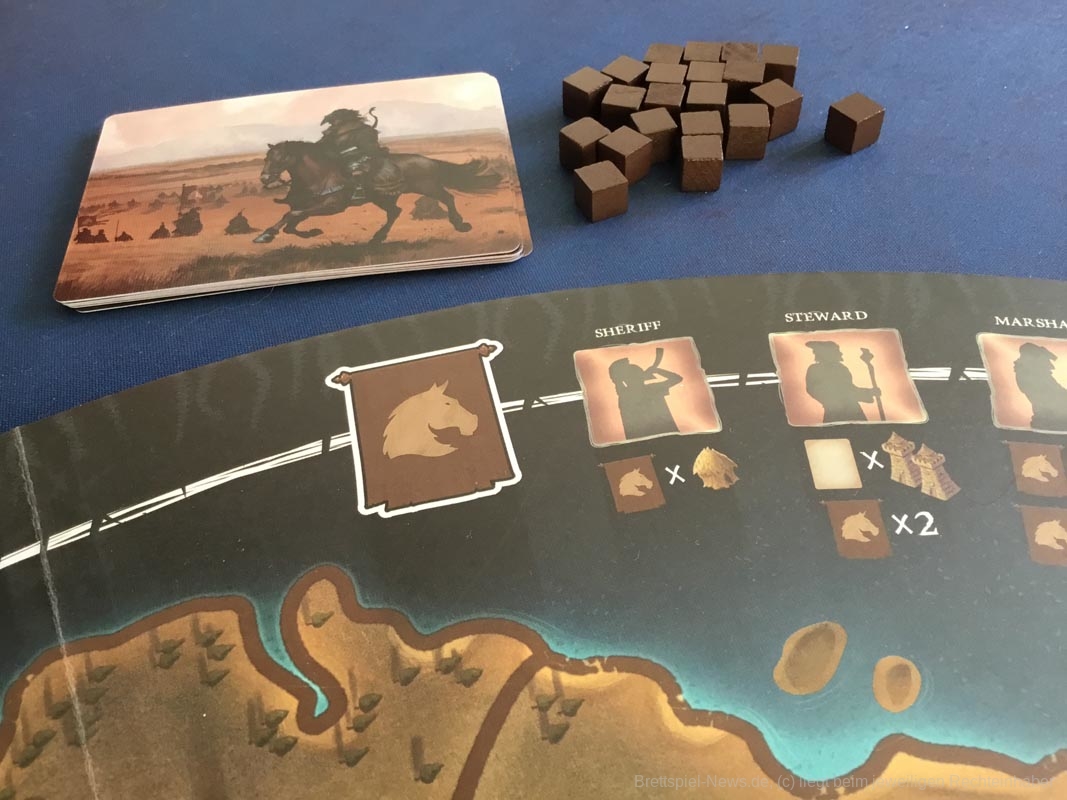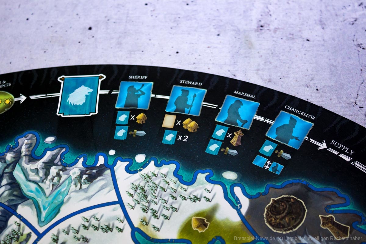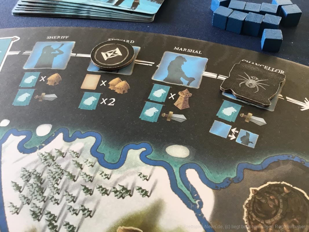 Phase "Agenten einsetzen": In der Reihenfolge der Spieler (beginnend mit dem ersten Spieler und im Uhrzeigersinn) entfernt jeder Spieler Agenten und setzt dann Agenten in die Räte der Imperien ein, wobei die Positionen auf dem Spielbrett mit Sheriff, Steward, Marshall und Kanzler gekennzeichnet sind.