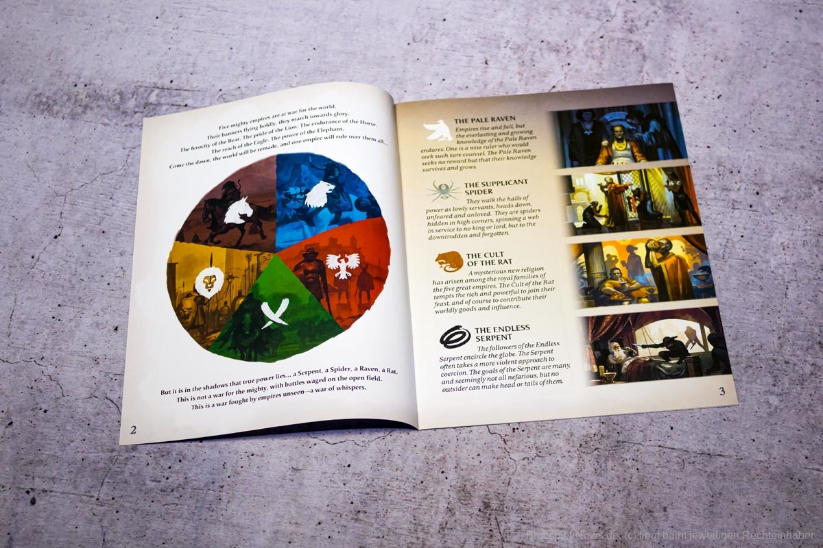 A War of Whispers ist ein kompetitives Brettspiel für 2 bis 4 Personen. Fünf mächtige Reiche befinden sich im Krieg um die Welt, aber diese Reiche haben keine mächtige Führung. Stattdessen werden Sie von geheimen Gesellschaften kontrolliert. Diese Gesellschaften wetten auf das Ergebniss des Krieges, während Sie die Fäden ziehen, um die Ereignisse zu manipulieren und sicherzustellen, dass sich ihre Wetten auch auszahlen. Ein Krieg der Flüsterer ist ein Spiel mit tiefgründiger Strategie, versteckten Agenden und wechselnden Loyalitäten.