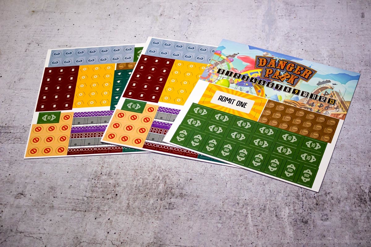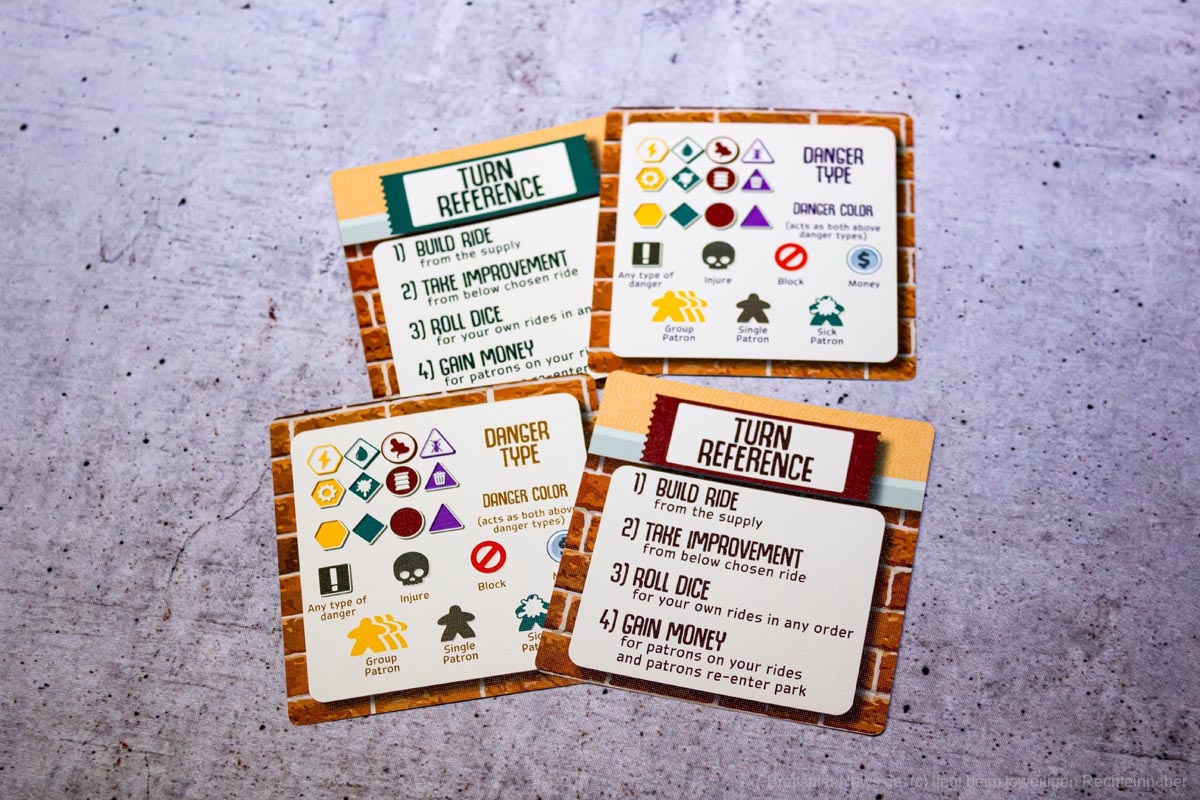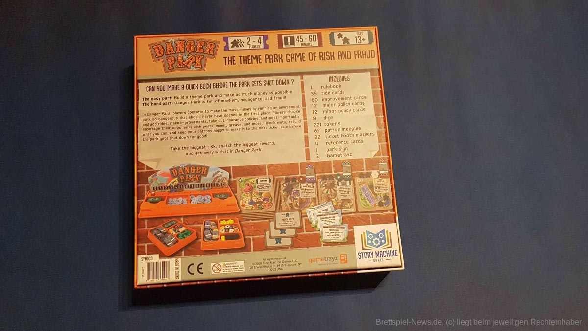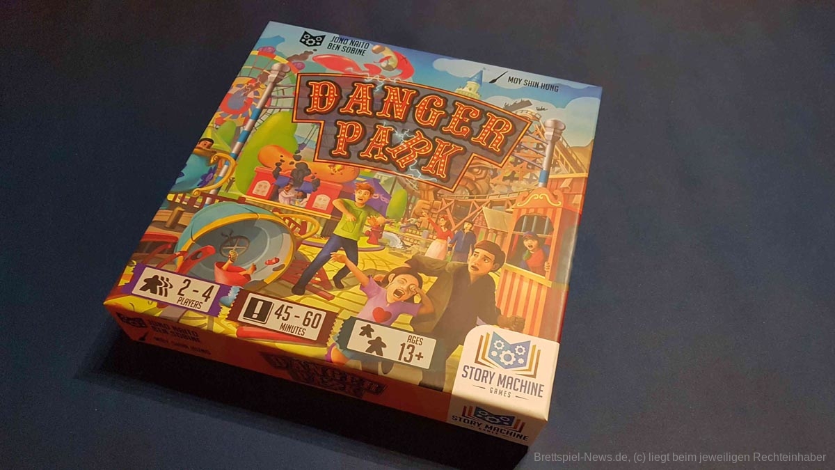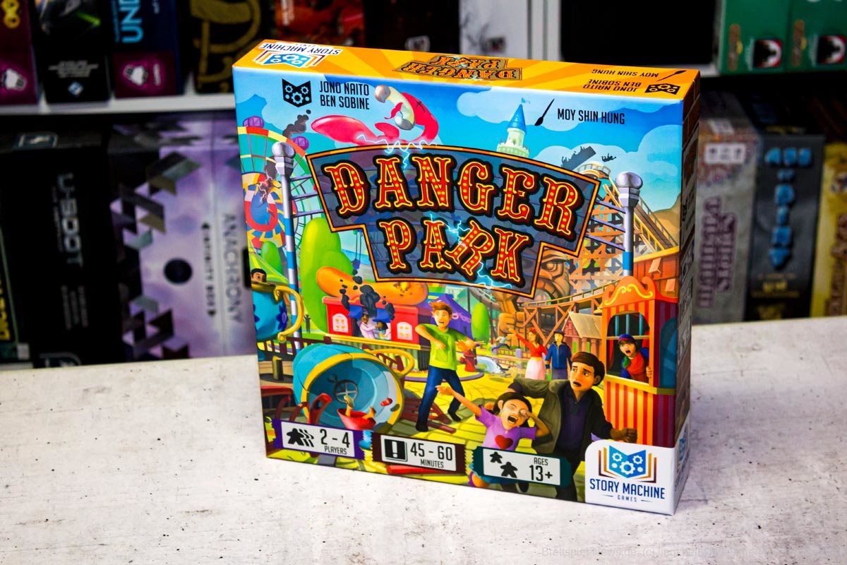 In Danger Park platzieren alle abwechselnd Fahrgeschäfte in einem gemeinsam errichteten Vergnügungspark. Die Besucher werden platziert und bewegen sich durch den Park, basierend auf den Ausgängen der Fahrgeschäfte, und jeder Besucher generiert Geld für die verschiedenen Besitzer der Fahrgeschäfte. Mit den einzigartigen Fähigkeiten der Fahrgeschäfte und den Parkverbesserungen bewegen die Spieler die Gäste, blockieren Ausgänge und fügen vor allem Gefahren in Form von Erbrochenem, Schädlingen, Überschwemmungen, Stromausfällen und mehr hinzu, um die Würfelwürfe zu beeinflussen. Hohe Würfe zeigen Zufriedenheit und halten die Besucher auf den Fahrgeschäften. Niedrige Würfelergebnisse sorgen für zusätzliche Gefahren und zwingen die Besucher/innen, auf andere Fahrgeschäfte auszuweichen.