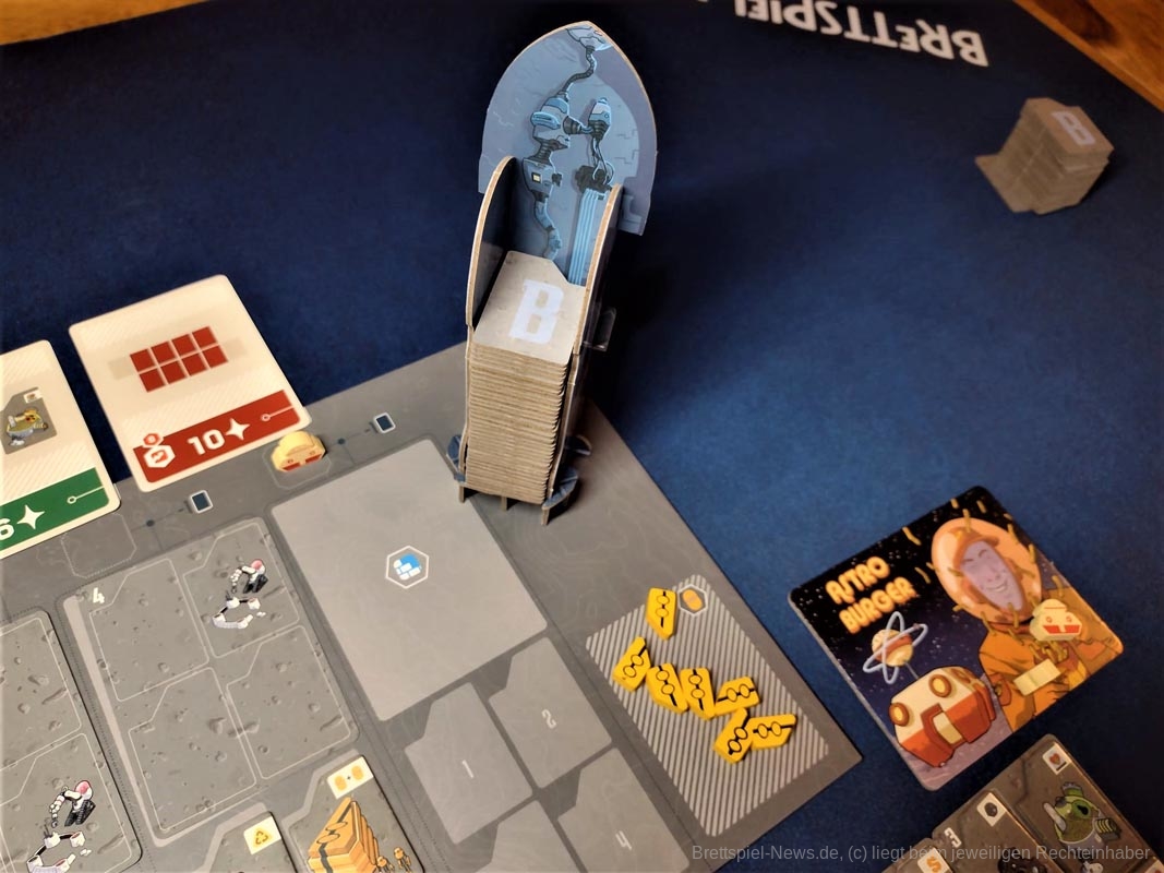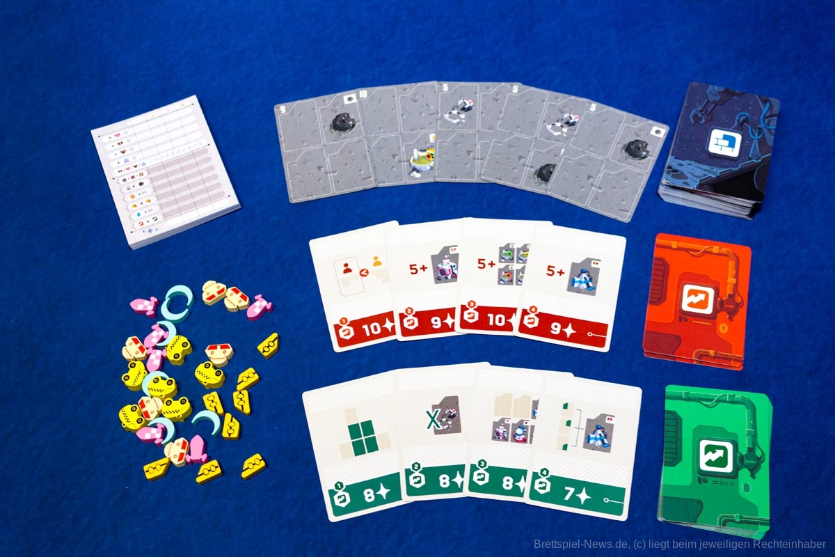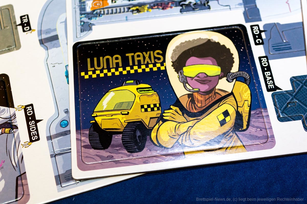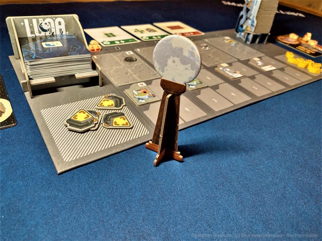 Die Plättchen zeigen, welche Projekte zur Verfügung stehen. Alle sind für den Bau der Stadt wichtig. Dazu gehören Sauerstoffsammler, Gewächshäuser, Wohnkomplexe und (besonders wichtig) Verkaufsbüros, um Wohnungen mit den besten Aussichten in der Galaxie zu verkaufen. Jede dieser Kategorien wird danach gewertet, wie sie im persönlichen Spielbereich angeordnet ist. Wer ihre Anordnung und Platzierung am besten nutzen kann, wird Bürgermeister oder Bürgermeisterin von LUNA Capital.