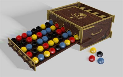 Es gibt fünf Reihen, die voneinander getrennt sind. Über eine Art Trichter werden unterschiedlich farbige Kugeln automatisch in den Reihen verteilt. Jeder Spieler kann sich nun eine Kugel herausnehmen. Treffen dann zwei gleichfarbige danach aufeinander, dürfen auch diese genommen werden, da es zu einer Explosion gekommen ist. Die Kugeln rutschen auf der schrägen Ebene immer automatisch nach. Das Spiel sieht spannend aus und wir hoffen es zeitnah zu testen.