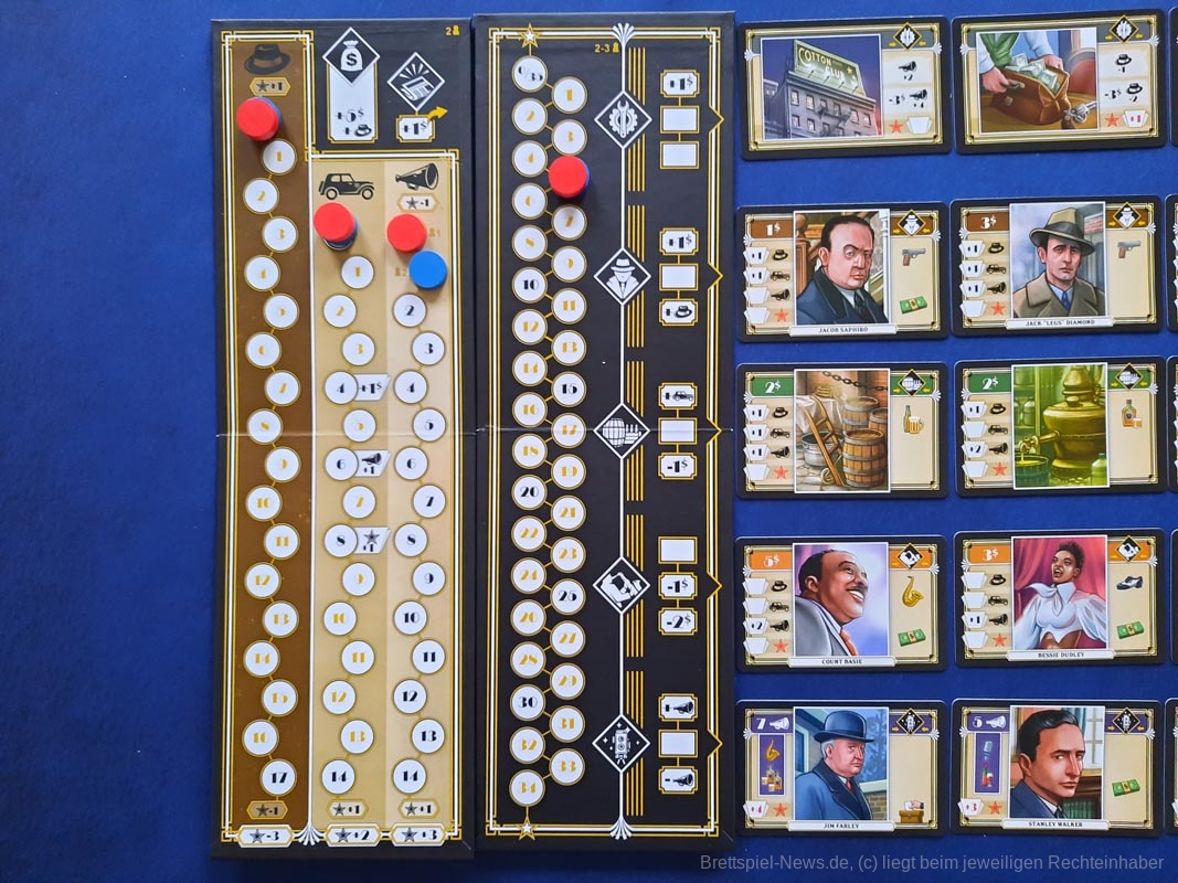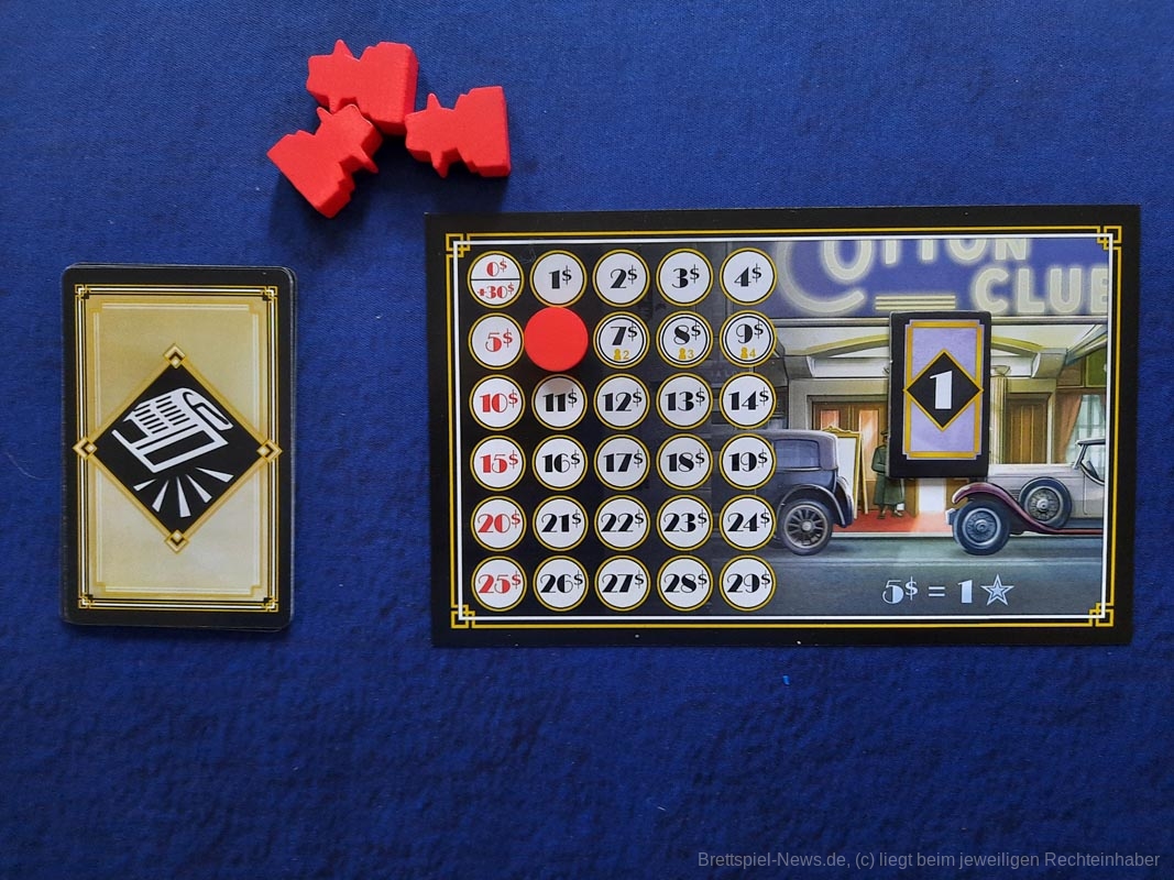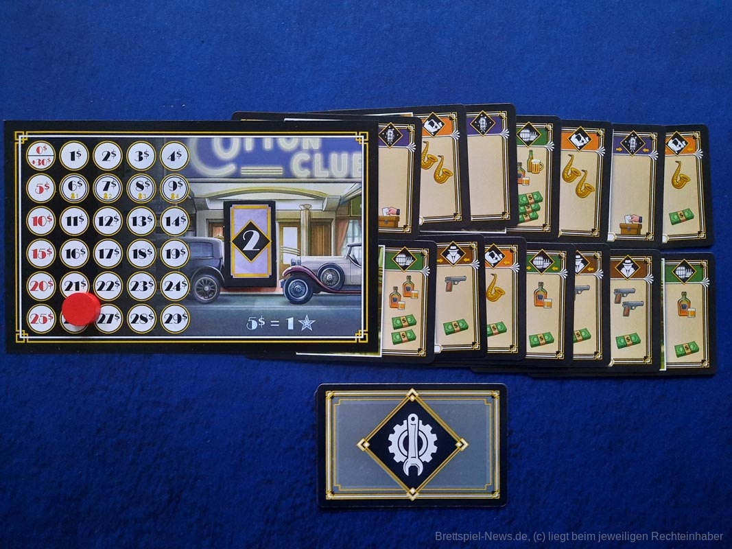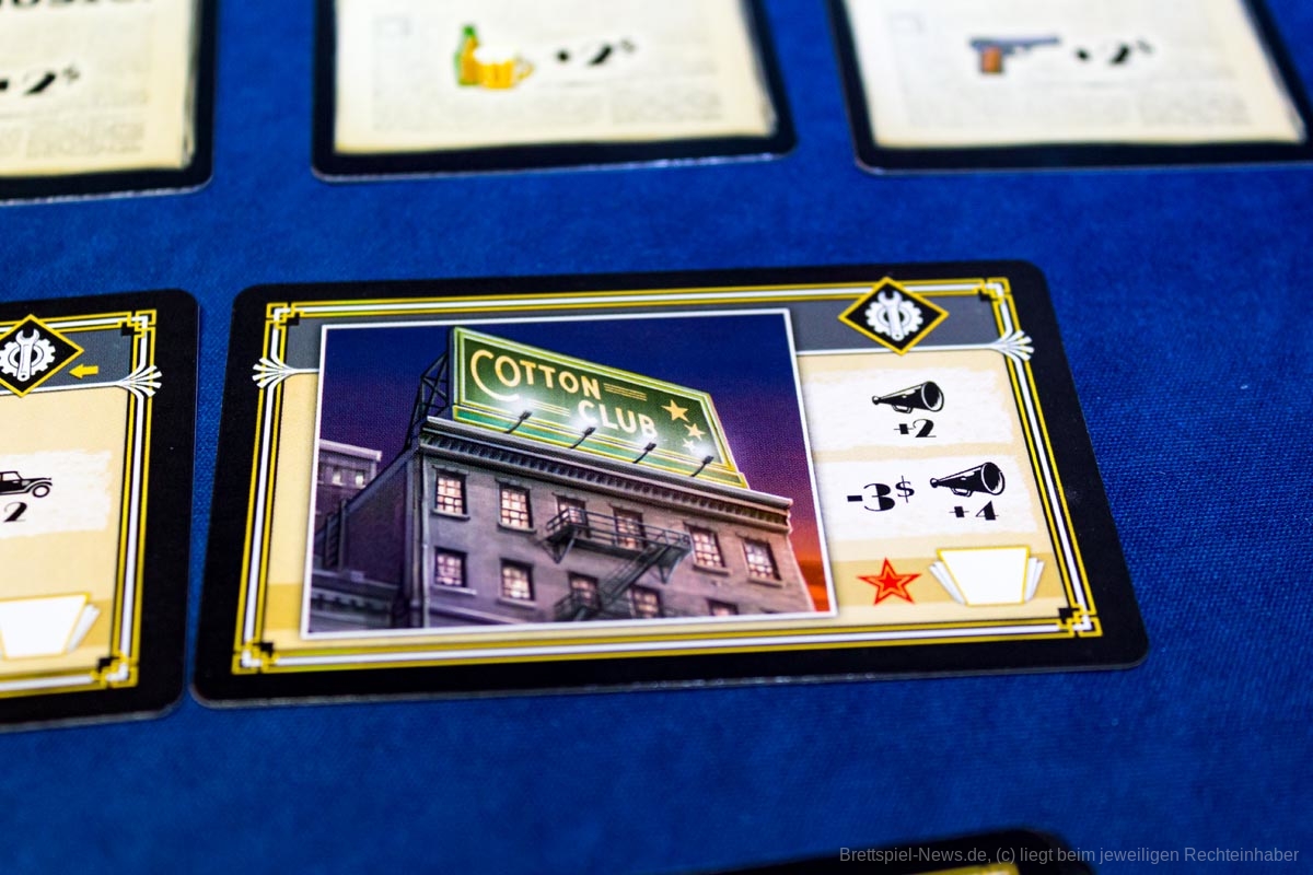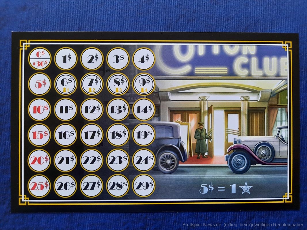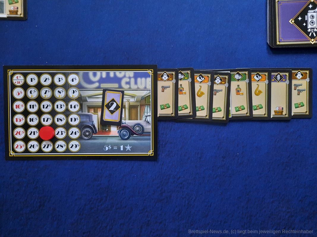 1923 Cotton Club wird über maximal sechs Runden gespielt, in denen ihr drei Spielfiguren einsetzen könnt, um zwischen verschiedenen Aktionen zu wählen: Verbesserungen vornehmen, um einen Kredit bitten, einen Tipp bekommen, sich mit Gangstern zusammentun, schmuggeln, Künstler anheuern und Berühmtheiten anziehen. Alles, um mehr Ansehen zu sammeln als alle anderen Clubs in New York! Wer am Ende die meisten Rufpunkte hat, gewinnt.