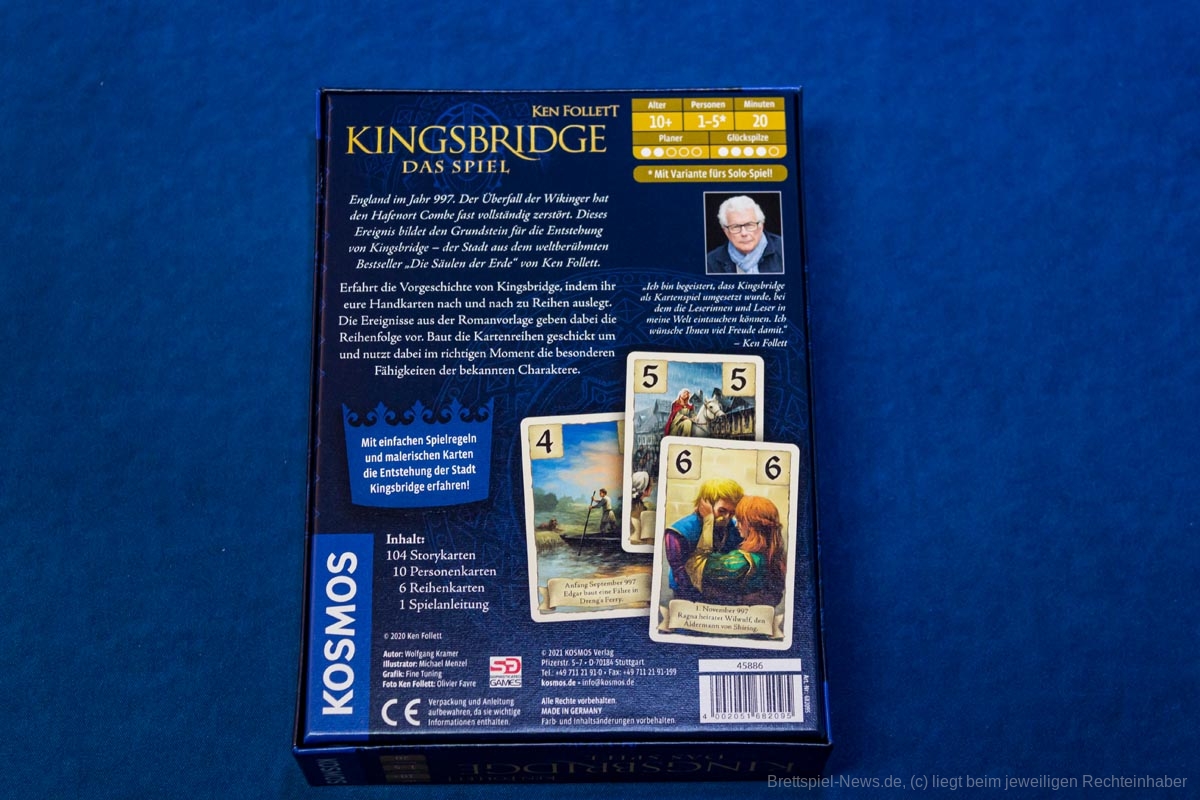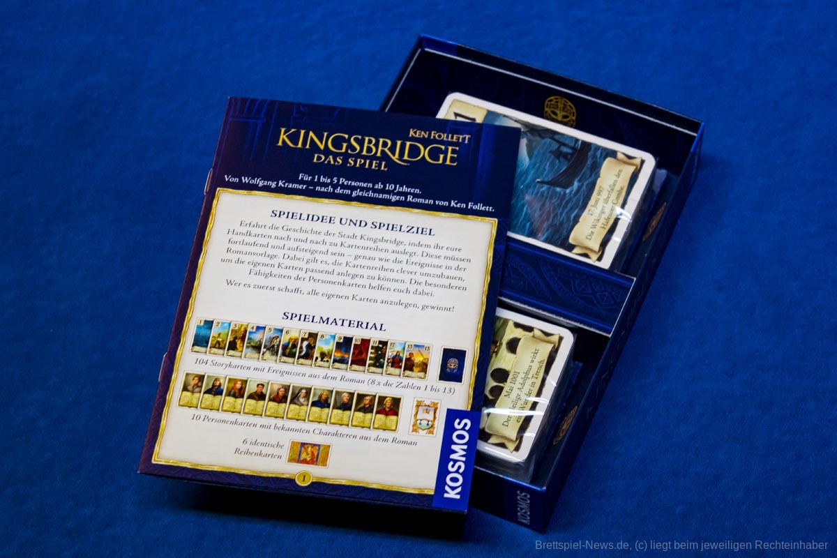 Das Spiel zum Bestseller Roman KINGSBRIDGE von Erfolgsautor KEN FOLLETT wurd beim KOSMOS VERLAG als Kartenspiel nun veröffentlicht. Dieses soll der Geschichte aus dem Roman folgen. Der Verlag verspricht einfache Regeln, die ermöglichen sofort loszuspielen. Der UVP liegt bei 14,99 €.