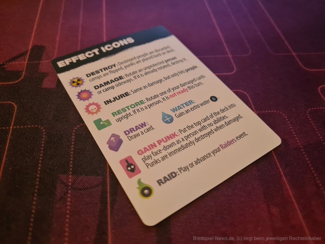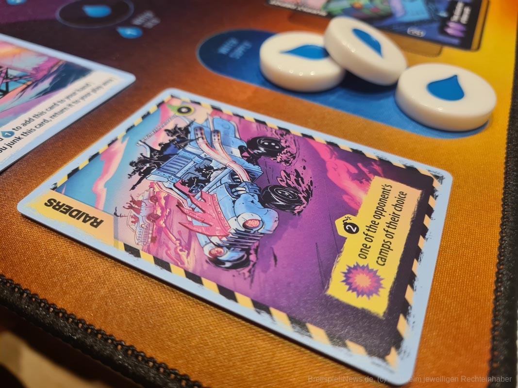 Die wichtigste Ressource in diesem Spiel ist Wasser. Du wirst es brauchen, um Menschen und Ereignisse zu spielen und die Fähigkeiten von Karten zu nutzen, die du bereits auf dem Tisch hast. Personen schützen das Lager und bieten nützliche Fähigkeiten, während Ereignisse mächtige Effekte sind, die sich erst mit der Zeit auszahlen.