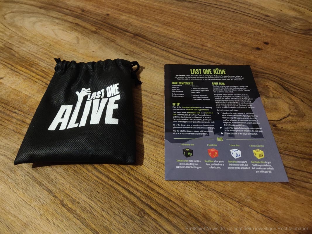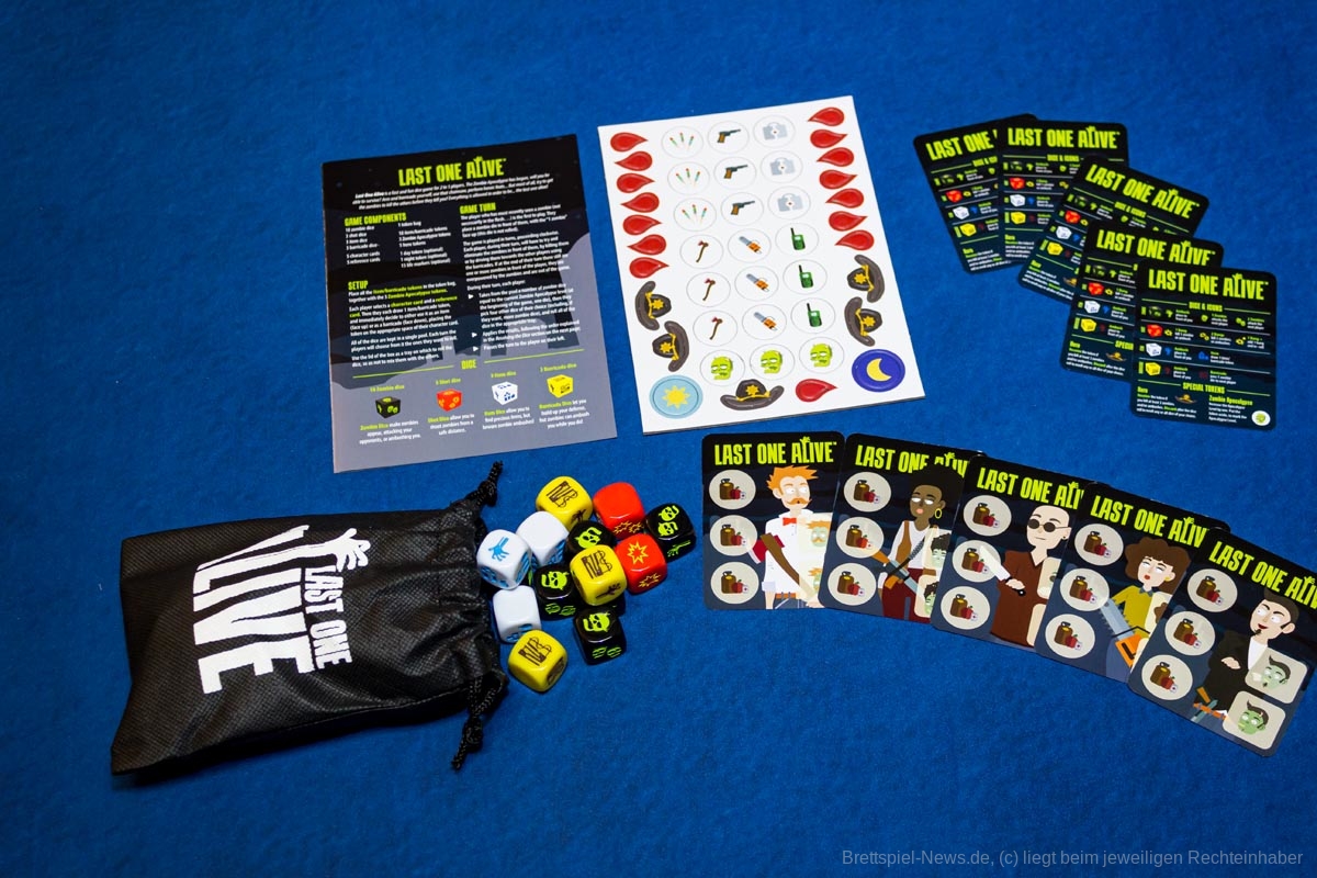Die Zombie-Apokalypse hat begonnen. Wirst du es schaffen, zu überleben? Last One Alive ist ein schnelles und lustiges Würfelspiel für 2-5 Spieler. Bewaffne und verbarrikadiere dich, benutze die Kettensäge, vollbringe Heldentaten... aber vor allem musst du versuchen, die Zombies dazu zu bringen, die anderen zu töten, bevor sie dich töten! Alles ist erlaubt, um der Letzte zu sein, der noch lebt!
