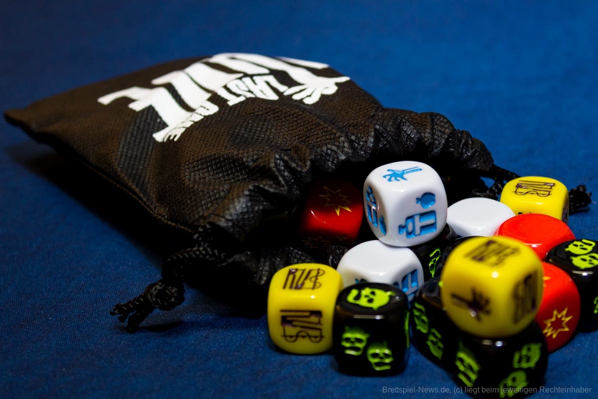 Das von Ole Steiness (Champions of Midgard, Police Precinct) entworfene und von Laura Neri und Francesco Mattioli illustrierte Spiel "Last One Alive" verwendet mehrere verschiedene speziell produzierte Würfel.
