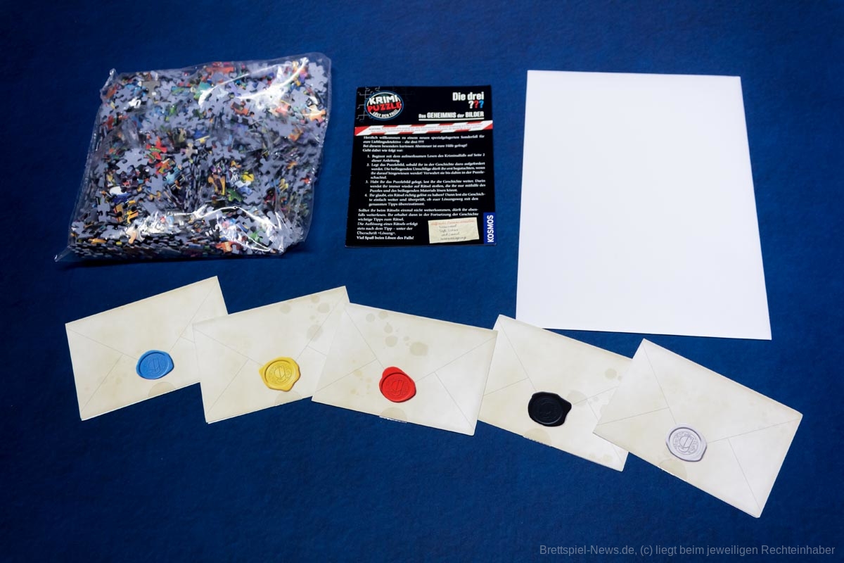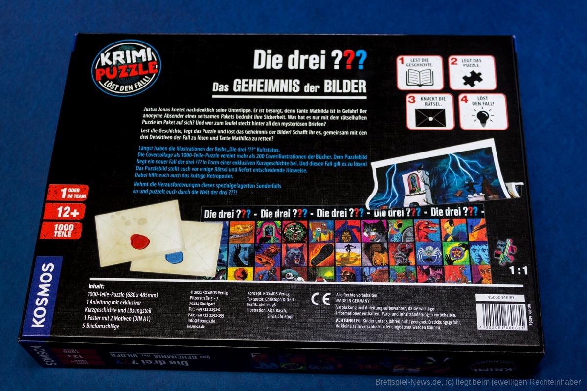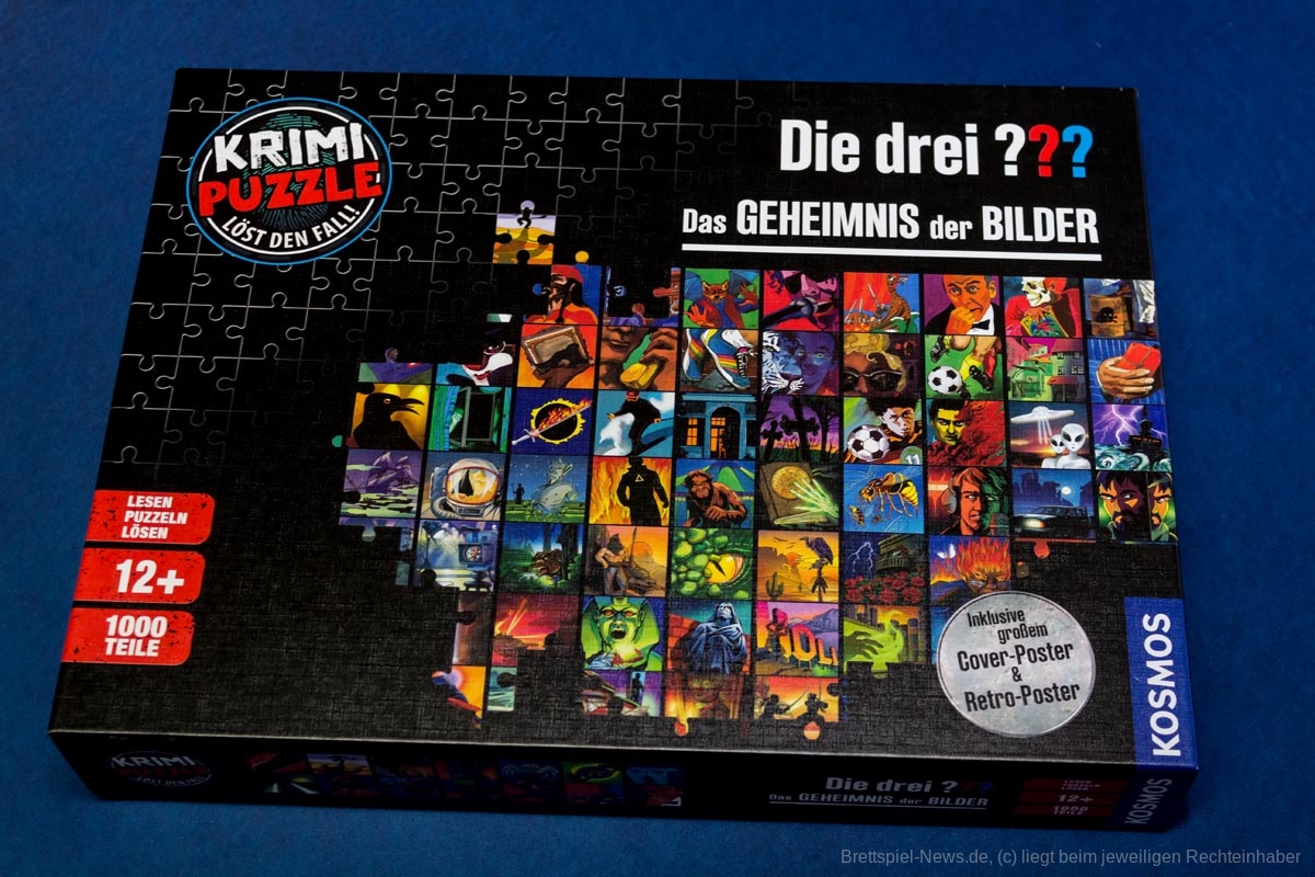 Das „Krimi-Puzzle: Die drei ??? - Das Geheimnis der Bilder“ ist bei Kosmos erschienen. Das Spiel stammt von den Autoren Christoph Dittert & Silvia Christoph. Der Verlag verspricht eine atmosphärisches Puzzleerlebnis mit exklusiver Kurzgeschichte. Das Spiel kombiniert Lesen, Puzzeln und Rätseln.
