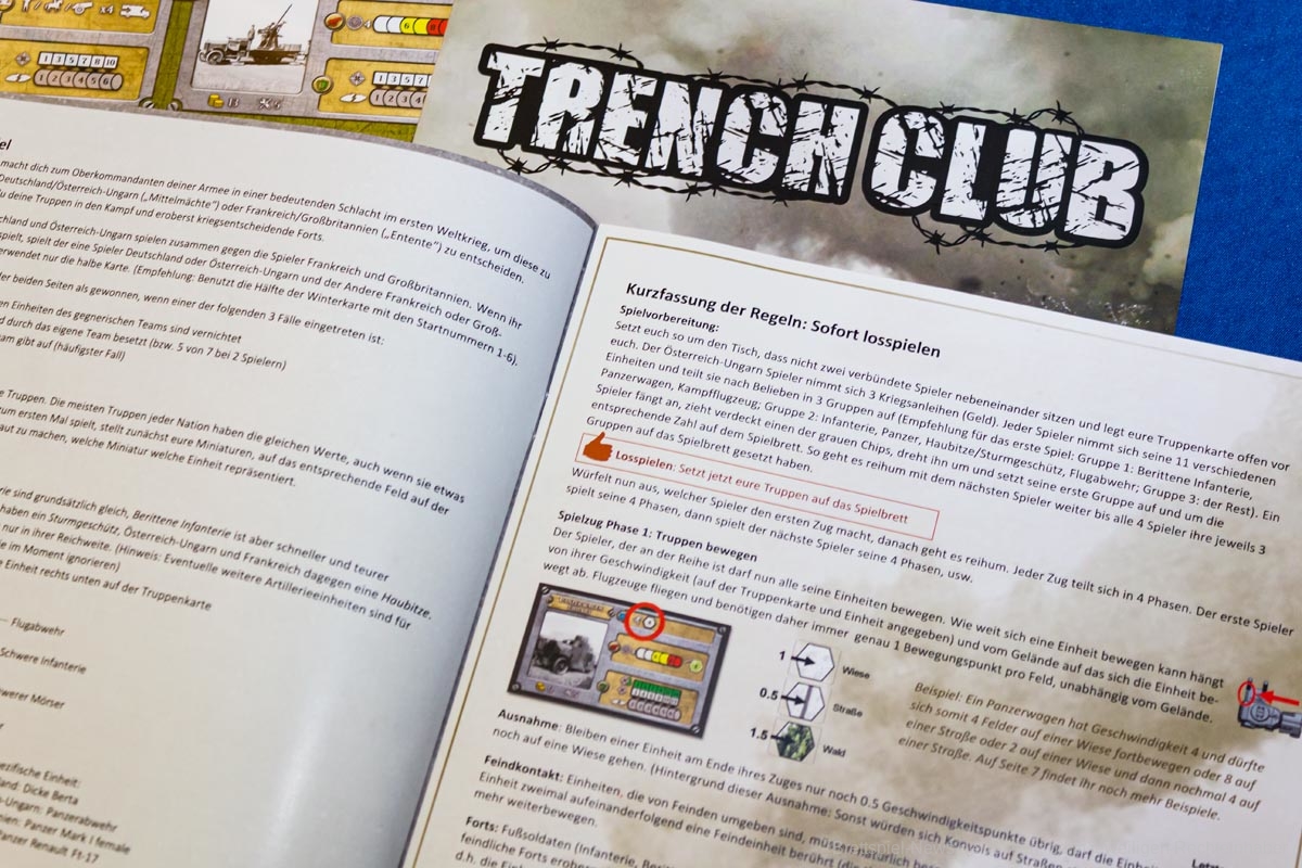 Mit „Trench Club“ ist ein strategisches Brettspiel erschienen, dass im Ersten Weltkrieg platziert ist. Darin können 2-4 Personen gegeneinander oder in Teams Kämpfe austragen, die durch besondere Spielmechaniken abgebildet werden. Zudem ist auch ein Solo-Modus in der Box enthalten.
