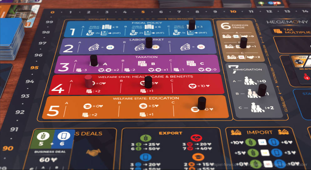 Die Spielenden haben zwar ihre eigenen Ziele, sind aber alle durch eine Reihe von politischen Maßnahmen eingeschränkt, die sich auf die meisten ihrer Aktionen auswirken. Dazu gehören Steuern, der Arbeitsmarkt, Außenhandel usw. Die Abstimmung über diese Politiken und die Nutzung ihres Einflusses, um sie zu ändern, ist zentraler Bestandteil des Spiels.