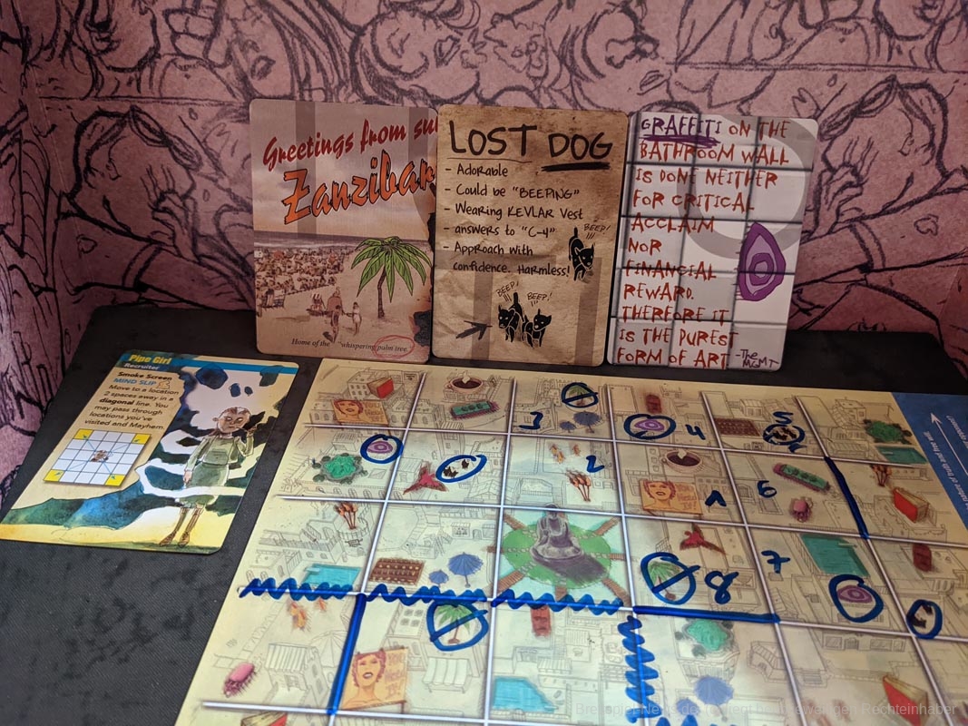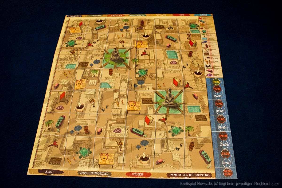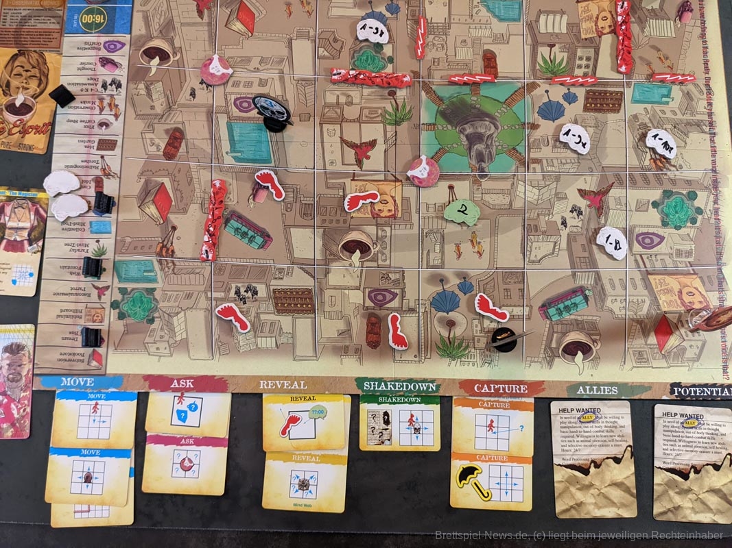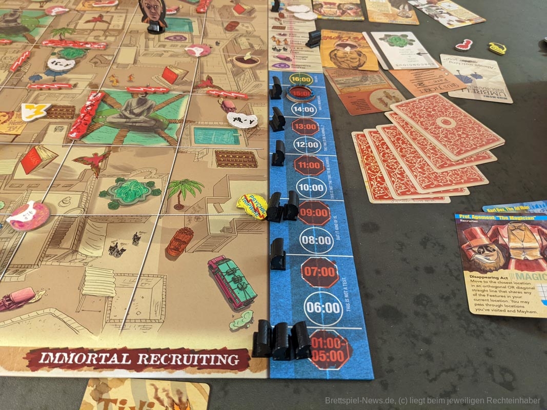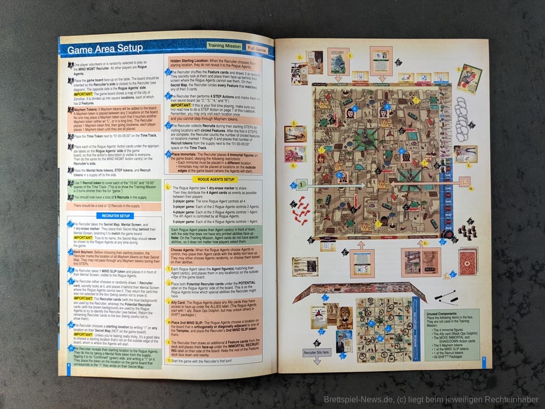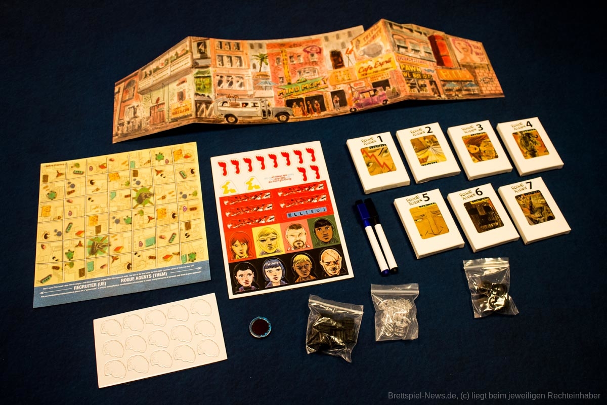 In "Mind MGMT: The Psychic Espionage Game" steuert eine Person Mind MGMT und muss die Stadt nach neuen Personal durchforsten. Sie bewegt sich auf einer geheimen Karte und versucht, Orte zu besuchen, die zu einer ihrer drei zufällig gezogenen Merkmalskarten passen. Mind MGMT kann auch seine vier Unsterblichen einsetzen, um Orte vor der Entdeckung zu schützen.