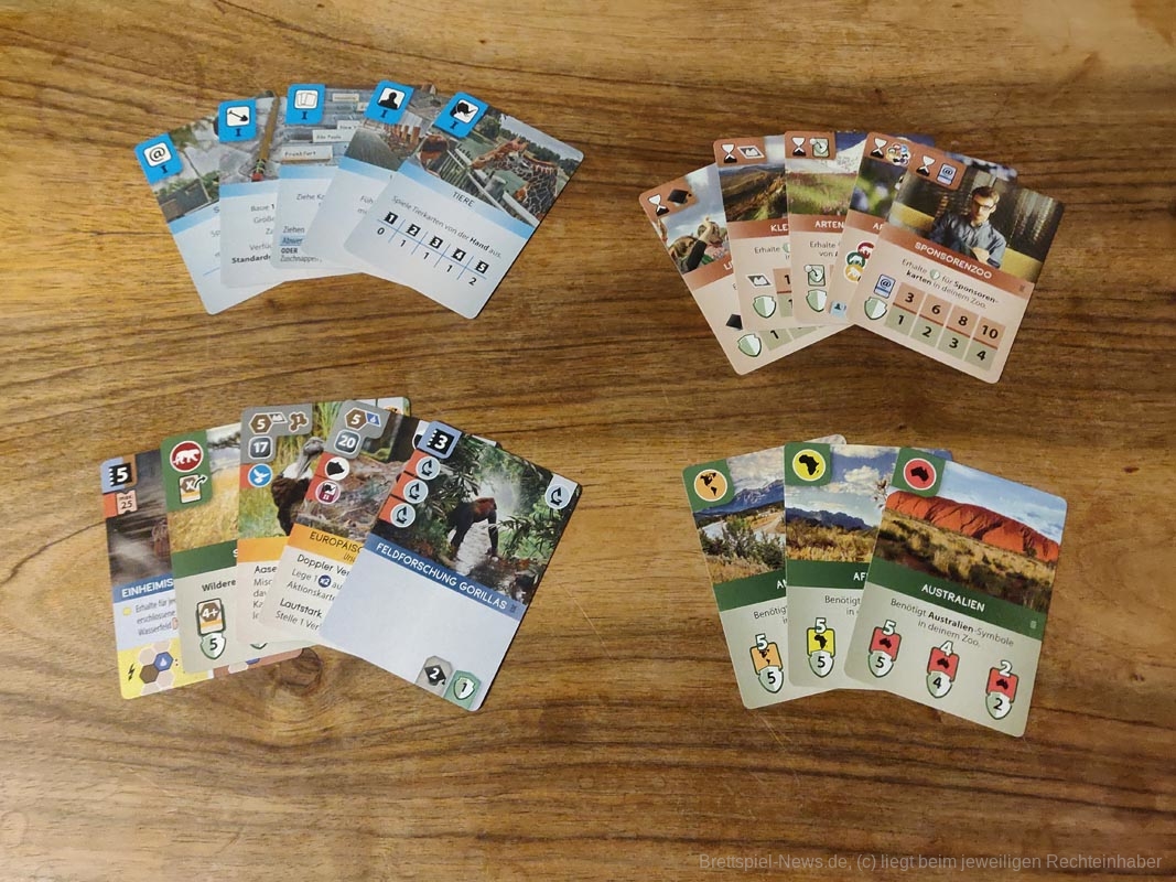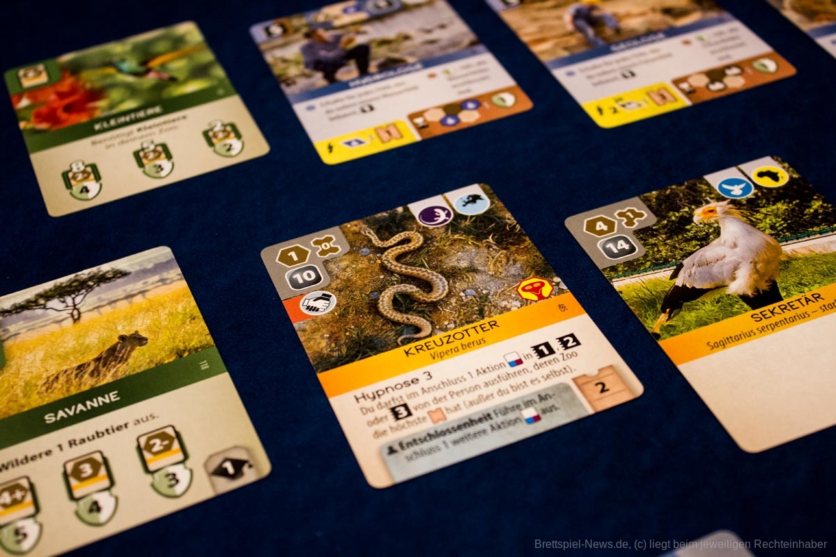 Kern des Spiels sind rund 250 Karten mit Tieren, Spezialisten, Sondergehegen und Artenschutzprojekten, jede mit einer besonderen Fähigkeit. Mit ihnen steigert ihr die Attraktion und den akademischen Ruf eures Zoos und sammelt Artenschutzpunkte. Für die Umsetzung eurer Pläne habt ihr alle je ein Set an Aktionskarten, mit dem ihr euren Spielverlauf steuert.