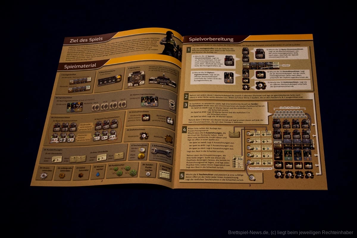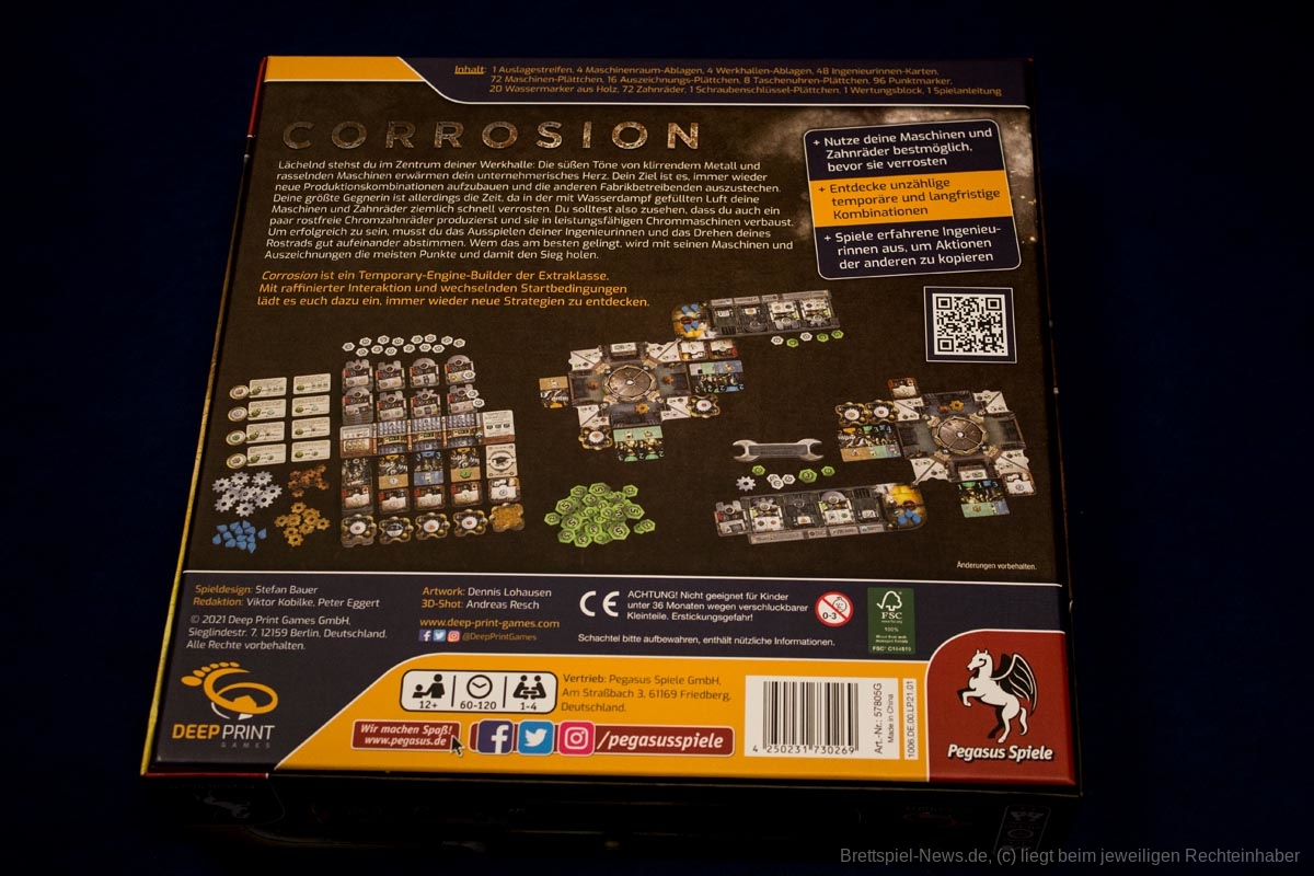 Geräusche von klirrendem Metall und rasselnden Maschinen in der von Wasserdampf erfüllten Luft. Das ist es, was das unternehmerische Herz der Spieler höherschlagen lässt. Bei Corrosion verwalten sie eine alte Fabrik und bauen abwechslungsreiche Produktionskombinationen auf. Ihre größte Bedrohung ist dabei die Zeit, denn Korrosion ist der Feind ihrer Maschinen. Daher ist es auch ihre Aufgabe, rostfreie Chromzahnräder für leistungsfähige Chrommaschinen zu produzieren. Dazu müssen sie ihre Ingenieurinnen geschickt ausspielen, um neue Maschinen oder Ingenieurinnen zu erhalten, oder sie drehen das Rostrad, um ihre Maschinen zu aktivieren.