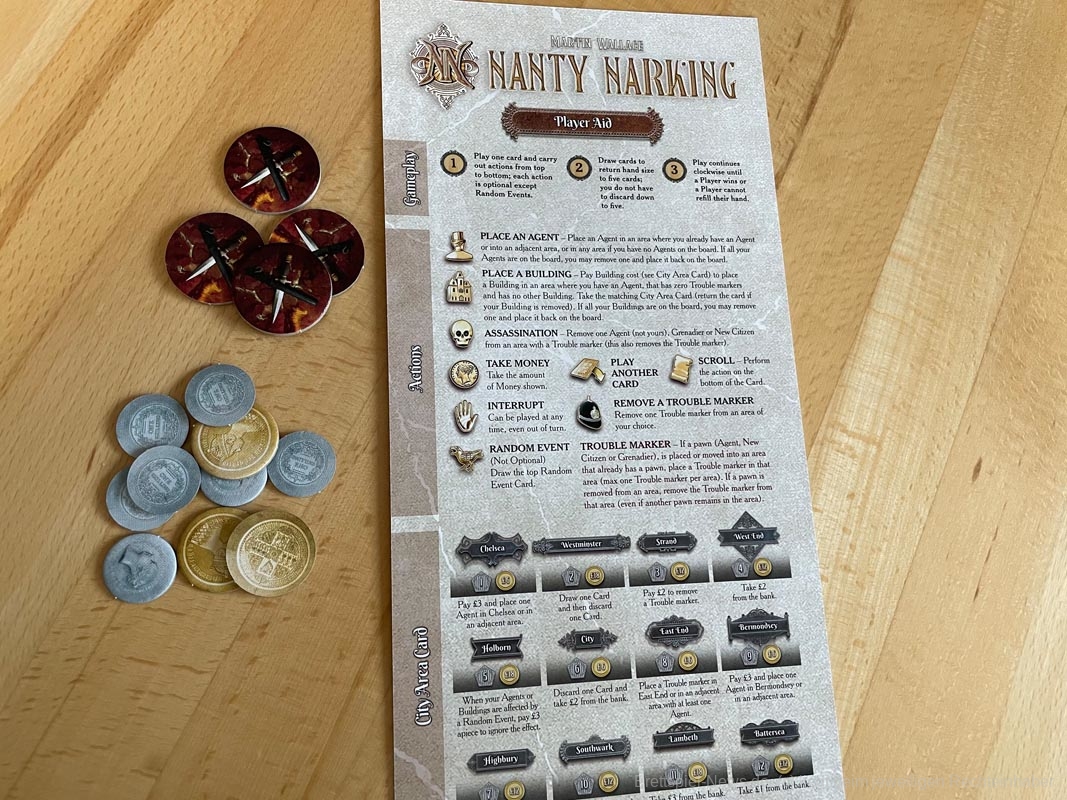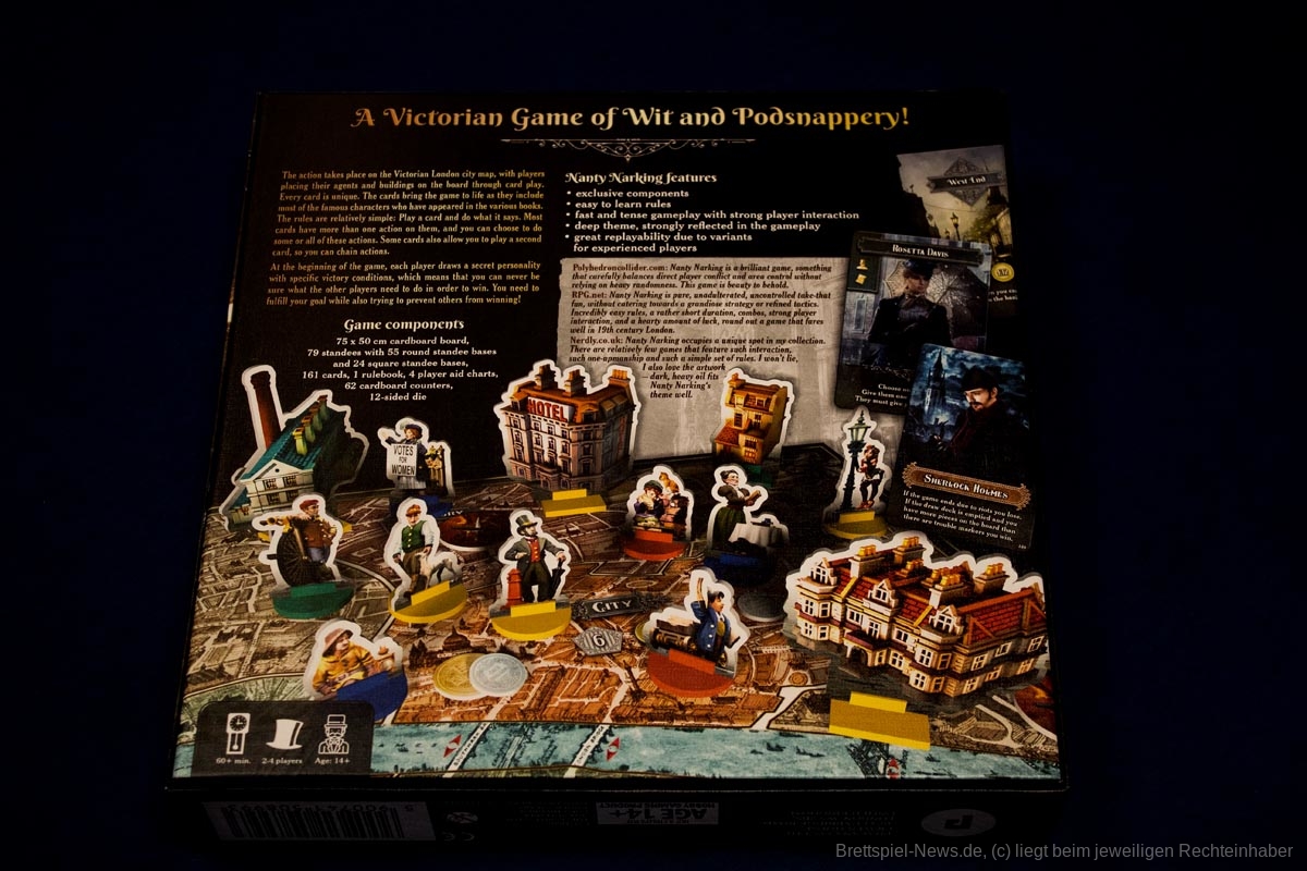 2019 war die Kickstarter Version von „Nanty Narking“ erschienen, jetzt ist eine deutsche Retail Version bei Phalanx erschienen. Das Spiel soll eine Mischung aus Realität und Mythen des viktorianischen Zeitalters bieten. Es lässt sich von 2-4 Personen spielen und bietet eine Spielzeit von ca. 60 Minuten. Spieltechnisch basiert das Spiel auf „Discworld: Ankh-Morpork“ aus dem Jahr 2011.