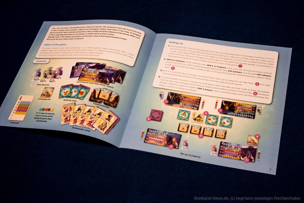 Jedes Jahr ziehen die Vögel des Mittelmeers nach Zerzura. In dieser geheimnisvollen Oase findet auch von Zeit zu Zeit ein Markt statt, auf dem fantastische Gegenstände getauscht werden. Die Händler treffen sich dort in der Hoffnung, ihrer Kundschaft und Gönnern Wunderwerke mitzubringen. Die Vögel von Zerzura gelten als heilig. Wenn einer dieser Zugvögel auf einer Ware landet, wird kein Händler versuchen, ihn zu vertreiben. Obwohl viele der Gegenstände Ruhm und Reichtum versprechen, halten einige von ihnen Überraschungen bereit. Wirst du der cleverste Handelnde in Zerzura sein?