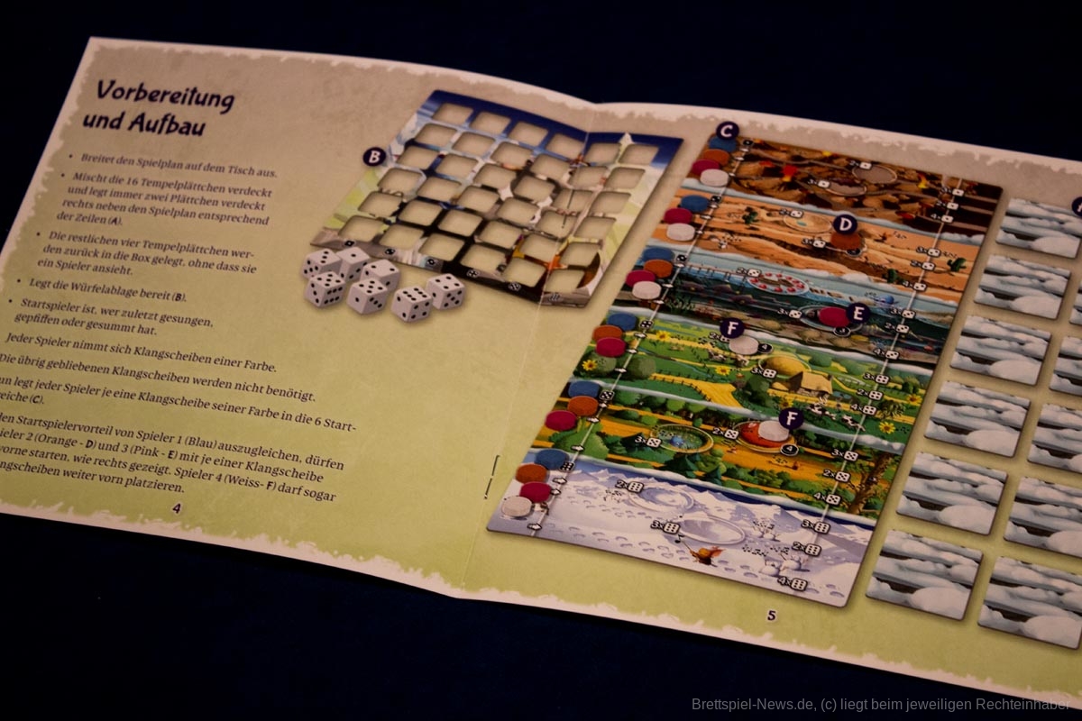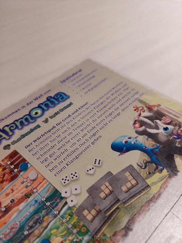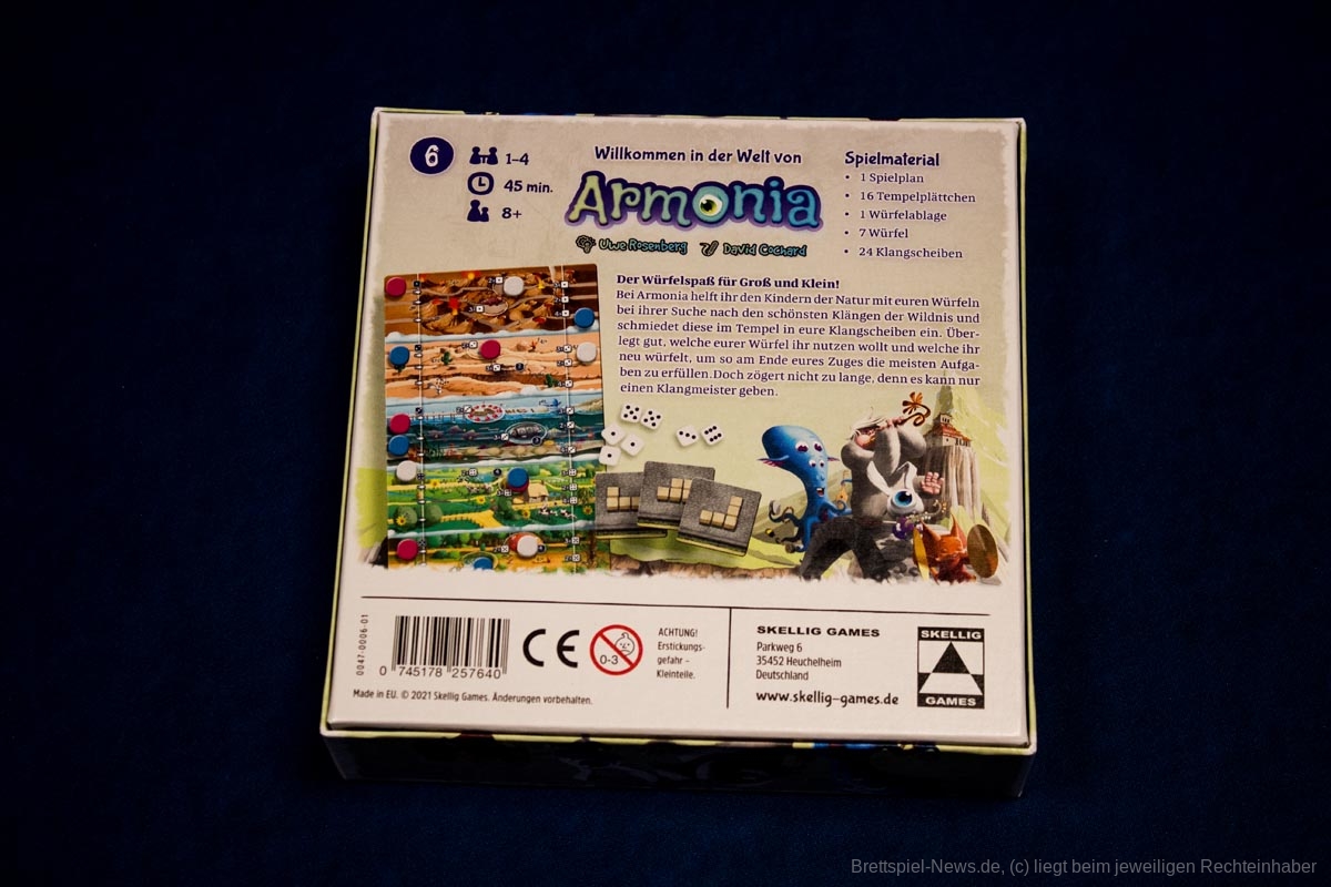 „Armonia“ ist ein Würfelspiel für jung und alt, in dem alle in jedem Zug bis zu dreimal würfeln, um ihre Klangscheiben auf dem Weg zum Wolkentempel zu bewegen. Mit den Würfelergebnissen können aber nicht nur die Klangscheiben bewegt, sondern auch Aufgaben ausgelöst und erfüllt werden. Was davon den größten Vorteil bringt, gilt es in jeder Spielsituation neu zu entscheiden. Wer die besten Entscheidungen trifft, wird zuerst vier der sechs Klangplättchen auf die fertigen Tempelplattensätze schmieden und so das Spiel gewinnen.