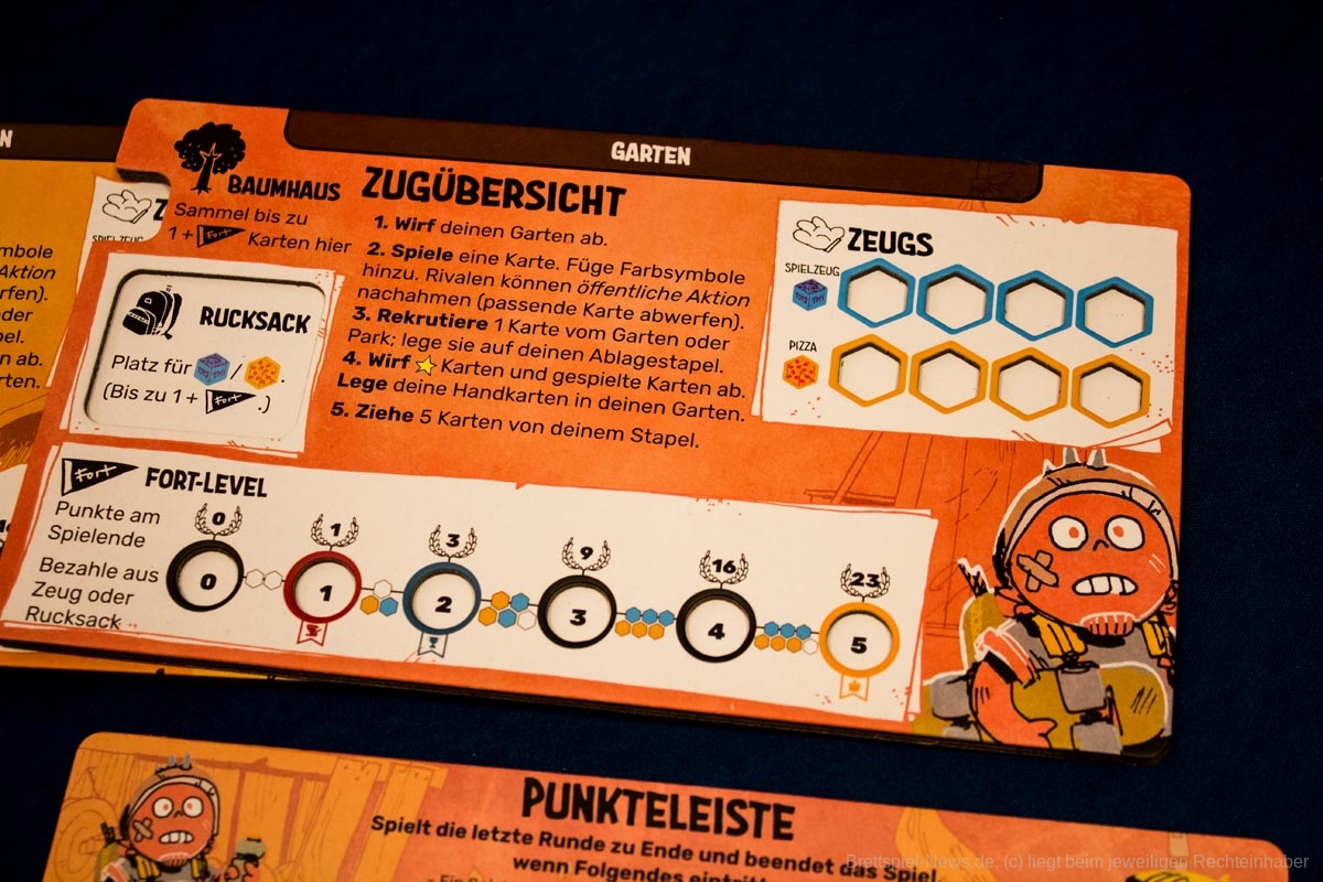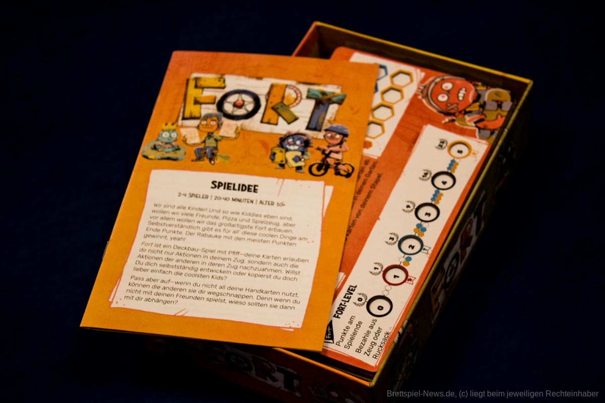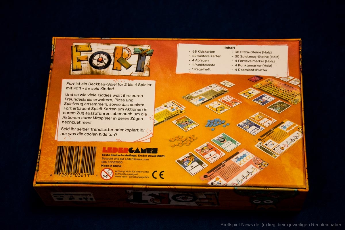 Im Deck-Building-Spiel "Fort" dürft ihr endlich wieder Kind sein. Mit euren Mitspielern und -spielerinnen liefert ihr euch einen Wettstreit um das beste "Fort". Siegpunkte sammelt ihr, indem ihr euren Freundeskreis erweitert, euch Spielzeug und Pizza schnappt und eure Festung verbessert. Durch das Ziehen und Ausspielen von Karten führt ihr Aktionen aus. Die Karten können aber nicht nur im eigenen, sondern auch im gegnerischen Zug verwendet werden, um die Aktionen der anderen nachzuahmen und das Spiel zu seinen eigenen Gunsten zu beeinflussen. Zudem müsst ihr aufpassen, dass ihr wichtige Karten spielt, bevor andere diese klauen. Da ist vorausschauende Planung gefragt. Wer sein "Fort" zuerst auf Stufe fünf aufwertet, erhält die Makkaroni-Skulptur und ist dem Sieg schon zum Greifen nahe.