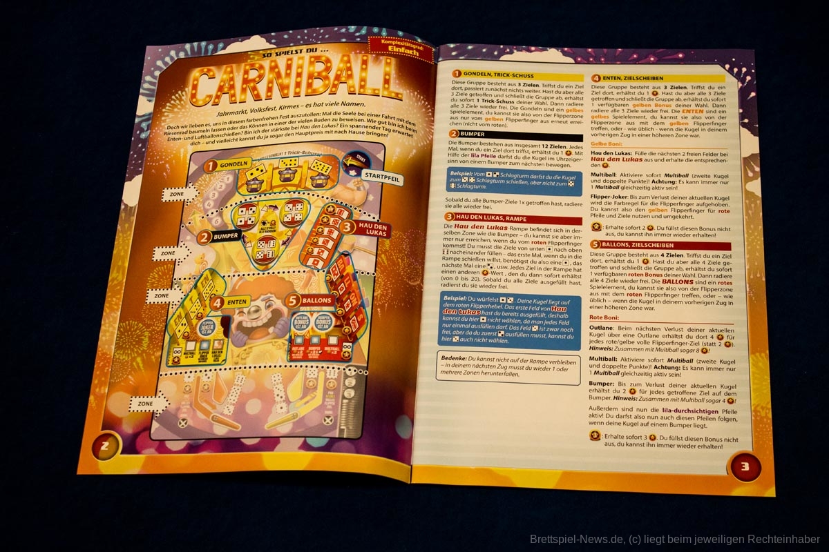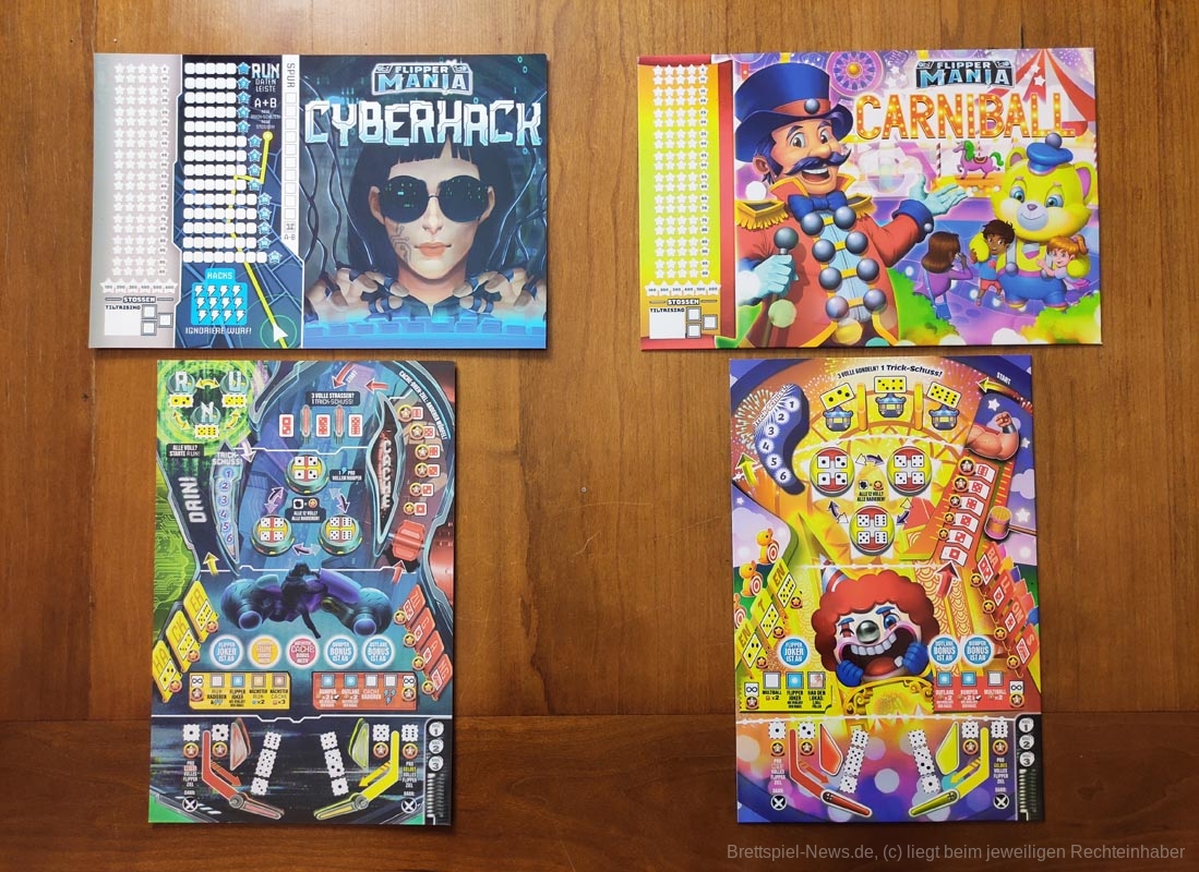Die Mitspielenden jonglieren den Ball zwischen den Bumpern, treffen Drop Targets, schalten Skill Shots frei, aktivieren den Multiball und spielen nebenher sogar einige Minispiele auf dem Backglass. Der Ball ist fast raus? Da kann es manchmal helfen, den Tisch ein bisschen „anzustupsen“, aber nur nicht zu sehr kippen! Ob alleine auf der Jagd nach dem nächsten Highscore oder simultan mit mehreren, wobei alle die gleichen Würfel und Automaten zur Verfügung haben – „Flippermania“ verspricht ein sehr thematisches Roll&Write . Die vier verschiedenen Spielpläne bringen dabei jeweils eigene Herausforderungen und Boni mit sich.