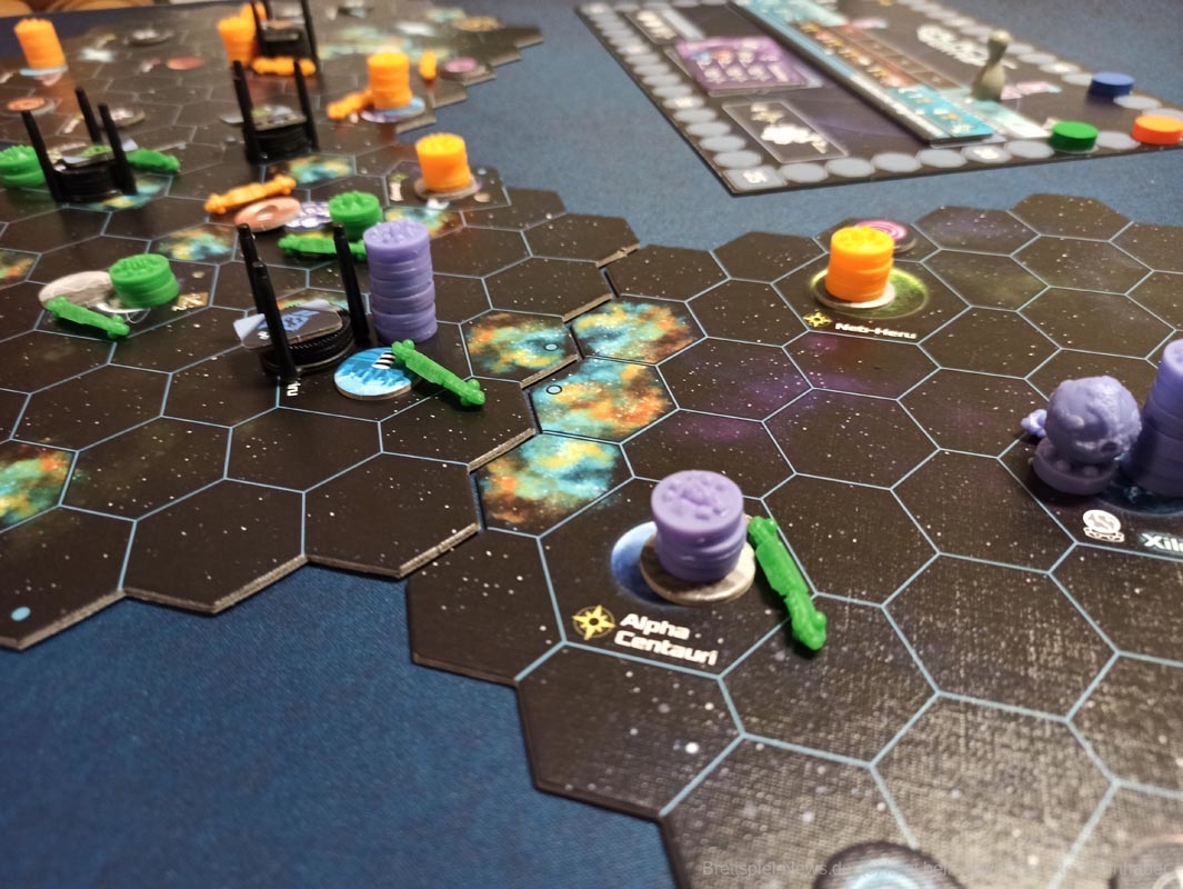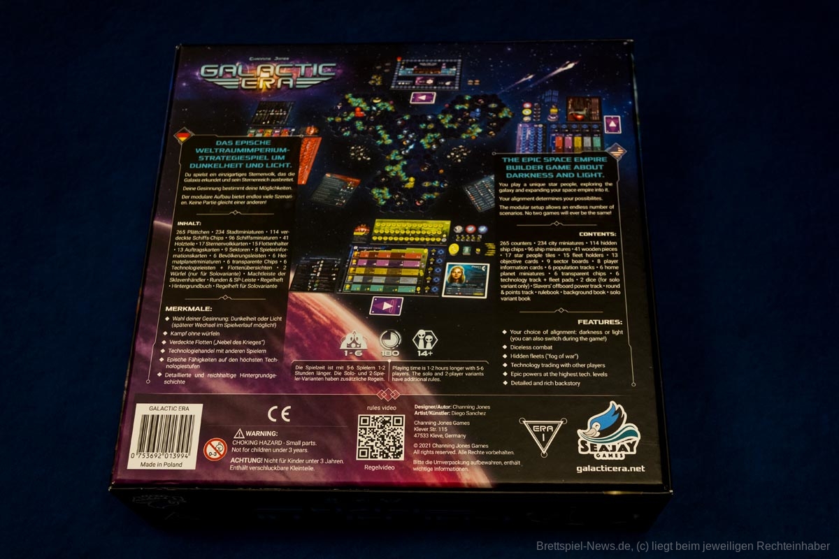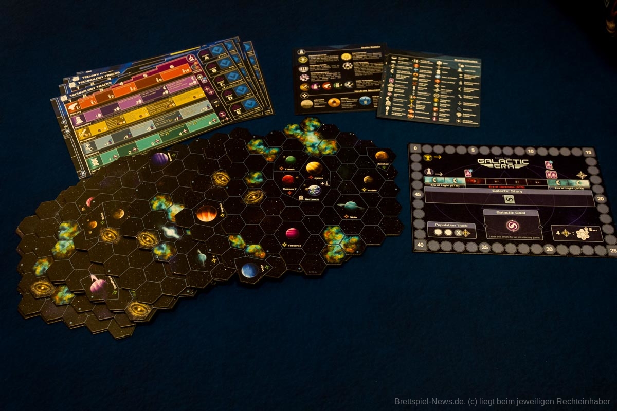 „Galactic Era“ lässt sich von 1-6 Personen spielen, die Spielzeit wird mit 180 Minuten angegeben. Es hat umfangreiches Spielmaterial in einer ordentlichen Produktionsqualität und wird in einer großen Box ausgeliefert.
