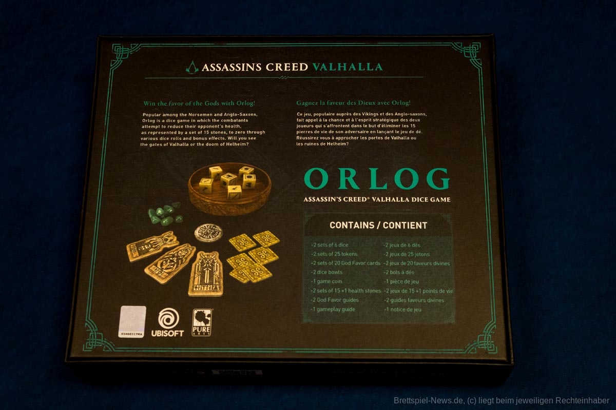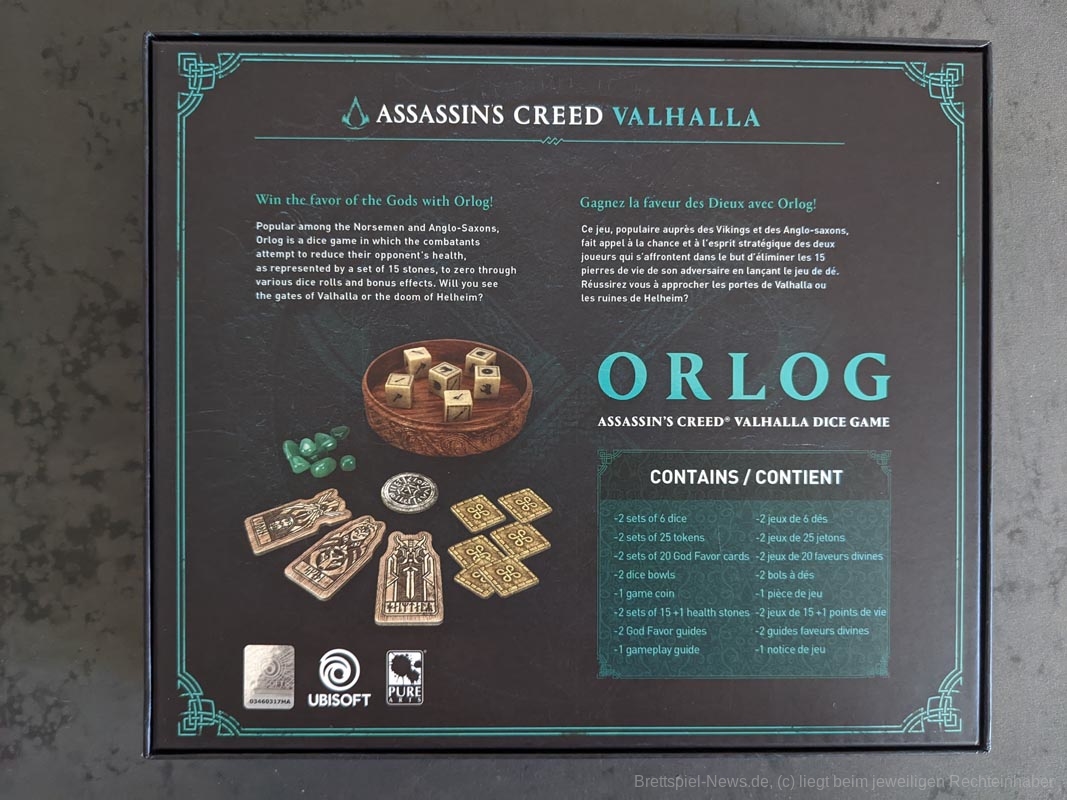 PureArts und Ubisoft präsentieren das offiziell lizenzierte Orlog-Würfelspiel aus "Assassin's Creed Valhalla! Orlog" wurde von den Nordmännern und Angelsachsen in jeder Stadt des Videospiels ausgiebig gespielt und wird von zwei Spielern gespielt, die Würfelwürfe und Bonuseffekte nutzen, um den Sieg über ihren Gegner zu erringen.