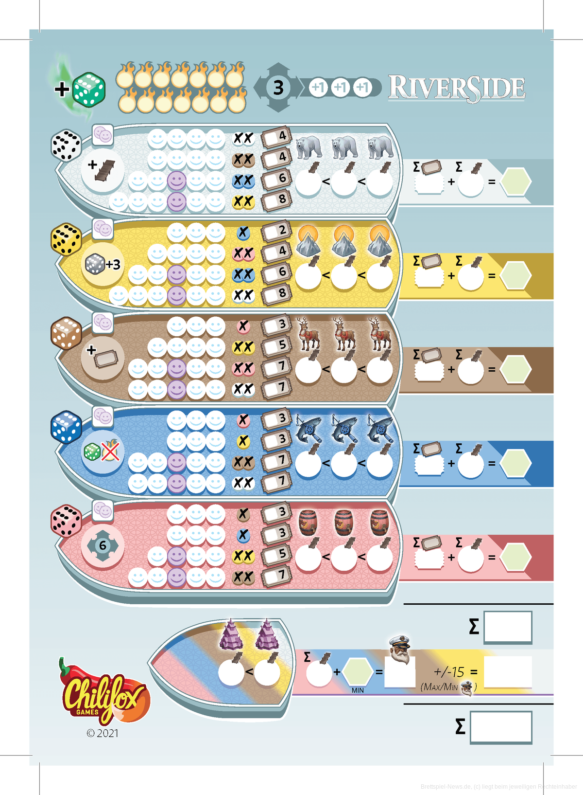 In der vergangenen Woche startete die Kampagne für die deutsche Version von Riverside vom neuen Verlag Chilifox Games. In dem etwas anderen Roll&Write von Asmund Svensson und Eilif Svennson (Santa Maria, Trails of Tucana) versuchen 1-6 Personen als Reiseführende ihre Gäste auf einer Schifffahrt im Schein der Nordlichter möglichst glücklich zu machen. Die Illustrationen stammen von Gjermund Bohne (Santa Maria, Avenue) und die Spielzeit soll etwa 15-25 Minuten betragen.