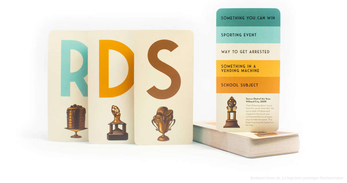 Bei diesem Spiel hält der Richter oder die Richterin den Stapel, liest ein Thema von der hinteren Karte vor und zeigt der Gruppe einen zufälligen Buchstaben auf der vorderen Karte. Wer als Erster ein Wort sagt, das mit dem Thema und dem Buchstaben übereinstimmt, gewinnt eine Trophäenkarte! Die Person mit den meisten Trophäen gewinnt das Spiel und darf die kleine Metalltrophäe im Triumph hoch über seinen Kopf heben! Die Person, die "ihr Bestes gegeben" hat, erhält eine Teilnahme-Trophäe. Das war's schon!