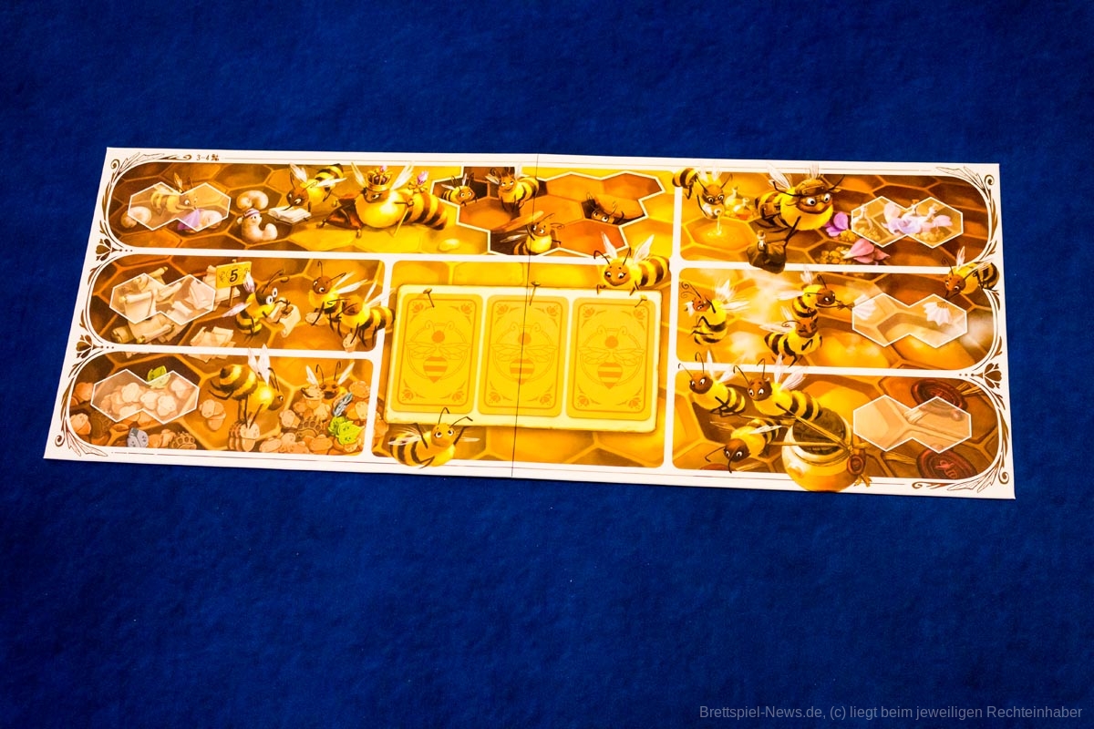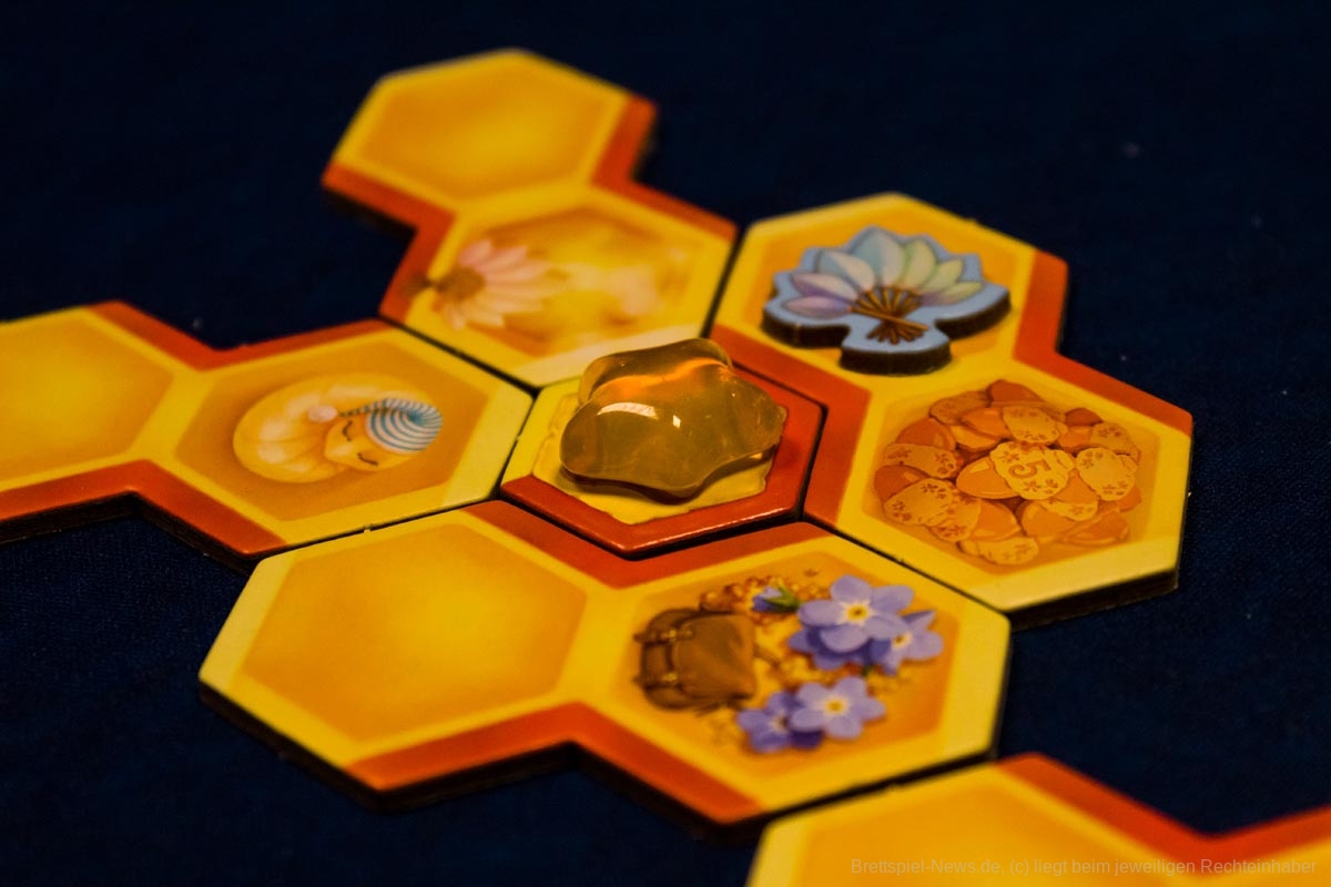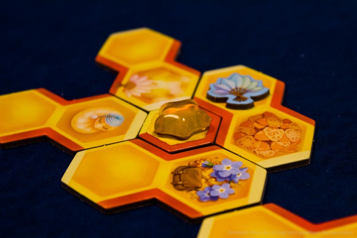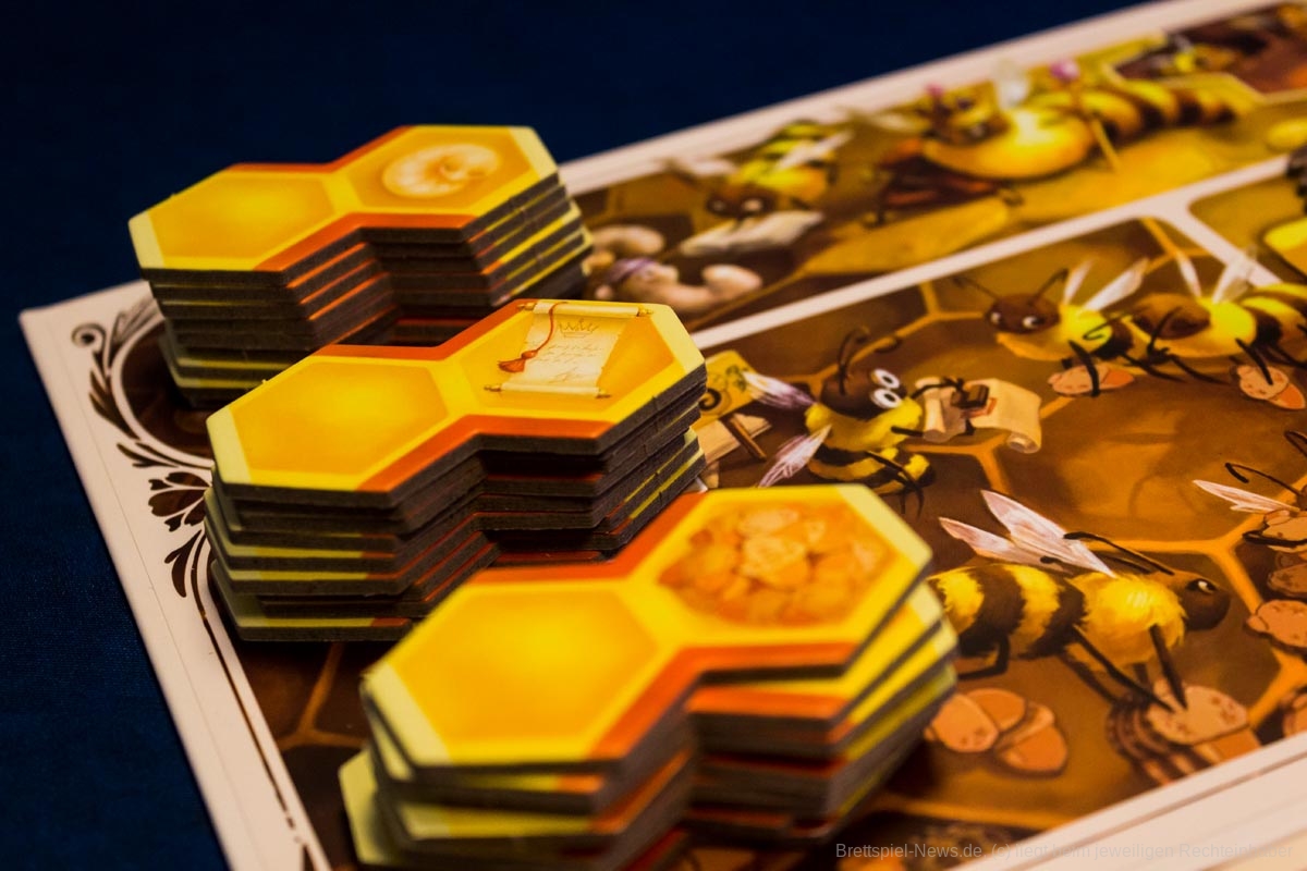 „Honey Buzz“ ist ein Workerplacement-Spiel, bei dem ihr euren persönlichen Bienenstock ausbaut. Dazu zieht ihr verschiedene Wabenplättchen, die Aktionen ermöglichen, die im Laufe des Spiels ausgelöst werden. Jedes Plättchen steht für eine andere Aktion. Immer wenn ein Plättchen so gelegt wird, dass es ein bestimmtes Muster vervollständigt, wird eine Reihe von Aktionen ausgelöst und zwar in der Reihenfolge, die ihr wählt. Ein Plättchen, das in der ersten Runde gezogen wird, kann bis zu drei Mal im Laufe des Spiels ausgelöst werden. Alles hängt davon ab, wie ihr eure Bienen platziert und den Bienenstock aufbaut. Denn im Honiggeschäft sind effiziente Prozesse das A und O.