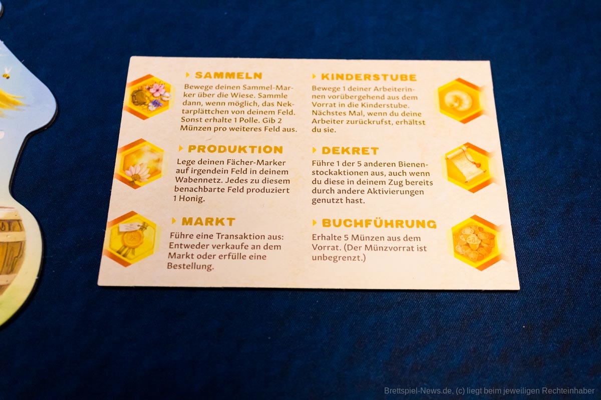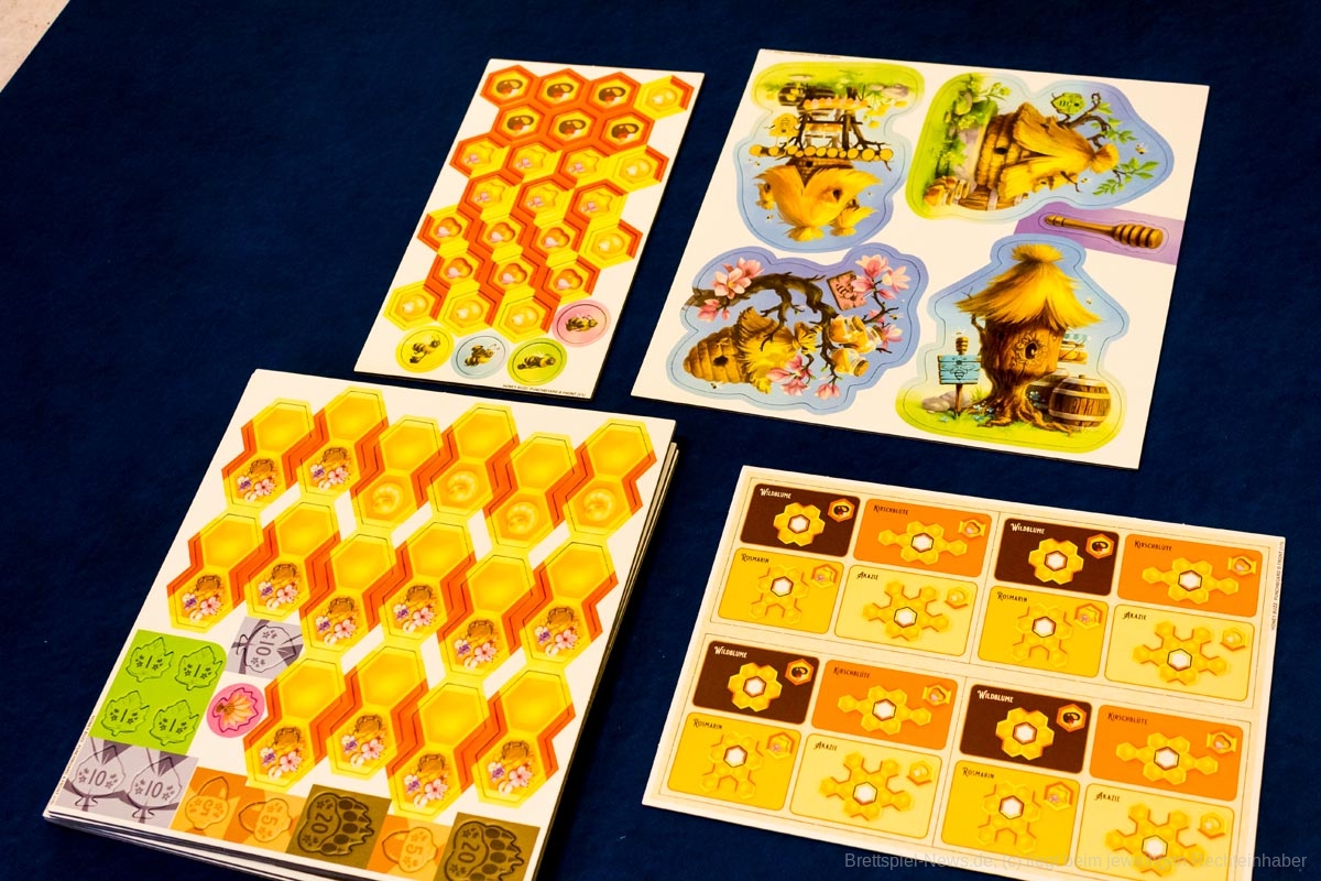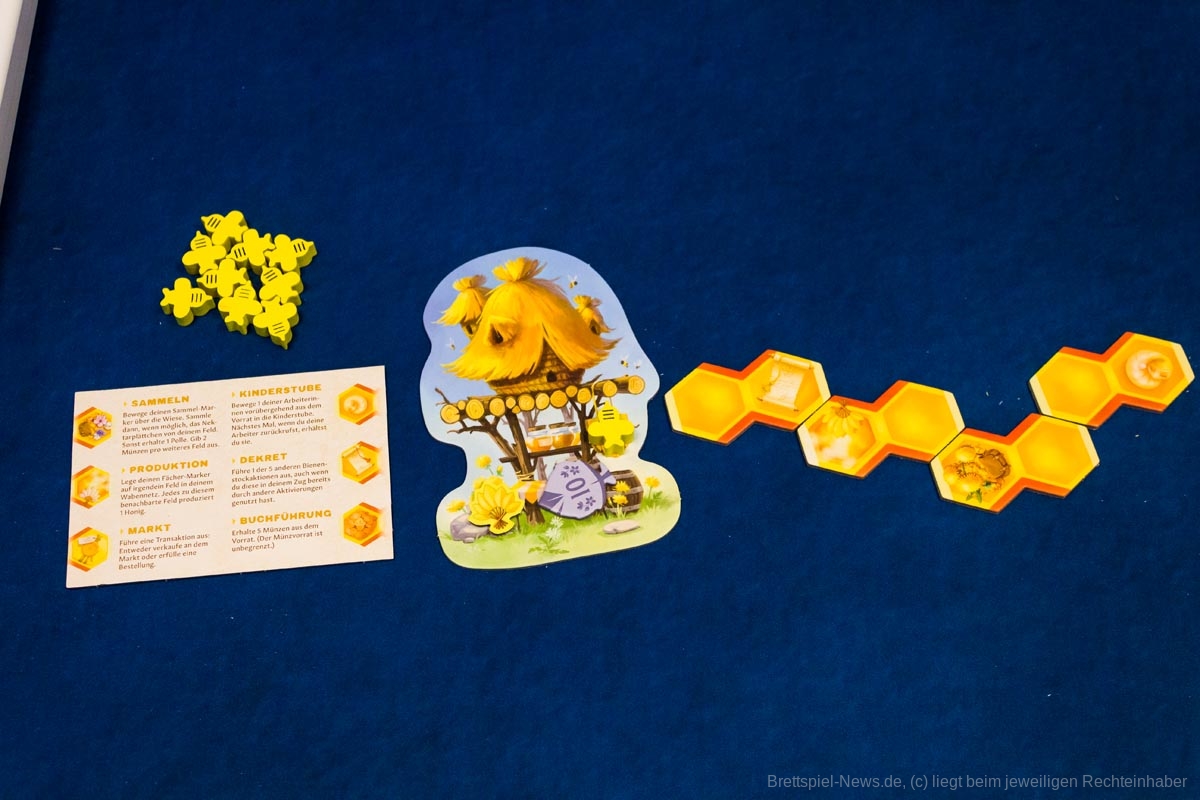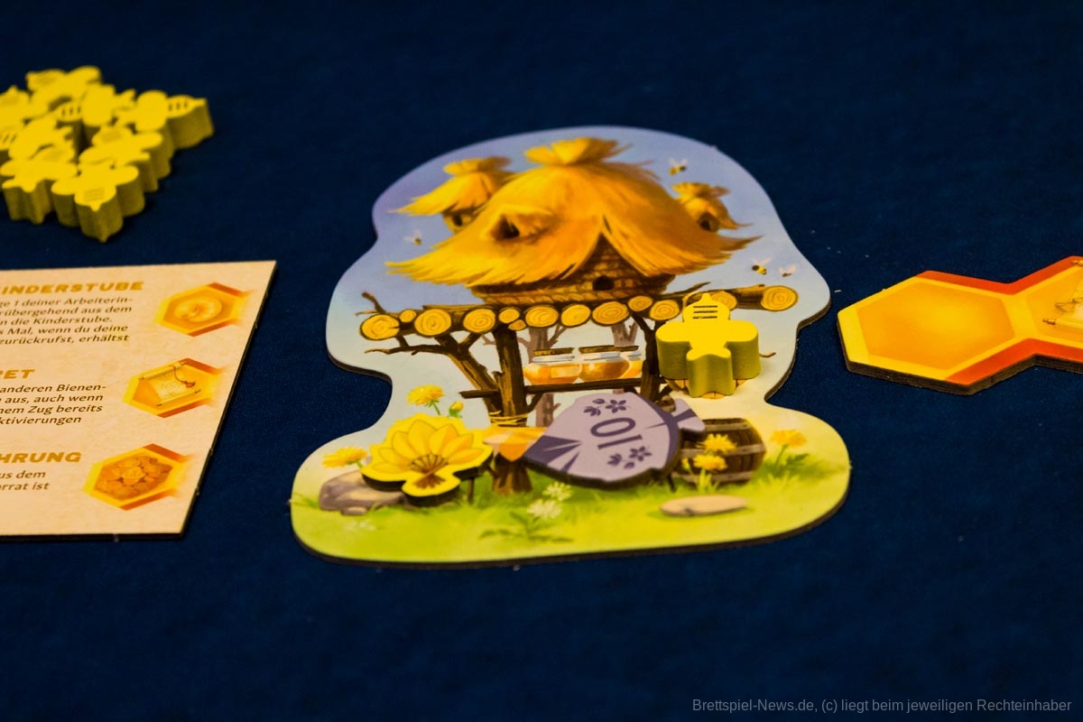 „Honey Buzz“ ist ein Workerplacement-Spiel, bei dem ihr euren persönlichen Bienenstock ausbaut. Dazu zieht ihr verschiedene Wabenplättchen, die Aktionen ermöglichen, die im Laufe des Spiels ausgelöst werden. Jedes Plättchen steht für eine andere Aktion. Immer wenn ein Plättchen so gelegt wird, dass es ein bestimmtes Muster vervollständigt, wird eine Reihe von Aktionen ausgelöst und zwar in der Reihenfolge, die ihr wählt. Ein Plättchen, das in der ersten Runde gezogen wird, kann bis zu drei Mal im Laufe des Spiels ausgelöst werden. Alles hängt davon ab, wie ihr eure Bienen platziert und den Bienenstock aufbaut. Denn im Honiggeschäft sind effiziente Prozesse das A und O.